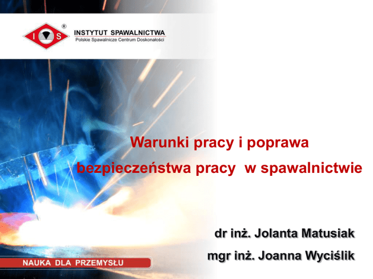 Warunki pracy i poprawa bezpieczeństwa pracy w spawalnictwie dr inż. Jolanta Matusiak mgr inż. Joanna Wyciślik Program Wieloletni pn. „Poprawa bezpieczeństwa i warunków pracy" etap II / 2011-2013 System ochrony pracy: system środków prawnych, ekonomicznych, organizacyjnych i technicznych, służących zapewnieniu pracownikom bezpieczeństwa i ochrony zdrowia w procesie pracy [1] System środków prawnych System środków ekonomicznych SYSTEM OCHRONY PRACY System środków technicznych: - normalizacja - system badań i certyfikacji [1].W. Szubert: Ochrona pracy. Studium społeczno-prawne. Warszawa 1966. System środków organizacyjnych: - edukacja, szkolenie -nauka, badania -ubezpieczenia Program Wieloletni pn. „Poprawa bezpieczeństwa i warunków pracy" etap II / 2011-2013 BEZPIECZEŃSTWO I HIGIENA PRACY BEZPIECZEŃSTWO I HIGIENA PRACY – ogół norm prawnych oraz środków badawczych, organizacyjnych i technicznych mających na celu stworzenie pracownikowi takich warunków pracy, aby mógł on wykonywać pracę w sposób produktywny, bez narażania go na nieuzasadnione ryzyko wypadku lub choroby zawodowej oraz nadmierne obciążenie fizyczne i psychiczne.[2] Ochrona pracy przy pracach na stanowiskach spawalniczych jest związana z: powszechnym stosowaniem spawania i procesów pokrewnych w różnych gałęziach przemysłu rozwojem technologii spawalniczych [2] J. Kowalski: Podstawy prawne ochrony pracy w Polsce. W: Bezpieczeństwo pracy i ergonomia., Red. nauk. D. Koradecka. Warszawa, CIOP 1999, s. 643. Program Wieloletni pn. „Poprawa bezpieczeństwa i warunków pracy" etap II / 2011-2013 W Polsce ponad 100 branży przemysłowych związanych jest ze spawalnictwem W procesie produkcji technologie spawalnicze wykorzystuje od 6,5 do 7 tys. przedsiębiorstw Polska w Europie pod względem wielkości produkcji konstrukcji stalowych zajmuje II miejsce; W 2010 roku – wyprodukowano 1,35 mln ton [3] W Polsce w spawalnictwie pracuje około 130 -150 tys. osób; spawacze ok. 60-80 tys. osób [3] [3] Pilarczyk J., Zeman W.: Spawalnictwo dziś i jutro. Biuletyn Instytut Spawalnictwa 5/2012 Program Wieloletni pn. „Poprawa bezpieczeństwa i warunków pracy" etap II / 2011-2013 Zagrożenia bezpieczeństwa i higieny pracy przy spawaniu i procesach pokrewnych Zagrożenia chemiczne i pyłowe Dym spawalniczy Zagrożenia fizyczne Zagrożenie urazami mechanicznymi Hałas Promieniowanie optyczne Promieniowanie laserowe Pola elektromagnetyczne Zagrożenie prądem elektrycznym Zagrożenie pożarem Zagrożenie wybuchem Czynniki kształtujące środowisko pracy: Mikroklimat Ergonomia stanowiska pracy Program Wieloletni pn. „Poprawa bezpieczeństwa i warunków pracy" etap II / 2011-2013 Zanieczyszczenia pyłowe i gazowe wydzielających się przy spawaniu i procesach pokrewnych Dym spawalniczy (aerozol dwufazowy kondensacyjny) - konwekcyjny strumień zanieczyszczeń. Mieszanina wysoko i średnio dyspersyjnych cząstek stałych (pyłu spawalniczego) oraz substancji chemicznych (gazów). Pył spawalniczy - składa się z prostych i złożonych tlenków, krzemianów, fluorokrzemianów, fluorków oraz węglanów metali i niemetali. Nowe terminy: dym zgrzewalniczy, dym z cięcia termicznego, dym z lutowania / lutospawania Program Wieloletni pn. „Poprawa bezpieczeństwa i warunków pracy" etap II / 2011-2013 Proces spajania Metoda/ Technologia Konstrukcja / rodzaj wyrobu Powierzchnia blachy/ zanieczyszczenia /powlekana Materiał dodatkowy - rodzaj drutu - rodzaj otulina/ rodzaj wypełnienia drutu Dym spawalniczy/ zgrzewalniczy Dym z cięcia/ lutowania/ lutospawania Parametry technologiczne Materiał podstawowy Materiały pomocnicze - gaz osłonowy Program Wieloletni pn. „Poprawa bezpieczeństwa i warunków pracy" etap II / 2011-2013 Program Wieloletni pn. „Poprawa bezpieczeństwa i warunków pracy" etap II / 2011-2013 Pył spawalniczy Pył o wymiarze cząstek poniżej 1 m nazywany jest pyłem respirabilnym i podlega głównie ruchom Browna, tj. nieregularnym ruchom po liniach zygzakowatych. Cząstki frakcji respirabilnej (pęcherzykowej) pyłu przenikają do dróg oddechowych niepokrytych nabłonkiem migawkowym. Cząstki pyłu spawalniczego mają kształt zbliżony do kształtu kulistego i występują w postaci bardzo drobnych cząstek pojedynczych oraz w postaci łańcuchów i aglomeratów. W skład dymu spawalniczego wchodzą również frakcje pyłu drobnoziarnistego o cząstkach, których wymiary przekraczają 1m, jest to pył opadający. Cząstki pyłu osiadają pod wpływem swojego ciężaru, ale mogą przez pewien czas pozostawać w zawieszeniu (podlegają głównie siłom grawitacji i bezwładności). Program Wieloletni pn. „Poprawa bezpieczeństwa i warunków pracy" etap II / 2011-2013 Pył spawalniczy Pył ze spawania metodą MAG stali niestopowej drutem G3Si1 ø 1,2 mm Gaz osłonowy: Ar+CO2 Program Wieloletni pn. „Poprawa bezpieczeństwa i warunków pracy" etap II / 2011-2013 Obraz z analizy mikroskopowej pyłu powstającego przy spawaniu stopu Al-Mg Program Wieloletni pn. „Poprawa bezpieczeństwa i warunków pracy" etap II / 2011-2013 Skład chemiczny pyłu spawalniczego Spawanie drutami litymi stali niskostopowych Żelazo FeO, Fe2O3, Fe3O4 Mangan MnO2, Mn2O3, Mn3O4, MnO krzemionka Spawanie stali wysokostopowych nierdzewnych Dodatkowo: Chrom: Cr(III) - Cr2O3, FeCr2O4, KCrF4 Cr(VI) - Na2CrO4, K2CrO4,ZnCrO4, CrO3 nikiel - NiO, NiO2, Ni2O3 Spawanie elektrodami otulonymi i drutami proszkowymi Dodatkowo: Związki sodu, potasu, wapnia, magnezu, Fluorki proste i złożone CaF2, KF, NaF, BaCO3, BaF2 Program Wieloletni pn. „Poprawa bezpieczeństwa i warunków pracy" etap II / 2011-2013 Skład chemiczny pyłu spawalniczego Spawanie, lutospawanie i zgrzewanie stali z powłokami żelazo mangan miedź Spawanie stopów aluminium glin: Al metaliczne, Al2O3 MgAl2O4 cynk krzem cynk magnez krzemionka mangan glin Program Wieloletni pn. „Poprawa bezpieczeństwa i warunków pracy" etap II / 2011-2