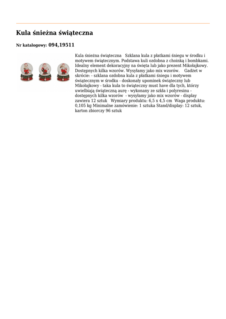 Kula śnieżna świąteczna Nr katalogowy: 094,19511 Kula śnieżna świąteczna Szklana kula z płatkami śniegu w środku i motywem świątecznym. Podstawa kuli ozdobna z choinką i bombkami. Idealny element dekoracyjny na święta lub jako prezent Mikołajkowy. Dostępnych kilka wzorów. Wysyłamy jako mix wzorów. Gadżet w skrócie: - szklana ozdobna kula z płatkami śniegu i motywem świątecznym w środku - doskonały upominek świąteczny lub Mikołajkowy - taka kula to świąteczny must have dla tych, którzy uwielbiają świąteczną aurę - wykonany ze szkła i polyresinu dostępnych kilka wzorów - wysyłamy jako mix wzorów - display zawiera 12 sztuk Wymiary produktu: 6,5 x 4,5 cm Waga produktu: 0,105 kg Minimalne zamówienie: 1 sztuka Stand/display: 12 sztuk, karton zbiorczy 96 sztuk