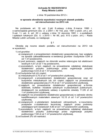 Uchwała Nr 562/XXIV/2012 Rady Miasta Lublin z dnia 18 października 2012 r. w sprawie określenia wysokości rocznych stawek podatku od nieruchomości na 2013 rok Na podstawie art. 18 ust. 2 pkt 8 ustawy z dnia 8 marca 1990 r. o samorządzie gminnym (Dz. U. z 2001 r. Nr 142, poz. 1591 z późn. zm.), art. 5 ust. 1 i ust. 4, art. 20 c ustawy z dnia 12 stycznia 1991 r. o podatkach i opłatach lokalnych (Dz. U. z 2010 r. Nr 95, poz. 613 z późn. zm.) - Rada Miasta Lublin uchwala, co następuje: §1 Określa się roczne stawki podatku od nieruchomości na 2013 rok w wysokości: 1) od gruntów: a) związanych z prowadzeniem działalności gospodarczej, bez względu na sposób zakwalifikowania w ewidencji gruntów i budynków 0,84 zł od 1 m2 powierzchni, b) pod jeziorami, zajętych na zbiorniki wodne retencyjne lub elektrowni wodnych 4,51 zł od 1 ha powierzchni, c) pozostałych, w tym zajętych na prowadzenie odpłatnej statutowej działalności pożytku publicznego przez organizacje pożytku publicznego 0,43 zł od 1 m2 powierzchni, 2) od budynków lub ich części: a) mieszkalnych 0,70 zł od 1 m2 powierzchni użytkowej, b) związanych z prowadzeniem działalności gospodarczej oraz od budynków mieszkalnych lub ich części zajętych na prowadzenie działalności gospodarczej 21,70 zł od 1 m2 powierzchni użytkowej, c) zajętych na prowadzenie działalności gospodarczej w formie stołówek, bufetów i kiosków szkolnych w placówkach publicznych, działających na podstawie ustawy o systemie oświaty 11,05 zł od 1 m2 powierzchni użytkowej, d) zajętych na prowadzenie działalności gospodarczej w zakresie obrotu kwalifikowanym materiałem siewnym 10,15 zł od 1 m2 powierzchni użytkowej, e) związanych z udzielaniem świadczeń zdrowotnych, w rozumieniu przepisów o działalności leczniczej, zajętych przez podmioty udzielające tych świadczeń 4,60 zł od 1 m2 powierzchni użytkowej, f) pozostałych, w tym zajętych na prowadzenie odpłatnej statutowej działalności pożytku publicznego przez organizacje pożytku publicznego 7,50 zł od 1 m2 powierzchni użytkowej, 3) od budowli 2% ich wartości. —————————————————————————————————————————————————— Id: FGHJG-QPLOG-KWLQN-OABNU-EKOYL. Podpisany Strona 1 z 2 §2 1) Różnica pomiędzy stawką określoną w § 1 pkt 2 lit. b) a stawką określoną w § 1 pkt 2 lit. c) stanowi pomoc de minimis. Zastosowanie stawki określonej w § 1 pkt 2 lit. c) następuje zgodnie z rozporządzeniem Komisji (WE) nr 1998/2006 z dnia 15 grudnia 2006 r. w sprawie stosowania art. 87 i 88 Traktatu do pomocy de minimis (Dz. Urz. UE L 379 z dnia 28.12.2006 r.). 2) Przedsiębiorca może uzyskać pomoc de minimis, jeżeli wartość tej pomocy brutto łącznie z wartością innej pomocy de minimis otrzymanej przez ten podmiot w bieżącym roku kalendarzowym i dwóch poprzedzających go lat kalendarzowych nie przekracza kwoty stanowiącej równowartość 200 tys. euro, przy czym dla podmiotu gospodarczego działającego w sektorze transportu drogowego, wartość tej pomocy brutto nie przekracza kwoty stanowiącej równowartość 100 tys. euro. 3) Przedsiębiorca nie może uzyskać pomocy de minimis, jeżeli otrzymał pomoc inną niż pomoc de minimis, w odniesieniu do tych samych kosztów kwalifikujących się do objęcia pomocą, a łączna wartość pomocy spowodowałaby przekroczenie dopuszczalnej intensywności pomocy. 4) W celu uzyskania pomocy de minimis przedsiębiorca winien przedstawić zaświadczenia, oświadczenia oraz informacje, o których mowa w art. 37 ust. 1 ustawy z dnia 30 kwietnia 2004 r. o postępowaniu w sprawach dotyczących pomocy publicznej (Dz. U. z 2007 r. Nr 59, poz. 404 z późn. zm.). §3 Wykonanie uchwały powierza się Prezydentowi Miasta Lublin. §4 Uchwała wchodzi w życie po upływie 14 dni od dnia ogłoszenia w Dzienniku Urzędowym Województwa Lubelskiego i ma zastosowanie od 1 stycznia 2013 roku. Przewodniczący Rady Miasta Lublin Piotr Kowalczyk —————————————————————————————————————————————————— Id: FGHJG-QPLOG-KWLQN-OABNU-EKOYL. Podpisany Strona 2 z 2