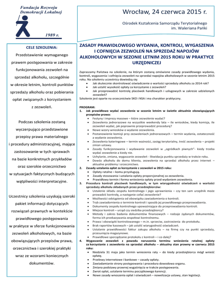 Wrocław, 24 czerwca 2015 r. Rozwiązania informatyczne Ośrodek Kształcenia Samorządu Terytorialnego im. Waleriana Pańki CELE SZKOLENIA: Przedstawienie wymaganego prawem postępowania w zakresie funkcjonowania zezwoleń na sprzedaż alkoholu, szczególnie w okresie letnim, kontroli punktów sprzedaży alkoholu oraz pobierania opłat związanych z korzystaniem z zezwoleń. Podczas szkolenia zostaną wyczerpująco przedstawione przepisy prawa materialnego i procedury administracyjnej, mające zastosowanie w tych sprawach na bazie konkretnych przykładów oraz szerokie orzecznictwo w sytuacjach faktycznych budzących wątpliwości interpretacyjne. Uczestnicy szkolenia uzyskają szeroki pakiet informacji dotyczących rozwiązań prawnych w kontekście prawidłowego postępowania w praktyce w sferze funkcjonowania zezwoleń alkoholowych, na bazie obowiązujących przepisów prawa, orzecznictwa i szerokiej praktyki wraz ze wzorami koniecznych dokumentów. ZASADY PRAWIDŁOWEGO WYDANIA, KONTROLI, WYGASZENIA I COFNIĘCIA ZEZWOLEŃ NA SPRZEDAŻ NAPOJÓW ALKOHOLOWYCH W SEZONIE LETNIM 2015 ROKU W PRAKTYCE URZĘDNICZEJ Zapraszamy Państwa na szkolenie, na którym zostaną omówione zasady prawidłowego wydania, kontroli, wygaszenia i cofnięcia zezwoleń na sprzedaż napojów alkoholowych w sezonie letnim 2015 roku. Na szkoleniu uczestnicy dowiedzą się: Jak skutecznie skontrolować oświadczenie o wartości sprzedaży alkoholu za 2014 rok? Jak ustalić wysokość opłaty za korzystanie z zezwoleń? Jak przeprowadzić kontrolę placówek handlowych i usługowych w zakresie udzielonych zezwoleń? Szkolenie jest oparte na orzecznictwie SKO i NSA i ma charakter praktyczny. PROGRAM: 1. Jak prawidłowo wydać zezwolenie w sezonie letnim w świetle aktualnie obowiązujących przepisów prawa: Festyny i imprezy masowe – które zezwolenie wydać? Zezwolenia jednorazowe na wszystkie weekendy lata – ile wniosków, kiedy komisja, ile zezwoleń wydać, jak poprawnie przeprowadzić procedurę? Nowe wzory wniosków o wydanie zezwolenia. Postanowienie komisji przy zezwoleniach jednorazowych – termin wydania, ostateczność a wydanie zezwolenia. Zezwolenia kateringowe – termin ważności, zasięg terytorialny, treść zezwolenia – projekt zmian ustawy. Zasady funkcjonowania i wydawanie zezwoleń w „ogródkach piwnych”- kiedy trzeba wydać zezwolenie a kiedy nie. Uchylanie, zmiana, wygaszanie zezwoleń - likwidacja punktu sprzedaży w trakcie roku. Dowóz alkoholu do domu klienta, zezwolenia na sprzedaż alkoholu przez internet – aktualne problemy i orzecznictwo. 2. Zasady ustalania opłat za korzystanie z zezwoleń w 2015 roku: Opłaty ratalne – komu przysługują. Zasady stosowania i ustalania opłaty proporcjonalnej za zezwolenia. Prawidłowy termin i forma wniesienia opłaty przed wydaniem zezwolenia. 3. Procedura kontroli placówek handlowych, w tym wiarygodności oświadczeń o wartości sprzedaży alkoholu składanych przez przedsiębiorców: Ustalenie składu zespołu kontrolnego i jego uprawnienia – czy ten sam urzędnik może prowadzić kontrolę, a następnie cofać zezwolenie? Możliwości odstąpienia od obowiązku zawiadomienia o kontroli. Tryb zawiadomienia o terminie kontroli i sposób jej prawidłowego przeprowadzenia. Dokumenty zespołu kontrolnego upoważniające do przeprowadzenia kontroli. Miejsce kontroli – urząd czy siedziba przedsiębiorcy? Metody i zakres badania dokumentów finansowych – rodzaje żądanych dokumentów, forma ich przekazywania zespołowi kontrolnemu. Prawa i obowiązki kontrolowanego – m.in. sprzeciw, zastrzeżenia do protokołu. Brak raportów kasowych – jak ustalić wiarygodność oświadczeń. Ustalanie prawidłowości faktur zakupu alkoholu – na firmę czy na punkt sprzedaży, przesunięcia magazynowe. Prawidłowe sporządzanie protokołu z kontroli – i co dalej? 4. Wygaszanie zezwoleń z powodu naruszenia terminu wniesienia ratalnej opłaty za korzystanie z zezwolenia na sprzedaż alkoholu – aktualny stan prawny w czerwcu 2015 roku: Niedziela 31 maja jako termin wniesienia raty – do kiedy przedsiębiorca mógł wnieść opłatę. Przelewy internetowe i bankowe – zasady opłaty. Zawiadamianie strony postępowania i procedura dowodowa organu. Zmiana podstawy prawnej wygaśnięcia w trakcie postępowania. Zwrot opłat, ustalanie terminu początkowego karencji. Nowe zasady wnoszenia opłat i oświadczeń – nowelizacja ustawy, stan legislacji. SZKOLENIE SKIEROWANE DO: pracowników gmin zajmujących się wydawaniem zezwoleń na sprzedaż napojów alkoholowych, przewodniczących i członków miejskich i gminnych komisji rozwiązywania problemów alkoholowych, radnych, pełnomocników gminnych do spraw profilaktyki alkoholowej. DANE DO KONTAKTU: Ośrodek Kształcenia Samorządu Terytorialnego im. Waleriana Pańki 40-014 Katowice ul. Mariacka 1 5. 6. 7. Cofanie zezwoleń na sprzedaż alkoholu: Procedura dowodowa organu. Zasady oceny trzeźwości klienta – jakie dowody w postępowaniu. Zeznania osób niepełnoletnich jako dowód w postępowaniu. Automaty do gier a zezwolenia na sprzedaż alkoholu. Skargi sąsiadów i mieszkańców na działalność punktów sprzedaży – tryb postępowania organu zezwalającego. Ustalanie prawidłowego terminu karencji. Prawidłowe zastosowanie Kodeksu Postępowania Administracyjnego w wydawaniu, cofaniu, zmianie i wygaszaniu zezwoleń na sprzedaż napojów. Porady prawne i praktyczne – jak uniknąć uchylenia decyzji przez organ odwoławczy. MIEJSCE SZKOLENIA: Wrocław, siedziba Ośrodka, ul. Marszałka J. Piłsudskiego 49-57, III piętro. Biurowiec znajduje się obok Hotelu Scandic. Wejście pomiędzy bankiem Millenium i Getin Bankiem. Mapkę dojazdu do siedziby znajdą Państwo na stronie www.okst.pl/dojazd. TERMIN SZKOLENIA: 24 czerwca 2015 r., godz. 09.00 – 14.00. NIP: 522-000-18-95 Tel 32 259 86 73, 32 253 84 09 Fax. 32 259 86 73 w. 22 e-mail: [email protected] www.okst.pl OSOBA DO KONTAKT