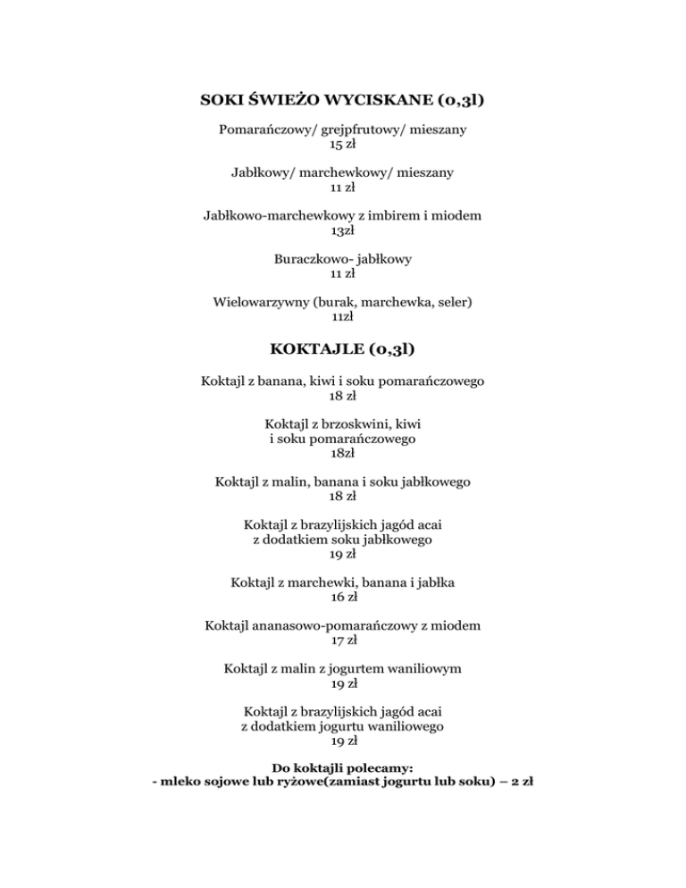 SOKI ŚWIEŻO WYCISKANE (0,3l) Pomarańczowy/ grejpfrutowy/ mieszany 15 zł Jabłkowy/ marchewkowy/ mieszany 11 zł Jabłkowo-marchewkowy z imbirem i miodem 13zł Buraczkowo- jabłkowy 11 zł Wielowarzywny (burak, marchewka, seler) 11zł KOKTAJLE (0,3l) Koktajl z banana, kiwi i soku pomarańczowego 18 zł Koktajl z brzoskwini, kiwi i soku pomarańczowego 18zł Koktajl z malin, banana i soku jabłkowego 18 zł Koktajl z brazylijskich jagód acai z dodatkiem soku jabłkowego 19 zł Koktajl z marchewki, banana i jabłka 16 zł Koktajl ananasowo-pomarańczowy z miodem 17 zł Koktajl z malin z jogurtem waniliowym 19 zł Koktajl z brazylijskich jagód acai z dodatkiem jogurtu waniliowego 19 zł Do koktajli polecamy: - mleko sojowe lub ryżowe(zamiast jogurtu lub soku) – 2 zł