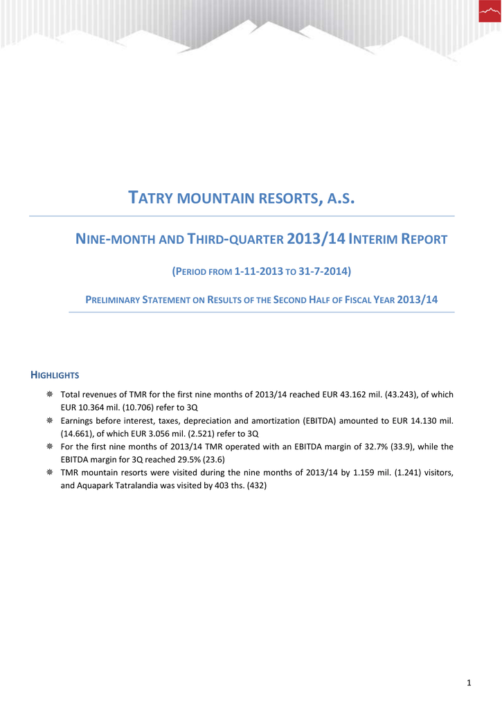 TATRY MOUNTAIN RESORTS, A.S. NINE-MONTH AND THIRD-QUARTER 2013/14 INTERIM REPORT (PERIOD FROM 1-11-2013 TO 31-7-2014) PRELIMINARY STATEMENT ON RESULTS OF THE SECOND HALF OF FISCAL YEAR 2013/14 HIGHLIGHTS Total revenues of TMR for the first nine months of 2013/14 reached EUR 43.162 mil. (43.243), of which EUR 10.364 mil. (10.706) refer to 3Q Earnings before interest, taxes, depreciation and amortization (EBITDA) amounted to EUR 14.130 mil. (14.661), of which EUR 3.056 mil. (2.521) refer to 3Q For the first nine months of 2013/14 TMR operated with an EBITDA margin of 32.7% (33.9), while the EBITDA margin for 3Q reached 29.5% (23.6) TMR mountain resorts were visited during the nine months of 2013/14 by 1.159 mil. (1.241) visitors, and Aquapark Tatralandia was visited by 403 ths. (432) 1 COMMENTARY FROM CEO For the first nine months of the financial year 2013/14 we were able to keep revenues at the level of last, recordbreaking year, despite the less-than-ideal conditions during the winter and summer season. The winter season, which was extremely mild and dry, and thus shorter, had a negative impact on the number of skier days at our cableways. In the summer season we had to fight weather that was unfavorable for summer hiking or visits of aquaparks. Despite the negative weather factor, it is safe for me to say that we managed this tough period with success mainly thanks to our hotels that have been posting stable growth in sales as well as in operating profit achieved by more efficient cost management. Moreover, the decline in the number of visitors was not as steep as expected. The visit rate in the mountain resorts during the third quarter even reached the level of last year, which was extremely successful. In order to boost the visit rate, during the summer we organized a number of events and expanded our offer of summer activities in the resorts. Upon conclusion of the winter season realization works of investments began in the TMR resorts as usually. This year’s investments are mainly directed at trail enhancement and at Aquapark Tatralandia with the goal of increasing the quality of our clients’ experience. As part of our presence in Poland, in the summer we initiated negotiations about cooperation on modernizing Polish Silesian Amusement Park, which could introduce an interesting opportunity of expanding our business. At the same time, we are working hard on our investment plan in the resort of Szczyrkowski Ośrodek Narciarski, and we are applying for relevant permissions. By the end of the financial year, favorable fall weather can still surprise us positively, as well as demand of corporate clientele in our hotels. I am optimistic about the winter season 2014/15, still capitalizing on the capital-intensive investments of previous years into our mountain resorts, hotels, and aquapark totaling EUR 190 million. Also, I expect a positive impact from the new airline connection of the Tatras with London and Latvian Riga, which will enable new markets an easier access to the Tatras. PROFILE OF TMR Tatry mountain resorts, a.s. (TMR, the Company) is a joint stock company with its headquarters in Liptovský Mikuláš, registered at the Bratislava Stock Exchange (BSSE), the Prague Stock Exchange (PSE), and the Warsaw Stock Exchange (WSE). TMR with its subsidiaries (the Group) is the biggest entity in tourism in Central and Eastern Europe. TMR’s operations are divided into three key segments: Mountains & Leisure, Hotels, and Real Estate. The main segment – Mountains & Leisure is further divided into the following subsegments: Mountain Resorts, Aquapark, Dining, and Sports Services & Stores. In Slovakia the Group owns and/or operates in the High Tatras: the Vysoké Tatry resort with the ski areas of Tatranská Lomnica and Starý Smokovec and the ski area of Štrbské Pleso in the High Tatras, which TMR co-manages. In the High Tatras the Group also owns and operates hotels: Grandhotel Praha Tatranská Lomnica****, Grandhotel Starý Smokovec****, and Hotel FIS***. In the Low Tatras TMR owns and operates Aquapark Tatralandia, which includes the lodging facility Holiday Village Tatralandia; then mountain resort Jasná Nízke Tatry; and hotels: Wellness hotel Grand Jasná****, Tri Studničky Hotel****, Hotel Srdiečko**, Chalets Jasná de Luxe****, and Hotel Rotunda. At the same time TMR owns and leases out Hotel Slovakia***, Hotel Liptov**, Hotel Ski & Fun** and Kosodrevina Lodge. TMR owns 19% in Melida, a.s., which since the winter season 2012/13 leases and operates the Špindlerův Mlýn resort in the Czech Republic. In Poland TMR owns the mountain resort Szczyrkowski Ośrodek Narciarski S.A. (SON). INVESTMENTS DURING 3Q In the third quarter the Company carried on with the investment plan for the current year, approved by the General Meeting on April 12, 2014 with the total budget of EUR 7.5 mil. During the period a new restaurant, Medrano, was 2 completed and launched in Aquapark Tatralandia. Furthermore, the Jasná resort opened Rocky Mountain Bike World Jasná with 25 km of cycle trails. Also, downhill trails and start stations of cableways are being enhanced; snowmaking systems in the mountain resorts are getting optimized; and snow and wind barriers are getting added. EVENTS DURING 3Q The first summer months in the TMR mountain resorts were busy with events. The summer season in the Low Tatras was kicked off with a downhill riding of mountain bicycles in the new Bike World Jasná. The most memorable moment of the summer days in the Jasná resort was the Dragon Night at Mt. Chopok with nocturnal cableway rides and a family program in the restaurant Rotunda. The summer in the High Tatras was kicked off with Tatra May Adventures with a barbeque at Skalnaté pleso, boat rides at Štrbské pleso, and a downhill ride on mountain carts. With the start of the school summer break visitors of Skalnaté and Štrbské pleso enjoyed 62 days of the Fit & Happy High Tatras program. A concert of a y