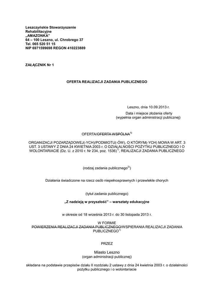 Leszczyńskie Stowarzyszenie Rehabilitacyjne „AMAZONKA” 64 – 100 Leszno, ul. Chrobrego 37 Tel. 065 520 51 15 NIP 6971599698 REGON 410223889 ZAŁĄCZNIK Nr 1 OFERTA REALIZACJI ZADANIA PUBLICZNEGO Leszno, dnia 10.09.2013 r. Data i miejsce złożenia oferty (wypełnia organ administracji publicznej) OFERTA/OFERTA WSPÓLNA 1) ORGANIZACJI POZARZĄDOWEJ(-YCH)/PODMIOTU(-ÓW), O KTÓRYM(-YCH) MOWA W ART. 3 UST. 3 USTAWY Z DNIA 24 KWIETNIA 2003 r. O DZIAŁALNOŚCI POŻYTKU PUBLICZNEGO I O 1) WOLONTARIACIE (Dz. U. z 2010 r. Nr 234, poz. 1536) , REALIZACJI ZADANIA PUBLICZNEGO 2) (rodzaj zadania publicznego ) Działania świadczone na rzecz osób niepełnosprawnych i przewlekle chorych (tytuł zadania publicznego) „Z nadzieją w przyszłość” – warsztaty edukacyjne w okresie od 18 września 2013 r. do 30 listopada 2013 r. W FORMIE POWIERZENIA REALIZACJI ZADANIA PUBLICZNEGO/WSPIERANIA REALIZACJI ZADANIA 1) PUBLICZNEGO PRZEZ Miasto Leszno (organ administracji publicznej) składana na podstawie przepisów działu II rozdziału 2 ustawy z dnia 24 kwietnia 2003 r. o działalności pożytku publicznego i o wolontariacie I. Dane oferenta/oferentów 1), 3) 1) nazwa: Leszczyńskie Stowarzyszenie Rehabilitacyjne Amazonka 4) 2) forma prawna: ( x) stowarzyszenie () fundacja ( ) kościelna osoba prawna () kościelna jednostka organizacyjna ( ) spółdzielnia socjalna () inna............................................. 5) 3) numer w Krajowym Rejestrze Sądowym, w innym rejestrze lub ewidencji: 0000055194 6) 4) data wpisu, rejestracji lub utworzenia: 6.06.1994 5) nr NIP: 697-15-99-698 nr REGON: 410223889 6) adres: miejscowość: 64 – 100 Leszno ul.: ul. B Chrobrego 37 7) dzielnica lub inna jednostka pomocnicza: ...................................................................................... 8) gmina: Leszno.powiat: Leszno województwo: wielkopolskie kod pocztowy: 64-100 poczta: Leszno 7) tel.:.- faks: e-mail: - http:// 8) numer rachunku bankowego: BZ WBK S.A. 32 1090 1245 0000 0000 2400 9801 nazwa banku: BZ WBK S.A. 1) 9) nazwiska i imiona osób upoważnionych do reprezentowania oferenta/oferentów : a) Wanda Jakubowska – po Prezes tel. 603199134 c) Danuta Bąk - Skarbnik tel. 887927182 10) nazwa, adres i telefon kontaktowy jednostki organizacyjnej bezpośrednio wykonującej zadanie, o 9) którym mowa w ofercie: Jak wyżej ........................................................................................................................................................... 11)osoba upoważniona do składania wyjaśnień dotyczących oferty (imię i nazwisko oraz nr telefonu kontaktowego) Halina Koronowska - Tel. 601 772 720 12) przedmiot działalności pożytku publicznego: a) działalność nieodpłatna pożytku publicznego Działalność na rzecz osób z rakiem piersi. Różne formy działalności zmierzające do zwalczania i minimalizowania kalectwa i inwalidztwa związanego z chorobą nowotworową piersi. Minimalizowanie inwalidztwa związanego z chorobą Działania na rzecz wczesnego wykrywania , leczenia i rehabilitacji psychofizycznej osób dotkniętych rakiem piersi. Działalność integracyjna -społeczna i środowiskowa. b) działalność odpłatna pożytku publicznego 1) 1) 13) jeżeli oferent/oferenci prowadzi/prowadzą działalność gospodarczą: a) numer wpisu do rejestru przedsiębiorców b) przedmiot działalności gospodarczej Nie dotyczy II. Informacja o sposobie reprezentacji oferentów wobec organu administracji publicznej 10) wraz z przytoczeniem podstawy prawnej Nie dotyczy III. Szczegółowy zakres rzeczowy zadania publicznego proponowanego do realizacji 1. Krótka charakterystyka zadania publicznego Realizacja zadania polega na zorganizowaniu cyklu warsztatów psychologicznych, profilaktycznych i rehabilitacyjnych dla kobiet chorych na raka piersi i ich rodzin oraz studentek leszczyńskich uczelni i uczennic miejscowych szkół średnich. 2. Opis potrzeb wskazujących na konieczność wykonania zadania publicznego, opis ich przyczyn oraz skutków Warsztaty spełniają bardzo ważną rolę w utrzymaniu zdrowia psychicznego i codziennej kondycji psychofizycznej uczestniczek, wzbogacają wiedzę z zakresu profilaktyki, rehabilitacji. Stanowią istotny element w leczeniu i przeciwdziałaniu depresji, która może wystąpić u osób chorych oraz poszerzają wiedzę Amazonek , ich rodzin, młodych kobiet na temat choroby nowotworowej piersi. Rozpropagowanie wśród młodych kobiet materiałów promocyjnych na temat raka piersi i działalności Leszczyńskiego Stowarzyszenia Rehabilitacyjnego Amazonka. 3. Opis grup adresatów zadania publicznego Leszczyńskie Amazonki i ich rodziny, Studentki leszczyńskich uczelni. Uczennice miejscowych szkół średnich. 4. Uzasadnienie potrzeby dofinansowania z dotacji inwestycji związanych z realizacją zadania publicznego, w szczególności ze wskazaniem, w jaki sposób przyczyni się to do podwyższenia 11) standardu realizacji zadania Nie dotyczy 5. 1) 1) Informacja, czy w ciągu ostatnich 5 lat oferent/oferenci otrzymał/otrzymali dotację na dofinansowanie inwestycji związanych z realizacją zadania publicznego z podaniem inwestycji, które zostały dofinansowane, organu, który udzielił dofinansowania, oraz daty 11) otrzymania dotacji Nie dotyczy 6. Zakładane cele realizacji zadania publicznego oraz sposób ich realizacji - poprawa kondycji psychofizycznej, - poszerzenie wiedzy psychologicznej ,profilaktycznej i rehabilitacyjnej na temat walki z rakiem, - poznanie nowych form wykrywania , leczenia, rehabilitacji i relaksacji raka piersi, - integracja społeczna Amazonek- środowiskowa międzypokoleniowa, - rehabilitacja społeczna i duchowa uczestniczek, - przeciwdziałanie stanom depresyjnym i osamotnienia, 7. Miejsce realizacji zadania publicznego Leszno 8. Opis poszczególnych działań w zakresie realizacji zadania publicznego 12) Rekrutacja uczestniczek, przygotowanie i organizacja warsztatów psychologicznych oraz sz