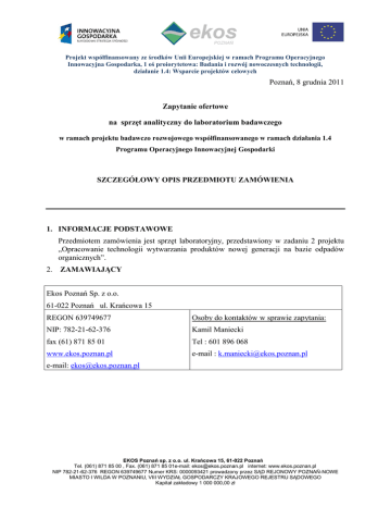 Projekt współfinansowany ze środków Unii Europejskiej w ramach Programu Operacyjnego Innowacyjna Gospodarka, 1 oś proiorytetowa: Badania i rozwój nowoczesnych technologii, działanie 1.4: Wsparcie projektów celowych Poznań, 8 grudnia 2011 Zapytanie ofertowe na sprzęt analityczny do laboratorium badawczego w ramach projektu badawczo rozwojowego współfinansowanego w ramach działania 1.4 Programu Operacyjnego Innowacyjnej Gospodarki SZCZEGÓŁOWY OPIS PRZEDMIOTU ZAMÓWIENIA 1. INFORMACJE PODSTAWOWE Przedmiotem zamówienia jest sprzęt laboratoryjny, przedstawiony w zadaniu 2 projektu „Opracowanie technologii wytwarzania produktów nowej generacji na bazie odpadów organicznych”. 2. ZAMAWIAJĄCY Ekos Poznań Sp. z o.o. 61-022 Poznań ul. Krańcowa 15 REGON 639749677 Osoby do kontaktów w sprawie zapytania: NIP: 782-21-62-376 Kamil Maniecki fax (61) 871 85 01 Tel : 601 896 068 www.ekos.poznan.pl e-mail : [email protected] e-mail: [email protected] EKOS Poznań sp. z o.o. ul. Krańcowa 15, 61-022 Poznań Tel. (061) 871 85 00 , Fax. (061) 871 85 01e-mail: [email protected] internet: www.ekos.poznan.pl NIP 782-21-62-376 REGON 639749677 Numer KRS: 0000093421 prowadzony przez SĄD REJONOWY POZNAŃ-NOWE MIASTO I WILDA W POZNANIU, VIII WYDZIAŁ GOSPODARCZY KRAJOWEGO REJESTRU SĄDOWEGO Kapitał zakładowy 1 000 000,00 zł Projekt współfinansowany ze środków Unii Europejskiej w ramach Programu Operacyjnego Innowacyjna Gospodarka, 1 oś proiorytetowa: Badania i rozwój nowoczesnych technologii, działanie 1.4: Wsparcie projektów celowych 3. ZAKRES ZAMÓWIENIA 3.1 Przedmiot zamówienia: - Spektrometr absorpcji atomowej ASA - Wyparka obrotowa próżniowa - Wytrząsarka - Uniwersalny miernik zawierający: konduktometr, pH metr, tlenomierz i termometr - Szafa termostatyczna - Licznik kolonii bakterii - Destylarka do wody - Demineralizator do wody - Kalorymetr - Termoreaktor do szybkich testów - Szybkie testy CHZT - odczynniki na 25 testów - Szybkie testy BZT5 - odczynniki na 25 testów - Sonda do pomiaru CHZT w przepływie - Aparat do pomiaru BZT Oxidirect - Aparat do destylacji z parą wodną. 3.2 Zakres zadań w ramach zamówienia Dostarczenie, uruchomienie i przeszkolenie pracowników w zakresie obsługi urządzeń. 3.3 Dodatkowe wymagania formalne: data wystawienia oferty okres ważności oferty – nie krócej niż do 31 stycznia 2012r. podpis wystawcy oferty wartości brutto określone w PLN 4. Kryteria oceny ofert: Kryteria wyboru Waga (od 1-5, gdzie 1 najniższa, a 5 najwyższa) Cena 5 EKOS Poznań sp. z o.o. ul. Krańcowa 15, 61-022 Poznań Tel. (061) 871 85 00 , Fax. (061) 871 85 01e-mail: [email protected] internet: www.ekos.poznan.pl NIP 782-21-62-376 REGON 639749677 Numer KRS: 0000093421 prowadzony przez SĄD REJONOWY POZNAŃ-NOWE MIASTO I WILDA W POZNANIU, VIII WYDZIAŁ GOSPODARCZY KRAJOWEGO REJESTRU SĄDOWEGO Kapitał zakładowy 1 000 000,00 zł Projekt współfinansowany ze środków Unii Europejskiej w ramach Programu Operacyjnego Innowacyjna Gospodarka, 1 oś proiorytetowa: Badania i rozwój nowoczesnych technologii, działanie 1.4: Wsparcie projektów celowych 5. Oferty można składać elektronicznie w postaci skanu oferty oryginalnej pocztą elektroniczną na poniższy adres: [email protected] lub w wersji papierowej na adres Zamawiającego wskazany w pkt.2 niniejszego zapytania. Oferta winna zawierać łączną cenę za wszystkie części opracowania. Nieprzekraczalny termin dostarczenia oferty to: 22 grudnia 2011 r. do godziny 16.00 6. DODATKOWE INFORMACJE 6.1. W celu realizacji zamówienia z wybranym Wykonawcą zostanie podpisana umowa. 6.2. Zamawiający zastrzega sobie możliwość negocjacji szczegółowych warunków realizacji umowy z najlepszymi oferentami. 6.3. Zamawiający zastrzega sobie prawo do nie wybrania żadnego Wykonawcy. EKOS Poznań sp. z o.o. ul. Krańcowa 15, 61-022 Poznań Tel. (061) 871 85 00 , Fax. (061) 871 85 01e-mail: [email protected] internet: www.ekos.poznan.pl NIP 782-21-62-376 REGON 639749677 Numer KRS: 0000093421 prowadzony przez SĄD REJONOWY POZNAŃ-NOWE MIASTO I WILDA W POZNANIU, VIII WYDZIAŁ GOSPODARCZY KRAJOWEGO REJESTRU SĄDOWEGO Kapitał zakładowy 1 000 000,00 zł