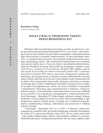 SŁOWO. Studia językoznawcze 4/ 2013 R o z p r a w y ISSN 2082-6931 Kazimierz Ożóg Uniwersytet Rzeszowski Kilka uwag o tworzeniu tekstu przez Benedykta XVI i a r t y k u ł y Niniejszy tekst ma podwójną motywację, wyrasta, po pierwsze, z mojej fascynacji tekstami papieża Benedykta XVI, a po wtóre, z prowadzonych przeze mnie badań nad zjawiskiem metatekstu i funkcjonowaniem figur retorycznych w tekstach współczesnych. Te dwie przesłanki sprawiły, że postanowiłem przyjrzeć się sposobom budowania tekstu przez tego znamienitego autora. Jako materiał do badań tekstowych wybrałem trzytomowe dzieło Jezus z Nazaretu, które w przekładzie polskim dominikanina Wiesława Szymony ukazywało się następująco: najpierw część I Od chrztu w Jordanie do Przemienienia, Kraków 2007, kolejno część II Od wjazdu do Jerozolimy do Zmartwychwstania, Kielce 2011, i na koniec Dzieciństwo, Kraków 2012. Jest to, oczywiście, tłumaczenie z języka niemieckiego, ale przypuszczam, że tłumacz wiernie oddał sposób tworzenia tekstu. Każdy człowiek ma swój styl wypowiadania myśli, tłumaczenia ich na słowo. Styl wypowiedzi danej osoby, obojętnie, mówiony czy pisany, rozumiany jako wybór i kombinacja elementów językowych ze względu na jakiś cel pragmatyczny, zależy od wielu czynników związanych z charakterem człowieka, jego uczestnictwem w kulturze, zwłaszcza kulturze pisma, wykształceniem, doświadczeniem życiowym. Splatają się tu czynniki stricte językowe i pozajęzykowe, zwłaszcza kulturowe. Józef Ratzinger – Benedykt XVI jako ksiądz, profesor teologii, biskup, kardynał, wreszcie papież ma swój styl, który silnie koresponduje z jego skupieniem, pokorą z jednej strony, z drugiej zaś z wielką formacją duchową i intelektualną, erudycją, znakomitym uczestnictwem w wielkiej kulturze Europy. J. Ratzinger – Benedykt XVI, ur. w 1927 r. w Bawarii, należy bez wątpienia do wielkich ludzi Kościoła katolickiego ostatnich dziesiątków lat wieku XX i pierwszej dekady wieku XXI. Jest to osoba niezwykła – jako wielki intelektualista, żarliwy chrześcijanin, subtelny w rozważaniach filozoficznych i teologicznych profesor stał się znany najpierw jako Kilka uwag o tworzeniu tekstu przez Benedykta XVI 129 „konserwatywny” współpracownik Jana Pawła II, kiedy był na czele watykańskiej Kongregacji do Spraw Doktryny Wiary. Największy wpływ wywarł na Kościół, i pośrednio na świat, będąc w latach 2005–2012 papieżem, swoistym kontynuatorem dzieła Jana Pawła II. Jednak, paradoksalnie, przejdzie do historii głównie jako pierwszy papież, który zrzekł się pełnienia funkcji i usunął się w zacisze klasztorne. Niezwykła to postać, zaś jego dzieło będzie jeszcze wiele razy przedmiotem różnych analiz. Mój skromny artykuł podejmie niektóre zagadnienia związane z budową tekstów i sposobem jego wykładania. Czytam z zainteresowaniem Jezusa z Nazaretu. Uzasadniam to kilkoma powodami. Po pierwsze, porównuję to dzieło z innymi na ten sam temat, chociażby z tekstem François Mauriaca czy Romana Brandstaettera. Książka Ratzingera jest w pełni naukowa, oparta na najnowszych osiągnięciach wiedzy biblijnej i teologicznych dociekaniach wybitnych znawców Pisma Świętego. Tamte teksty są tekstami literackimi. Po wtóre, przedmiotem godnym analizy jest sposób pisania (tworzenia tekstów) przez Benedykta XVI: bardzo jasny, rzeczowy, logiczny, w najwyższym stopniu przemyślany. Warto zatem zanalizować dzieło Józefa Ratzingera pod kątem mechanizmów retorycznych i elementów metatekstowych. Mechanizmy te stają się głównym czynnikiem swoistości i atrakcyjności wykładu Ratzingera. Badania nad metatekstem, zapoczątkowane w językoznawstwie polskim przez Annę Wierzbicką [1971] w latach 70. ubiegłego wieku, znakomicie się rozwinęły. Przez metatekst rozumiem – tak jak w mojej monografii o elementach metatekstowych w polszczyźnie mówionej – ogół operatorów, które albo organizują tekst jako całość, albo, odnosząc się do jakiejś części tekstu, mogą coś o niej orzekać jako o swoistym bycie. Przykładowe elementy metatekstowe z dzieła Ratzingera to: co znaczy „poświęcić”?, poprzestańmy na krótkiej wzmiance, na koniec musimy jeszcze rozważyć słowo „nasz”, zajmijmy się teraz tymi dwoma tekstami, można by powiedzieć, więcej jeszcze można powiedzieć, jeśli na koniec spojrzymy raz jeszcze, rzecz jasna, po pierwsze, po drugie, co wiecej. Operatory metatekstowe stały się wdzięcznym polem badań dla badaczy zajmujących się organizacją tekstu, by wymienić tu takich językoznawców, jak: Jadwiga Wajszczuk [2005], Kazimierz Ożóg [1990], Urszula Gajewska [2004], Andrzej Charciarek [2010], Zofia Czapiga [2006]. Po kilkudziesięciu latach dociekań nad tą swoistą płaszczyzną tekstu wiemy już dosyć dużo o działaniu tych swoistych składników tekstu. Autorzy znakomitej monografii o tworzeniu tekstów – Jerzy Bartmiński i Stanisława Niebrzegowska-Bartmińska – tak definiują ten fenomen: Metatekst jest tekstem o tekście, wyrazem samoświadomości nadawcy, który nie tylko mówi o czymś, ale też kontroluje i komentuje własne mówienie i tekst, jaki tworzy, jego temat, składniki, także poszczególne wyrażenia, których używa. Co więcej, mówiący czy piszący może też komentować własne zachowania komunikacyjne, to, co się dzieje na styku nadawca – odbiorca, ja – ty [Bartmiński, Niebrzegowska-Bartmińska 2009: 186]. 130 Kazimierz Ożóg Styl Jezusa z Nazaretu jest – przy zachowaniu rygorów naukowych dociekań teologicznych i biblijnych, przy stosowaniu metodologicznych reguł egzegezy biblijnej – bardzo logiczny, zdyscyplinowany, przejrzysty, w sumie prosty. Można zatem twierdzić, że autor kontynuuje tu tradycje humanistyki niemieckiej. Papież pisze w sposób zrozumiały nie tylko dla teologów czy osób duchownych, ale dla każdego czytelnika,