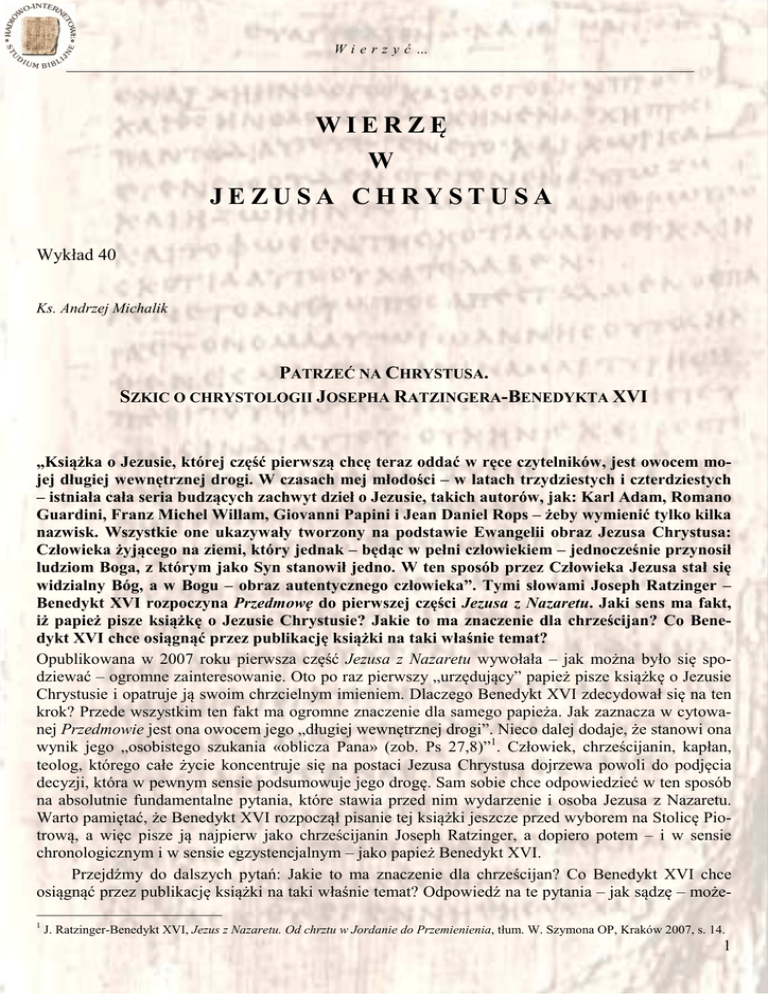 Wierzyć… } WIERZĘ W JEZUSA CHRYSTUSA Wykład 40 Ks. Andrzej Michalik PATRZEĆ NA CHRYSTUSA. SZKIC O CHRYSTOLOGII JOSEPHA RATZINGERA-BENEDYKTA XVI „Książka o Jezusie, której część pierwszą chcę teraz oddać w ręce czytelników, jest owocem mojej długiej wewnętrznej drogi. W czasach mej młodości – w latach trzydziestych i czterdziestych – istniała cała seria budzących zachwyt dzieł o Jezusie, takich autorów, jak: Karl Adam, Romano Guardini, Franz Michel Willam, Giovanni Papini i Jean Daniel Rops – żeby wymienić tylko kilka nazwisk. Wszystkie one ukazywały tworzony na podstawie Ewangelii obraz Jezusa Chrystusa: Człowieka żyjącego na ziemi, który jednak – będąc w pełni człowiekiem – jednocześnie przynosił ludziom Boga, z którym jako Syn stanowił jedno. W ten sposób przez Człowieka Jezusa stał się widzialny Bóg, a w Bogu – obraz autentycznego człowieka”. Tymi słowami Joseph Ratzinger – Benedykt XVI rozpoczyna Przedmowę do pierwszej części Jezusa z Nazaretu. Jaki sens ma fakt, iż papież pisze książkę o Jezusie Chrystusie? Jakie to ma znaczenie dla chrześcijan? Co Benedykt XVI chce osiągnąć przez publikację książki na taki właśnie temat? Opublikowana w 2007 roku pierwsza część Jezusa z Nazaretu wywołała – jak można było się spodziewać – ogromne zainteresowanie. Oto po raz pierwszy „urzędujący” papież pisze książkę o Jezusie Chrystusie i opatruje ją swoim chrzcielnym imieniem. Dlaczego Benedykt XVI zdecydował się na ten krok? Przede wszystkim ten fakt ma ogromne znaczenie dla samego papieża. Jak zaznacza w cytowanej Przedmowie jest ona owocem jego „długiej wewnętrznej drogi”. Nieco dalej dodaje, że stanowi ona wynik jego „osobistego szukania «oblicza Pana» (zob. Ps 27,8)”1. Człowiek, chrześcijanin, kapłan, teolog, którego całe życie koncentruje się na postaci Jezusa Chrystusa dojrzewa powoli do podjęcia decyzji, która w pewnym sensie podsumowuje jego drogę. Sam sobie chce odpowiedzieć w ten sposób na absolutnie fundamentalne pytania, które stawia przed nim wydarzenie i osoba Jezusa z Nazaretu. Warto pamiętać, że Benedykt XVI rozpoczął pisanie tej książki jeszcze przed wyborem na Stolicę Piotrową, a więc pisze ją najpierw jako chrześcijanin Joseph Ratzinger, a dopiero potem – i w sensie chronologicznym i w sensie egzystencjalnym – jako papież Benedykt XVI. Przejdźmy do dalszych pytań: Jakie to ma znaczenie dla chrześcijan? Co Benedykt XVI chce osiągnąć przez publikację książki na taki właśnie temat? Odpowiedź na te pytania – jak sądzę – może1 J. Ratzinger-Benedykt XVI, Jezus z Nazaretu. Od chrztu w Jordanie do Przemienienia, tłum. W. Szymona OP, Kraków 2007, s. 14. 1 Wierzyć… } my znaleźć w cytowanej już Przedmowie. Joseph Ratzinger – Benedykt XVI piszę tę książkę jako chrześcijanin oraz jako papież. Jako chrześcijanin, jak każdy ochrzczony, jest wezwany do dawania świadectwa o Jezusie Chrystusie; jako papież jest Jego „urzędowym” świadkiem. To on jest wezwany, by codziennie w imieniu całego Kościoła odpowiadać na pytanie Jezusa spod Cezarei Filipowej: „Ty jesteś Mesjasz, Syn Boga żywego” (Mt 16,16). Dlatego pisze tę książkę, aby dać świadectwo Jezusowi i aby się przyczynić do umacniania żywej relacji każdego chrześcijanina z Jezusem Chrystusem2. Ten, kto czyta trylogię papieża Benedykta XVI może rzeczywiście przejść od poznania do doświadczenia. Ta lektura może poprowadzić go do miejsca, w którym spotka Jezusa z Nazaretu, zaprzyjaźni się z Nim i zapragnie Go naśladować. Trylogia „Jezus z Nazaretu”, o której mówimy, jest najbardziej znanym, ale z pewnością nie jedynym tekstem o Jezusie Chrystusie, który wyszedł spod pióra Josepha Ratzingera. O jakich jego pracach warto jeszcze pamiętać? Zanim przejdziemy do konkretnych tytułów, chciałby poszerzyć nasze spojrzenie. W teologii katolickiej, czy szerzej chrześcijańskiej, jakiekolwiek zagadnienie podejmiemy, zawsze pojawi się w jego kontekście, w taki czy inny sposób, osoba Jezusa Chrystusa – absolutne centrum, początek, podstawa i osobowa istota chrześcijaństwa. Po cokolwiek więc sięgniemy z przebogatego dorobku pisarskiego Josepha Ratzingera zawsze natkniemy się lub spotkamy osobę Jezusa Chrystusa. Na osobną uwagę w odniesieniu do naszego pytania zasługuje szósty tom (wydany w dwóch woluminach) z niemieckiej serii Gesammelte Schriften (czyli „Pism zebranych”) Josepha Ratzingera, zatytułowany Jesus von Nazareth. Beiträge zur Chrystologie. Warto dodać, że tom ten opublikowany jest już również w języku polskim w wydawanej przez Wydawnictwo Katolickiego Uniwersytetu Lubelskiego serii Opera Omnia Josepha Ratzingera3. W pierwszej części tej publikacji zamieszczono trylogię, której poświęciliśmy już nieco uwagi, w drugiej inne, ściśle chrystologiczne publikacje późniejszego papieża. Właśnie w tej części znajduje się kilka prac J. Ratzingera, o których warto pamiętać i po które warto sięgnąć. Myślę tu przede wszystkim o następujących tytułach: Patrzeć na Przebitego. Szkice o chrystologii duchowej, Patrzeć na Chrystusa. Postać Chrystusa w świetle historii kuszenia, Jezus Chrystus dzisiaj oraz zamieszczone w ostatniej części tego woluminu (część F) Medytacje, kazania, katechezy4. Co jest charakterystyczną cechą chrystologii Josepha Ratzingera? Najpierw chciałbym zaznaczyć, że podejmując w tak krótkim wykładzie temat chrystologii J. Ratzingera musimy się ograniczyć do bardzo ogólnego szkicu. Dlatego pytanie o charakterystyczną cechę chrystologii Josepha Ratzingera jest bardzo dobrym pytaniem. Chrystologia Josepha Ratzingera jest chrystologią duchową, to znaczy pogłębioną naukową refleksją nad osobą Jezusa Chrystusa, ale ukierunkowaną nie tyle na poznanie ile na spotkanie i naśladowanie. Oczywiście J. Ratzingerowi chodzi o dog