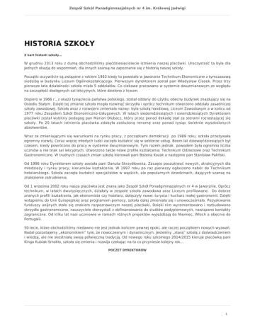 Zespół Szkół Ponadgimnazjalnych nr 4 im. Królowej Jadwigi HISTORIA SZKOŁY Z kart historii szkoły… W grudniu 2013 roku z dumą obchodziliśmy pięćdziesięciolecie istnienia naszej placówki. Uroczystość ta była dla jednych okazją do wspomnień, dla innych szansą na zapoznanie się z historią naszej szkoły. Początki oczywiście są związane z rokiem 1963 kiedy to powstało w Jaworznie Technikum Ekonomiczne z tymczasową siedzibą w budynku Liceum Ogólnokształcącego. Pierwszym dyrektorem został pan Władysław Ciosek. Przez trzy pierwsze lata działalności szkoła miała 5 oddziałów. Co ciekawe pracowano w systemie dwuzmianowym ze względu na szczupłość dostępnych sal lekcyjnych, które dzielono z liceum. Dopiero w 1966 r., z okazji tysiąclecia państwa polskiego, został oddany do użytku obecny budynek znajdujący się na Osiedlu Stałym. Dzięki tej zmianie szkoła mogła rozwinąć skrzydła i oprócz technikum otworzono oddziały zasadniczej szkoły zawodowej. Szkoła wraz z rozwojem zmieniała nazwy: była szkołą handlową, Liceum Zawodowym a w końcu od 1977 roku Zespołem Szkół Ekonomiczno-Usługowych. W latach siedemdziesiątych i osiemdziesiątych Dyrektorem placówki został wybitny pedagog pan Marian Dłubacz, który przez ponad dekadę stał za sterami rozrastającej się szkoły. Po 20 latach istnienia placówka zdobyła zasłużoną renomę oraz ponad tysiąc świetnie wyszkolonych absolwentów. Wraz ze zmieniającymi się warunkami na rynku pracy, z początkami demokracji po 1989 roku, szkoła przeżywała ogromny rozwój. Coraz więcej młodych ludzi zaczęło kształcić się w sektorze usług. Boom lat dziewięćdziesiątych był czasem, kiedy powrócono do pracy w systemie dwuzmianowym. Tym razem jednak powodem była ogromna liczba uczniów a nie brak sal lekcyjnych. Utworzono także nowe profile kształcenia: Technikum Odzieżowe oraz Technikum Gastronomiczne. W trudnych czasach zmian szkołą kierowali pani Bożena Kozak a następnie pan Stanisław Paliński. Od 1996 roku Dyrektorem szkoły została pani Danuta Skrzydłowska. Zaczęto poszukiwać nowych, atrakcyjnych dla młodzieży i rynku pracy, kierunków kształcenia. W 1997 roku po raz pierwszy ogłoszono nabór do Technikum hotelarskiego. Szkoła zaczęła kształcić specjalistów w wąskich, ale popularnych dziedzinach, dających szansę na znalezienie zatrudnienia. Od 1 września 2002 roku nasza placówka jest znana jako Zespół Szkół Ponadgimnazjalnych nr 4 w Jaworznie. Oprócz technikum, w latach dwutysięcznych, działały w zespole szkoła zawodowa oraz Liceum profilowane. Do dobrze znanych profili kształcenia, jak ekonomista czy hotelarz, dołączyły nowe: turysta i kucharz małej gastronomii. Dzięki wstąpieniu do Unii Europejskiej oraz programom pomocy, szkoła dalej zmieniała się i unowocześniała. Pozyskiwanie funduszy unijnych stało się znakiem rozpoznawczym naszej placówki. Dzięki nim wyremontowano i rozbudowano skrzydło gastronomiczne, nauczyciele skorzystali z dofinansowania do studiów podyplomowych, nawiązano kontakty zagraniczne. Od kilku lat nasi uczniowie w ramach różnych projektów wyjeżdżają do Niemiec, Włoch a obecnie do Portugalii. 50-lecie, które obchodziliśmy niedawno nie jest jednak końcem pewnej epoki, ale raczej początkiem nowych wyzwań. Nadal pozostajemy „ekonomikiem” tyle, że nowoczesnym i dynamicznym. Jesteśmy „starą” szkołą z doświadczeniem i wiedzą, ale nie skostniałą swoją półwieczną tradycją. Od nowego roku szkolnego 2014/2015 kieruje placówką pani Kinga Kubiak-Smoliło, szkoła się zmienia i rozwija czekając na to co przyniesie kolejny rok… POCZET DYREKTORÓW 1 Zespół Szkół Ponadgimnazjalnych nr 4 im. Królowej Jadwigi mgr Władysław Ciosek mgr Marian Dłubacz mgr Bożena Kozak mgr Stanisław Paliński mgr Danuta Skrzydłowska 1963-1974 1974-1987 1987-1991 1991-1996 1996-2014 2