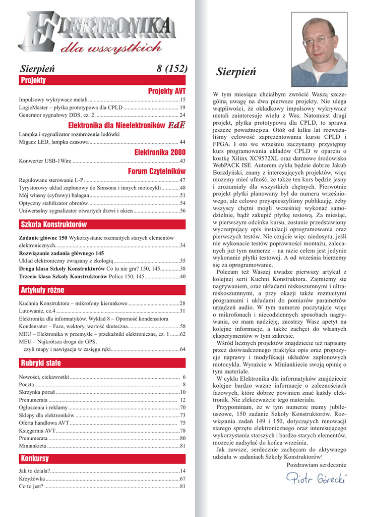 8 (152) Sierpień Projekty Projekty AVT Impulsowy wykrywacz metali .................................................................15 LogicMaster – płytka prototypowa dla CPLD ....................................... 19 Generator sygnałowy DDS, cz. 2 ........................................................... 24 Elektronika dla Nieelektroników Lampka i sygnalizator rozmrożenia lodówki Migacz LED, lampka czasowa ............................................................... 44 Elektronika 2000 Konwerter USB-1Wire ............................................................................43 Forum Czytelników Regulowane sterowanie L-P ................................................................... 47 Tyrystorowy układ zapłonowy do Simsona i innych motocykli .............48 Mój własny (cyfrowy) bałagan ................................................................51 Optyczny stabilizator obrotów .................................................................54 Uniwersalny sygnalizator otwartych drzwi i okien .................................56 Szkoła Konstruktorów Zadanie główne 150 Wykorzystanie rozmaitych starych elementów elektronicznych. .......................................................................................34 Rozwiązanie zadania głównego 145 Układ elektroniczny związany z ekologią ...............................................35 Druga klasa Szkoły Konstruktorów Co tu nie gra? 150, 145..............38 Trzecia klasa Szkoły Konstruktorów Policz 150, 145 .........................40 Artykuły różne Kuchnia Konstruktora – mikrofony kierunkowe .....................................28 Lutowanie, cz.4 .........................................................................................31 Elektronika dla informatyków. Wykład 8 – Oporność kondensatora Kondensator – Faza, wektory, wartość skuteczna.....................................58 MEU – Elektronika w przemyśle – przekaźniki elektroniczne, cz. 1 .......62 MEU – Najkrótsza droga do GPS, czyli mapy i nawigacja w zasięgu ręki.................................................64 Rubryki stałe Nowości, ciekawostki .............................................................................. 6 Poczta ....................................................................................................... 8 Skrzynka porad ........................................................................................10 Prenumerata ........................................................................................... 12 Ogłoszenia i reklamy ...............................................................................70 Sklepy dla elektroników ..........................................................................73 Oferta handlowa AVT ............................................................................ 75 Księgarnia AVT........................................................................................78 Prenumerata .............................................................................................80 Miniankieta ..............................................................................................81 Konkursy Jak to działa?............................................................................................14 Krzyżówka ...............................................................................................67 Co to jest? ................................................................................................81 Sierpień W tym miesiącu chciałbym zwrócić Waszą szczególną uwagę na dwa pierwsze projekty. Nie ulega wątpliwości, że okładkowy impulsowy wykrywacz metali zainteresuje wielu z Was. Natomiast drugi projekt, płytka prototypowa dla CPLD, to sprawa jeszcze poważniejsza. Otóż od kilku lat rozważaliśmy celowość zaprezentowania kursu CPLD i FPGA. I oto we wrześniu zaczynamy przystępny kurs programowania układów CPLD w oparciu o kostkę Xilinx XC9572XL oraz darmowe środowisko WebPACK ISE. Autorem cyklu będzie dobrze Jakub Borzdyński, znany z interesujących projektów, więc możemy mieć ufność, że także ten kurs będzie jasny i zrozumiały dla wszystkich chętnych. Pierwotnie projekt płytki planowany był do numeru wrześniowego, ale celowo przyspieszyliśmy publikację, żeby wszyscy chętni mogli wcześniej wykonać samodzielnie, bądź zakupić płytkę testową. Za miesiąc, w pierwszym odcinku kursu, zostanie przedstawiony wyczerpujący opis instalacji oprogramowania oraz pierwszych testów. Nie czujcie więc niedosytu, jeśli nie wykonacie testów poprawności montażu, zalecanych już tym numerze – na razie celem jest jedynie wykonanie płytki testowej. A od września bierzemy się za oprogramowanie. Polecam też Waszej uwadze pierwszy artykuł z kolejnej serii Kuchni Konstruktora. Zajmiemy się nagrywaniem, oraz układami niskoszumnymi i ultraniskoszumnymi, a przy okazji także rozmaitymi programami i układami do pomiarów parametrów urządzeń audio. W tym numerze poczytajcie więc o mikrofonach i niecodziennych sposobach nagrywania, co mam nadzieję, zaostrzy Wasz apetyt na kolejne informacje, a także zachęci do własnych eksperymentów w tym zakresie. Wśród licznych projektów znajdziecie też napisany przez doświadczonego praktyka opis oraz propozycje naprawy i modyfikacji układów zapłonowych motocykla. Wyraźcie w Miniankiecie swoją opinię o tym materiale. W cyklu Elektronika dla informatyków znajdziecie kolejne bardzo ważne informacje o zaleznościach fazowych, które dobrze powinien znać każdy elektronik. Nie zlekceważcie tego materiału. Przypominam, że w tym numerze mamy jubileuszowe, 150 zadanie Szkoły Konstruktorów. Rozwiązania zadań 149 i 150, dotyczących renowacji starego sprzętu elektronicznego oraz interesującego wykorzystania starszych i bardzo starych elementów, możecie nadsyłać do końca września. Jak zawsze, serdecznie zach
