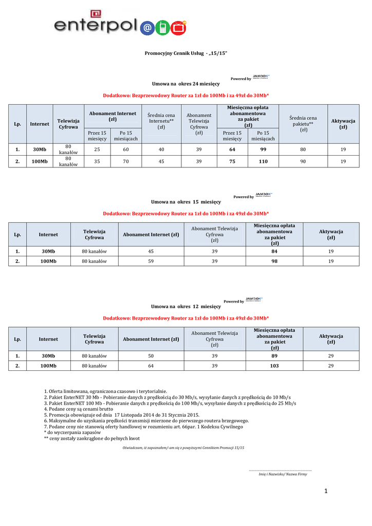 Promocyjny Cennik Usług - „15/15” Powered by Umowa na okres 24 miesięcy Dodatkowo: Bezprzewodowy Router za 1zł do 100Mb i za 49zł do 30Mb* Lp. Internet 1. 30Mb 2. 100Mb Telewizja Cyfrowa 80 kanałów 80 kanałów Abonament Internet (zł) Średnia cena Internetu** (zł) Przez 15 miesięcy Po 15 miesiącach 25 60 40 35 70 45 Miesięczna opłata abonamentowa za pakiet (zł) Abonament Telewizja Cyfrowa (zł) Średnia cena pakietu** (zł) Aktywacja (zł) Przez 15 miesięcy Po 15 miesiącach 39 64 99 80 19 39 75 110 90 19 Powered by Umowa na okres 15 miesięcy Dodatkowo: Bezprzewodowy Router za 1zł do 100Mb i za 49zł do 30Mb* Lp. Internet Telewizja Cyfrowa Abonament Internet (zł) Abonament Telewizja Cyfrowa (zł) Miesięczna opłata abonamentowa za pakiet (zł) Aktywacja (zł) 1. 30Mb 80 kanałów 45 39 84 19 2. 100Mb 80 kanałów 59 39 98 19 Miesięczna opłata abonamentowa za pakiet (zł) Aktywacja (zł) Powered by Umowa na okres 12 miesięcy Dodatkowo: Bezprzewodowy Router za 1zł do 100Mb i za 49zł do 30Mb* Abonament Internet (zł) Abonament Telewizja Cyfrowa (zł) Lp. Internet Telewizja Cyfrowa 1. 30Mb 80 kanałów 50 39 89 29 2. 100Mb 80 kanałów 64 39 103 29 1. Oferta limitowana, ograniczona czasowo i terytorialnie. 2. Pakiet EnterNET 30 Mb - Pobieranie danych z prędkością do 30 Mb/s, wysyłanie danych z prędkością do 10 Mb/s 3. Pakiet EnterNET 100 Mb - Pobieranie danych z prędkością do 100 Mb/s, wysyłanie danych z prędkością do 25 Mb/s 4. Podane ceny są cenami brutto 5. Promocja obowiązuje od dnia 17 Listopada 2014 do 31 Stycznia 2015. 6. Maksymalne do uzyskania prędkości transmisji mierzone do pierwszego routera brzegowego. 7. Podane ceny nie stanowią oferty handlowej w rozumieniu art. 66par. 1 Kodeksu Cywilnego * do wyczerpania zapasów ** ceny zostały zaokrąglone do pełnych kwot Oświadczam, iż zapoznałem/-am się z powyższymi Cennikiem Promocji 15/15 ……………………………………………………………. Imię i Nazwisko/ Nazwa Firmy 1 Promocyjny Cennik Usług - „15/15” Powered by Umowa na okres 24 miesięcy Dodatkowo: Bezprzewodowy Router za 1zł do 100Mb i za 49zł do 30Mb* Lp. Internet Telefon 1. 30Mb 200 min 2. 100Mb 200 min Telewizja Cyfrowa 80 kanałów 80 kanałów Abonament Internet (zł) Abonament Telefon (zł) Przez 15 miesięcy Po 15 miesiącach 25 60 10 35 70 10 Abonament Telewizja Cyfrowa (zł) Miesięczna opłata abonamentowa za pakiet (zł) Średnia cena pakietu** (zł) Aktywacja (zł) Przez 15 miesięcy Po 15 miesiącach 39 74 109 90 19 39 85 120 100 19 Powered by Umowa na okres 15 miesięcy Dodatkowo: Bezprzewodowy Router za 1zł do 100Mb i za 49zł do 30Mb* Abonament Internet (zł) Abonament Telefon (zł) Abonament Telewizja Cyfrowa (zł) Miesięczna opłata abonamentowa za pakiet (zł) Aktywacja (zł) Lp. Internet Telefon Telewizja Cyfrowa 1. 30Mb 200 min 80 kanałów 45 10 39 94 19 2. 100Mb 200 min 80 kanałów 59 10 39 98 19 Powered by Umowa na okres 12 miesięcy Dodatkowo: Bezprzewodowy Router za 1zł do 100Mb i za 49zł do 30Mb* Abonament Internet (zł) Abonament Telefon (zł) Abonament Telewizja Cyfrowa (zł) Miesięczna opłata abonamentowa za pakiet (zł) Aktywacja (zł) Lp. Internet Telefon Telewizja Cyfrowa 1. 30Mb 200 min 80 kanałów 50 10 39 94 29 2. 100Mb 200 min 80 kanałów 64 10 39 98 29 1. Oferta limitowana, ograniczona czasowo i terytorialnie. 2. Pakiet EnterNET 30 Mb - Pobieranie danych z prędkością do 30 Mb/s, wysyłanie danych z prędkością do 10 Mb/s 3. Pakiet EnterNET 100 Mb - Pobieranie danych z prędkością do 100 Mb/s, wysyłanie danych z prędkością do 25 Mb/s 4. Podane ceny są cenami brutto 5. Promocja obowiązuje od dnia 17 Listopada 2014 do 31 Stycznia 2015. 6. Maksymalne do uzyskania prędkości transmisji mierzone do pierwszego routera brzegowego. 7. Podane ceny nie stanowią oferty handlowej w rozumieniu art. 66par. 1 Kodeksu Cywilnego * do wyczerpania zapasów ** ceny zostały zaokrąglone do pełnych kwot Oświadczam, iż zapoznałem/-am się z powyższymi Cennikiem Promocji 15/15 ……………………………………………………………. Imię i Nazwisko/ Nazwa Firmy 2