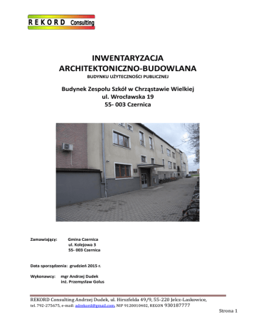 INWENTARYZACJA ARCHITEKTONICZNO-BUDOWLANA BUDYNKU UŻYTECZNOŚCI PUBLICZNEJ Budynek Zespołu Szkół w Chrząstawie Wielkiej ul. Wrocławska 19 55- 003 Czernica Zamawiający: Gmina Czernica ul. Kolejowa 3 55- 003 Czernica Data sporządzenia: grudzień 2015 r. Wykonawcy: mgr Andrzej Dudek inż. Przemysław Golus REKORD Consulting Andrzej Dudek, ul. Hirszfelda 49/9, 55-220 Jelcz-Laskowice, tel. 792-275675, e-mail: [email protected], NIP 9120010402, REGON 930187777 Strona 1 SPIS ZAWARTOŚCI INWENTARYZACJI ARCHITEKTONICZNO-BUDOWLANEJ Budynku Zespołu Szkół w Chrząstawie Wielkiej, ul. Wrocławska 19 I. II. III. IV. STRONA TYTUŁOWA OPIS BUDYNKU INWETARYZOWANEGO ZESTAWIENIE POMIESZCZEŃ I ICH POWIERZCHNI CZĘŚĆ GRAFICZNA INWETARYZACJI ARCHITEKTONICZNOBUDOWLANEJ: 1. rzut przyziemia – skala 1:100 2. rzut parteru – skala 1:100 3. rzut piętra – skala 1:100 4. przekrój A-A – skala 1:100 5. przekrój B-B – skala 1:100 6. elewacja południowa - skala 1:100 7. elewacja wschodnia - skala 1:100 8. elewacja północna - skala 1:100 9. elewacja zachodnia - skala 1:100 10. rzut dachu - skala 1:100 REKORD Consulting Andrzej Dudek, ul. Hirszfelda 49/9, 55-220 Jelcz-Laskowice, tel. 792-275675, e-mail: [email protected], NIP 9120010402, REGON 930187777 Strona 2 OPIS TECHNICZNY do inwentaryzacji architektoniczno-budowlanej 1. Wstęp Przedmiotem opracowania jest Inwentaryzacja architektoniczno - budowlana budynku zlokalizowanego w Chrząstawie Wielkiej przy ul. Wrocławskiej 19, gmina Czernica, powiat wrocławski, woj. Dolnośląskie. 2. Podstawa formalna opracowania Zlecenie nr GKiI.271.1.146.2015.KM z dnia 22.10. 2015 3. Zakres opracowania Opis istniejącego stanu technicznego budynku wraz z wykonaniem inwentaryzacji architektoniczno–budowlanej. 4. Materiały i badania wykorzystane w opracowaniu - inwentaryzacja budynku, przeprowadzenie pomiarów - przeprowadzenie oględzin zewnętrznych i wewnętrznych budynku - wykonanie odkrywek elementów konstrukcyjnych - dokumentacja fotograficzna 5. Opis techniczny budynku 5.1 Lokalizacja: Budynek znajduje się w miejscowości Chrząstawa Wielka przy ul. Wrocławskiej 19. 5.2 Część ogólna: Istniejący budynek jest obiektem wolnostojącym wzniesionym w technologii tradycyjnej, wielokrotnie rozbudowywanym i przebudowywanym . Obiekt składa się z trzech segmentów (2 segmenty z pomieszczeniami dydaktycznymi i 1 segment, w którym mieści się sala gimnastyczna z zapleczem oraz pomieszczenia techniczne. Budynek składa się z przyziemia i dwóch kondygnacji nadziemnych. Budynek posiada pięć wejść: wejście główne od strony wschodniej, trzy wejścia od strony zachodniej i po jednym wejściu od strony południowej (wiatrołap) i północnej (drzwi techniczne kotłowni). Wymiary zewnętrzne budynku w przyziemiu: - ściana elewacji południowej – 17m - ściana elewacji wschodniej i zachodniej - 66,20m - ściana elewacji południowej – 21,60m Powierzchnia zabudowy: 1.223,05 m² Obwód: 178,50 m Powierzchnia użytkowa: 2866,20 m² REKORD Consulting Andrzej Dudek, ul. Hirszfelda 49/9, 55-220 Jelcz-Laskowice, tel. 792-275675, e-mail: [email protected], NIP 9120010402, REGON 930187777 Strona 3 Wysokość pomieszczeń: - przyziemie: 2,50 m i 3,40 m - parter: 3,25 m i 3,30 m - piętro: 3,25 m i 3,40 m - sala gimnastyczna: 8,00 m 5.3 Dane techniczne budynku Budynek wyposażony jest w instalacje: - elektryczną - telefoniczną (w wybranych pomieszczeniach) - odgromową - wodną (woda zimna doprowadzana z sieci komunalnej) - instalacja kanalizacji sanitarnej (odprowadzana do sieci komunalnej) - centralnego ogrzewania (kotłownia lokalna w budynku) - ciepłej wody użytkowej (kotłownia lokalna w budynku) 5.4 Opis konstrukcji budynku 5.4.1 Fundamenty Fundamenty betonowe. 5.4.2 Ściany Ściany zewnętrzne przyziemia w gruncie wykonane z cegły ceramicznej gr. 50 cm. Ściany zewnętrzne elewacyjne z cegły pełnej gr. 45cm w segmencie A nieotynkowane na zewnątrz. Ściany wewnętrzne z cegły ceramicznej o różnej grubości oraz gipsowo-kartonowe. Wykończenie ścian - tynki cementowowapienne. 5.4.3 Stropy, stropodachy Stropy Akermana gr. 35 cm wsparte na ścianach, a nad salą gimnastyczną stropodach żelbetowy płaski (płyta WPS – 12 cm) na dźwigarach stalowych. 5.4.4 Schody Zewnętrzne w elewacji zachodniej dwubiegowe betonowe. Wewnętrzne dwie klatki schodowe z piwnicy na I piętro, jedna od strony wschodniej, druga od strony zachodniej elewacji – schody dwubiegowe żelbetowe. 5.4.5 Podłogi i posadzki W kondygnacji przyziemia – zagłębiona podłoga na gruncie, posadzki betonowe oraz parkiet drewniany (pomieszczenia dydaktyczne i biblioteka) oraz gres na korytarzach i pomieszczeniach sanitarnych. Podłoga małej sali gimnastycznej w przyziemiu z nawierzchnią specjalną. Na poszczególnych kondygnacjach w pomieszczeniach na parterze i piętrze podłogi drewniane (parkiet) w salach lekcyjnych i pomieszczeniach administracyjnych, na korytarzach i w pomieszczeniach sanitarnych posadzki wykończone płytkami ceramicznymi. REKORD Consulting Andrzej Dudek, ul. Hirszfelda 49/9, 55-220 Jelcz-Laskowice, tel. 792-275675, e-mail: [email protected], NIP 9120010402, REGON 930187777 Strona 4 5.4.6 Stolarka okienna i drzwiowa Okna dwuszybowe w ramie PVC o śr. wsp. U= 1,6 W/m²K . W pomieszczeniach przyziemia (kotłownia i pomieszczenia gospodarcze) okna stare w ramie PVC o wsp. U=2,5 W/m²K, w pomieszczeniu małej sali gimnastycznej i jej zaplecza nowe okna dwuszybowe w ramie PVC o wsp. U=1,3 W/m²K z nawiewnikami. Stolarka drzwiowa – główne drzwi wejściowe w elewacji wschodniej w ramie aluminiowej oszklone dwuskrzydłowe o wsp. U=1,9 W/m²K. Pozostałe drzwi zewnętrzne jednoskrzydłowe, od strony zachodniej drzwi stalowe o wsp. U=3,0 W/m²K, nowe drzwi w ramie aluminiowej oszklone o wsp. U= 1,9 W/m²K oraz drzwi stare drewniane o wsp. U=3 W/m²K. W elewacji północnej stare stalowe drzwi techniczne do kotłowni i wrzutnia stalowa o wsp. U=4,0 W/m²