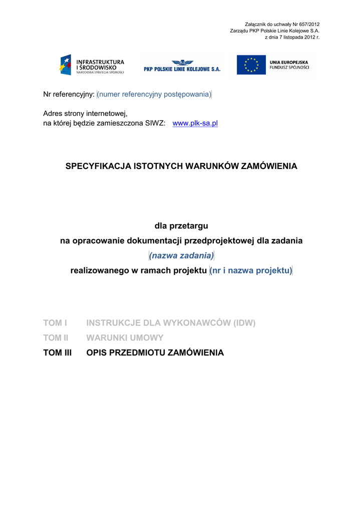 Załącznik do uchwały Nr 657/2012 Zarządu PKP Polskie Linie Kolejowe S.A. z dnia 7 listopada 2012 r. Nr referencyjny: (numer referencyjny postępowania) Adres strony internetowej, na której będzie zamieszczona SIWZ: www.plk-sa.pl SPECYFIKACJA ISTOTNYCH WARUNKÓW ZAMÓWIENIA dla przetargu na opracowanie dokumentacji przedprojektowej dla zadania (nazwa zadania) realizowanego w ramach projektu (nr i nazwa projektu) TOM I INSTRUKCJE DLA WYKONAWCÓW (IDW) TOM II WARUNKI UMOWY TOM III OPIS PRZEDMIOTU ZAMÓWIENIA Opis Przedmiotu Zamówienia dla przetargu na opracowanie dokumentacji przedprojektowej dla (nazwa zadania) Sporządzono na podstawie dokumentu bazowego: 009011_2012_3 w. 1.0. 009011_2012_3_w_1.0. z dnia 25.10.2012 (zastąpić numerem referencyjnym postępowania) Strona 2 z 24 Opis Przedmiotu Zamówienia dla przetargu na opracowanie dokumentacji przedprojektowej dla (nazwa zadania) Spis treści LISTA SKRÓTÓW .............................................................................................. 4 PODSTAWOWE INFORMACJE O PROJEKCIE ............................................... 4 1. 2. 2.1. 2.2. 2.3. 2.4. 3. Zamawiający .......................................................................................................................... 4 Informacje wprowadzające..................................................................................................... 4 Struktura Projektu .................................................................................................................. 5 Obecny stan linii kolejowej objętej Projektem ........................................................................ 5 CELE PROJEKTU .............................................................................................. 5 3.1. 3.2. Ogólne cele Projektu .............................................................................................................. 5 Bezpośrednie cele Projektu ................................................................................................... 5 OPIS ZADAŃ ...................................................................................................... 5 4. 4.1. Ogólne wymagania w odniesieniu do wykonania zadań ....................................................... 5 4.1.1. Założenia dla wykonania przedsięwzięcia .................................................................... 7 4.1.2. Powiązanie z innymi projektami .................................................................................... 7 4.1.3. Elementy ryzyka ............................................................................................................ 8 4.2. Wymagania szczególne ......................................................................................................... 8 4.2.1. Raport przejściowy ........................................................................................................ 9 4.2.2. Prognozy społeczno-gospodarcze i analizy rynku usług transportowych ..................... 9 4.2.3. Analizy ruchowo-marketingowe ................................................................................... 10 4.2.4. Analiza stanu istniejącego infrastruktury kolejowej ..................................................... 11 4.2.5. Analiza kosztów i korzyści (AKK) ................................................................................ 12 4.2.6. Aspekty środowiskowe ................................................................................................ 14 4.2.7. Wniosek o dofinansowanie Projektu ........................................................................... 14 4.3. Dostępne dokumenty ........................................................................................................... 14 5. PRODUKTY ...................................................................................................... 15 5.1. 5.2. 6. 7. 8. 9. 10. Zawartość ............................................................................................................................. 15 Sposób dostarczenia/przekazania ....................................................................................... 15 KOORDYNACJA .............................................................................................. 17 LOGISTYKA I PROWADZENIE PRAC ............................................................. 18 HARMONOGRAM ORAZ OCZEKIWANE ZAANGAŻOWANIE PERSONELU 19 WYMAGANE KWALIFIKACJE I DOŚWIADCZENIE ....................................... 20 WYKAZ AKTÓW PRAWNYCH ..................................................................... 21 009011_2012_3_w_1.0. z dnia 25.10.2012 (zastąpić numerem referencyjnym postępowania) Strona 3 z 24 Opis Przedmiotu Zamówienia dla przetargu na opracowanie dokumentacji przedprojektowej dla (nazwa zadania) 1. LISTA SKRÓTÓW PKP PLK S.A. – PKP Polskie Linie Kolejowe S.A., SIWZ – Specyfikacja Istotnych Warunków Zamówienia dla niniejszego postępowania, POIiŚ – Program Operacyjny Infrastruktura i Środowisko, IR – PKP Polskie Linie Kolejowe S.A. – Centrum Realizacji Inwestycji, IRO – PKP Polskie Linie Kolejowe S.A. – Oddział Centrum Realizacji Inwestycji, IZ – PKP Polskie Linie Kolejowe S.A. – Zakład Linii Kolejowych. PKP S.A. – Polskie Koleje Państwowe S.A., CPV – Wspólny Słownik Zamówień (Common Procurement Vocabulary), TEN-T – Transeuropejska Sieć Transportowa, UE – Unia Europejska, UTK – Urząd Transportu Kolejowego (poprzednio GIK), FIDIC – Międzynarodowa Federacja Inżynierów Konsultantów, UIC – Międzynarodowy Związek Kolejowy, KE – Komisja Europejska, CUPT – Centrum Unijnych Projektów Transportowych MTBiGM – Ministerstwo Transportu, Budownictwa i Gospodarki Morskiej MRR – Ministerstwo Rozwoju Regionalnego, ZOPI – Zespół Oceny Projektów Inwestycyjnych, TSI – Techniczna Specyfikacja Interoperacyjności, JASPERS – Joint Assistance to Support Projects in European Regions 2. 