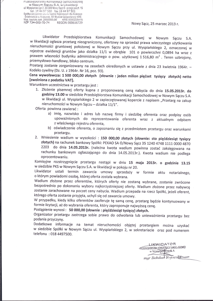 r l 1Eu5lęUlUl 5tWU r\Ul l l uI l lKaUJl Jal l lUtjl luuUWtsJ W Nowym Sączu S.A' W Likwidacji ul. Wyspiański0go 2. 33-306 Novl-v SącZ 8 _ prŻeo 500 r' poczt. ] 5 fax 18 44 97 50I -o7 Spółka zartljcsiror',.ll],j \'' slą(IzIe Rejonol.lynl dla Krakowar,'' Krakoiorte. Xll Wydział Gospodarcz! KRS srÓdn']i€Ścia Wys' kapitału zakł.2850000,00 KRS 0000225415 NIP tel. 18 44 734-000-70-74 REGON 000616729 Nowy Sącz, 25 marzec 2013 Likwidator Przedsiębiorstwa Komunikacji Samochodowej r. W Nowym Sączu S'A. w likwidacji ogłasza przetarg nieograniczony, ofertowy na sprzedaż prawa Wieczystego użytkowania nieruchomości gruntowej położonej w Nowym Sączu przy ul. Wyspiańskiego 2, oznaczonej w rejestrze ewidencji gruntóW jako działka 7I/7 w obrębie 101 o powierzchni o,o894 ha wraz z prawem własnościbudynku administracyjnego o pow' użytkowej 1516,80 m' . Teren uzbrojony, przemysłowo-handlowy, blisko centrum. Przetarg zostanie zorganizowany na zasadach określonych w ustawie z dnia 23 kwietnia 7964r. _ Kodeks cywilny (Dz. U. z t964r. Nr 16, poz. 93). Cena wywoławcza: 1500 ooo,o0 złotych (słownie : jeden milion pięćset tysięcy złotych) netto [zwolniona z podatku VAT]. Warunkiem uczestnictwa w przetargu jest : !. Złożenie pisemnej oferty kupna z proponowaną ceną nabycia do dnia 15.05.2013r. do godziny 13.00 w siedzibie Przedsiębiorstwa Komunikacji Samochodowej w Nowym Sączu S.A. w likwidacji ul. Wyspiańskiego 2 w zapieczętowanej kopercie z napisem ,,Przetarg na zakup nieruchomości w Nowym Sączu _ działka 1'I/1". oferta powinna zawierać : a) imię, nazwisko i adres lub nazwę firmy i siedzibę oferenta oraz podpisy osób upowaznionych do reprezentowania oferenta wraz z aktualnym odpisem z właściwegorejestru oferenta, b) oświadczenie oferenta, o Zapoznaniu się z przedmiotem przetargu oraz warunkami 2. przetargu. Wniesienie wadium w wysokości : 150 ooo,oo złotych (słownie: sto pięćdziesiąt Ęsięcy złotych) na rachunek bankowy Spółki: PEKAo SA o/Nowy Sącz 35 L24o 4748 1111 oooo 4870 2203 do dnia 14.05.2013r. (należna kwota wadium powinna zostać zaksięgowana na rachunku bankowym ogłaszającego do dnia 1-4.o5'2ol3r.). Kwota wadium nie podlega oprocentowaniu. Komisyjne rozstrzygnięcie przetargu nastąpi W dniu 15 maja 2o:.|3r. o godzinie 13.15 w siedzibie PKS w Nowym Sączu S.A. w likwidacjiw pokoju nr 20. Likwidator ustali termin zawarcia umowy sprzedaży o którym powiadomiosobę, której oferta została wybrana. W formie aktu notarialnego, Wadium złożone przez oferentów, których oferty nie zostaną wybrane, zostanie zwrócone bezpośrednio po dokonaniu wyboru najkorzystniejszej oferty. Wadium złożoneprzez nabywcę zostanie zarachowane na poczet ceny nabycia. Wadium przepada na rzecz Spółki, jeżeli oferent, którego oferta zostanie przyjęta, uchylisię od zawarcia umowy. W przypadku, kiedy kilku oferentów zaoferuje tę samą cenę, przetarg będzie kontynuowany w formie licytacji, aż do wybrania oferenta, który zaproponuje najwyższą cenę. Postąpienie wynosi : 50 000,00 (słownie : pięćdziesiąt tysięcy) złoĘch. organizator przetargu zastrzega sobie prawo do odwołania lub unieważnienia przetargu bez podania przyczyny. Dodatkowe informacje na temat nieruchomości objętej przetargiem można uzyskać w siedzibie Spółki w Nowym Sączu ul. Wyspiańskiego 2, w sekretariacie oraz pod numerem telefonu :078 44975OO.