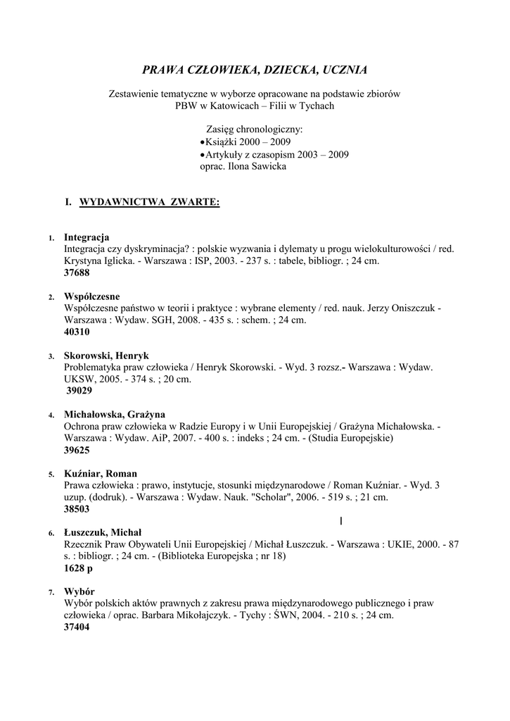 PRAWA CZŁOWIEKA, DZIECKA, UCZNIA Zestawienie tematyczne w wyborze opracowane na podstawie zbiorów PBW w Katowicach – Filii w Tychach Zasięg chronologiczny: Książki 2000 – 2009 Artykuły z czasopism 2003 – 2009 oprac. Ilona Sawicka I. WYDAWNICTWA ZWARTE: 1. 2. 3. 4. 5. 6. 7. Integracja Integracja czy dyskryminacja? : polskie wyzwania i dylematy u progu wielokulturowości / red. Krystyna Iglicka. - Warszawa : ISP, 2003. - 237 s. : tabele, bibliogr. ; 24 cm. 37688 Współczesne Współczesne państwo w teorii i praktyce : wybrane elementy / red. nauk. Jerzy Oniszczuk Warszawa : Wydaw. SGH, 2008. - 435 s. : schem. ; 24 cm. 40310 Skorowski, Henryk Problematyka praw człowieka / Henryk Skorowski. - Wyd. 3 rozsz.- Warszawa : Wydaw. UKSW, 2005. - 374 s. ; 20 cm. 39029 Michałowska, Grażyna Ochrona praw człowieka w Radzie Europy i w Unii Europejskiej / Grażyna Michałowska. Warszawa : Wydaw. AiP, 2007. - 400 s. : indeks ; 24 cm. - (Studia Europejskie) 39625 Kuźniar, Roman Prawa człowieka : prawo, instytucje, stosunki międzynarodowe / Roman Kuźniar. - Wyd. 3 uzup. (dodruk). - Warszawa : Wydaw. Nauk. "Scholar", 2006. - 519 s. ; 21 cm. 38503 | Łuszczuk, Michał Rzecznik Praw Obywateli Unii Europejskiej / Michał Łuszczuk. - Warszawa : UKIE, 2000. - 87 s. : bibliogr. ; 24 cm. - (Biblioteka Europejska ; nr 18) 1628 p Wybór Wybór polskich aktów prawnych z zakresu prawa międzynarodowego publicznego i praw człowieka / oprac. Barbara Mikołajczyk. - Tychy : ŚWN, 2004. - 210 s. ; 24 cm. 37404 8. Kontakty Kontakty z ludźmi "Innymi" jako problem wychowania, opieki i resocjalizacji / red.Bogumiła Kosek-Nita, Danuta Raś. - Wyd. 2 popr. - Katowice : Wydaw. UŚ, 2007. - 169 s. : bibliogr., ind., aneks ; 24 cm. – (Podręczniki i Skrypty UŚ ; nr 88) Zawiera : Rozwój praw człowieka w teorii i praktyce społecznej. 40270 9. Mednis, Arwid Ustawa o ochronie danych osobowych : komentarz [stan prawny na dzień 15 marca 2001 r.] / Arwid Mednis. - Wyd. 2. - Warszawa : Wydaw. Prawnicze, 2001. - 166 s. ; 21 cm. 36803 10. Preece, Jennifer Jackson Prawa mniejszości / Jennifer Jackson Preece. - Warszawa : Wydaw. Sic!, 2007. - 252, [1] s. : bibliogr., ind. ; 21 cm. - (Key Concepts) 40059 11. Kompas Kompas : edukacja o prawach człowieka w pracy z młodzieżą / Patricia Brander i in.. Warszawa : Stowarzyszenie dla Dzieci i Młodzieży SZANSA i CODN, 2005. - 458, [2] s. ; 30 cm. 38884 12. Rudek, Iwona Od niechęci do akceptacji : o wychowaniu dzieci do tolerancji wobec osób niepełnosprawnych / Iwona Rudek. - Wyd. 2. - Kraków : IMPULS, 2008. - 228, [1] s. : tabele, bibliogr. ; 24 cm. 39901 13. Nowak, Anna Zarys prawa dla pedagogów społecznych / Anna Nowak. - Katowice : Wydawnictwo ŚWSZ, 2005. - 122 s. : bibliogr. ; 24 cm. 38746 14. 15. 16. 17. Szkoła Szkoła w nauce i praktyce edukacyjnej / red. Bożena Suchacka. - Kraków : IMPULS, 2006. 24 cm. - T. 2. - 434 s. : wykr. 38827 Osuch, Maciej Prawa człowieka w szkole : niezbędnik Aktywnego Rodzica / Maciej Osuch, Lucyna Bojarska. - Warszawa : Wolters Kluwer Polska Sp., 2008. - 121, [1] s. ; 21 cm. 40215, 40216 Zubrzycka, Elżbieta Dobre i złe sekrety / Elżbieta Zubrzycka. - Gdańsk : GWP, 2008. - 48 s. : il. ; 25 cm. 40242 Jarosz, Ewa Międzynarodowe standardy przeciwdziałania krzywdzeniu dzieci / Ewa Jarosz Warszawa : "Żak", 2008. - 156, [1] s. : bibliogr.; 20 cm. 40279 18. Prawa Prawa dzieci w edukacji / Stuart Hart, Price Cohen, Martha Farrel Erickson, Malfrid Flekkoy; Gdańsk : GWP, 2006. - 254 s. : bibliogr., ind. ; 24 cm. 38793 19. Prawo Prawo dziecka do zdrowia / red. Jadwiga Bińczycka. - Kraków : IMPULS, 2007. - 314 s. : bibliogr. ; 24 cm. Zawiera: Prawa dziecka w perspektywie socjologicznej, Prawo dziecka do zdrowia w krajach misyjnych Afryki Subsaharyjskiej, ze szczególnym uwzględnieniem sytuacji w Kenii, Prawa dziecka hospitalizowanego w świadomości pielęgniarek i pielęgniarzy. 39649 20. 21. 22. 23. Wesołowska, Anna Maria Bezpieczeństwo młodzieży : poradnik prawny / Anna Maria Wesołowska. - Warszawa : Wydaw. Poltex, 2008. - 239 s. ; 24 cm. 40425 Praca Praca socjalna wobec nowych obszarów wykluczenia społecznego : modele teoretyczne, potrzeby praktyki / red. nauk. Kazimiera Wódz, Sabina Pawlas-Czyż. - Toruń : AKAPIT, 2008. - 235 s. ; 23 cm. 40424 Człowiek Człowiek w obliczu prawa / red. nauk. Beata Pastwa-Wojciechowska . – Kraków : IMPULS, 2008. - 309 s. : bibliogr. ; 24 cm. Problemy Problemy etyczne w badaniach i interwencji psychologicznej wobec dzieci i młodzieży / red. nauk. Anna Izabela Brzezińska, Zuzanna Toeplitz. - Warszawa : Wydaw. SWPS "Academica", 2007. -340 s. : tabele, bibliogr. ; 24 cm. Zawiera: Dziecko jako podmiot ochrony prawnej ; Pozycja dziecka w wybranych kodeksach etyczno-zawodowych. 39583 24. Krenz, Armin Zobaczcie, co potrafię : Wychowanie przykładem / Armin Krenz. - Warszawa : Instytut Wydawniczy Pax, 2003. - 134, [1] s. ; 20 cm. - (Wychowanie bez porażek) Zawiera : Prawa dziecka. S. 105. 37118 25. Kwak, Anna Rzeczywistość praw dziecka w rodzinie / Anna Kwak, Andrzej Mościskiem. - Warszawa : Wydawnictwo Akademickie "Żak", 2002. - 201 s. : tabele, bibliogr. ; 21 cm. 36657 26. Pochodzenie Pochodzenie dziecka : polskie regulacje prawne na tle ustawodawstw wybranych państw europejskich / red. Stanisław Leszek Staniczeńko, Magdalena Gołowkin-Hudała. - Opole : Wydaw. UO, 2005. - 121 s. ; 21 cm. 38767 27. Polska Polska szkoła : nauczyciele - uczniowie: studium relacji / red. naukowa Robert Geisler, Janina Kosmala, Karol Nowak. - Częstochowa-Katowice : Wydawnictwo Naukowe "Śląsk", 2000. - 108 : tabele ; 24 cm. 36870 II. ARTYKUŁY Z WYDAWNCTW CIĄGŁYCH: 28. Talarczyk, Małgorzata Prawa i wolności człowieka / Małgorzata Talarczyk // Magazyn Szkolny. - 2005, nr 10, s.8-12 29. Malinowska, Izabela System ochrony prawnej Organizacji Narodów Zjednoczonych / Izabela Malinowska // Społeczeństwo i Polityka. - 2005, nr 2, s. 217-238 30. Malinowska, Izabela Ochrona praw cz