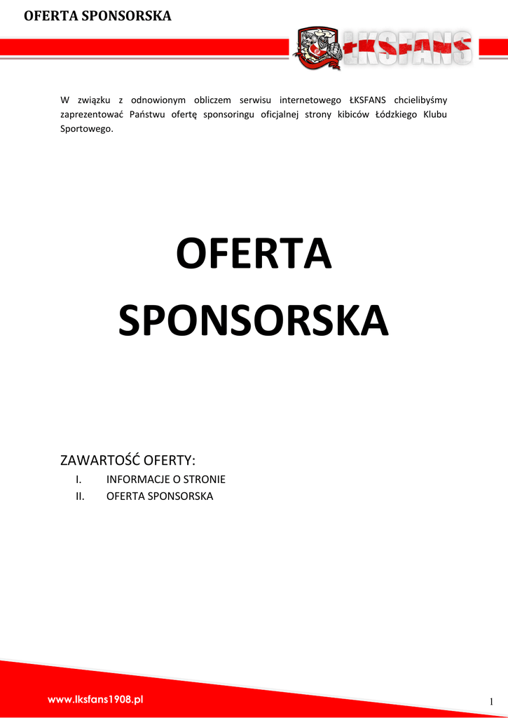 OFERTA SPONSORSKA O W związku z odnowionym obliczem serwisu internetowego ŁKSFANS chcielibyśmy zaprezentować Państwu ofertę sponsoringu oficjalnej strony kibiców Łódzkiego Klubu Sportowego. OFERTA SPONSORSKA ZAWARTOŚĆ OFERTY: I. II. INFORMACJE O STRONIE OFERTA SPONSORSKA www.lksfans1908.pl 1 OFERTA SPONSORSKA O O stronie Witryna www.lksfans1908.pl to kontynuacja najstarszej (istniejącej od lipca 2001 r.) i najczęściej odwiedzanej strony internetowej fanów Łódzkiego Klubu Sportowego. Każdego dnia w serwisie publikowane są wiadomości dotyczące środowiska kibicowskiego skupionego wokół ŁKS-u oraz informacje o wszystkich sekcjach najstarszego stowarzyszenia sportowego w Łodzi – począwszy od piłki nożnej, przez siatkówkę kobiet, na rugby kończąc. W ciągu dziesięciu lat od pojawienia się w Internecie serwis ŁKSFANS zyskał opinię wiarygodnego źródła informacji i stał się głównym medium opiniotwórczym sympatyków ŁKS-u. Przeprowadzone wśród użytkowników w marcu 2009 r. badanie wykazało, że dla 93,99% witryna ŁKSFANS jest głównym źródłem wiedzy o klubie, a 76,29% osób zagląda na stronę przynajmniej raz dziennie. Popularność serwisu dobrze odzwierciedlają również statystyki – strona notuje średnio około 8 milionów odsłon miesięcznie i jest w tym czasie odwiedzana przez blisko 40 tysięcy unikatowych użytkowników. Grupa docelowa Serwis internetowy ŁKSFANS skierowany jest do wszystkich kibiców Łódzkiego Klubu Sportowego. Na podstawie przeprowadzonego w marcu 2009 r. badania osób odwiedzających naszą internetową witrynę udało się uzyskać statystyczny obraz użytkownika serwisu. www.lksfans1908.pl 2 OFERTA SPONSORSKA O Oferta sponsoringu Wybrane korzyści dla Państwa firmy wynikające ze sponsorowania serwisu ŁKSFANS: umocnienie wizerunku firmy wspierającej działania i inicjatywy skupione wokół klubu i kibiców ŁKS-u, zaprezentowanie swojej oferty grupie aktywnej fizycznie i dopasowanej wiekowo do korzystania z usług oferowanych przez Państwa firmę, zdobycie zaufania wśród grupy deklarującej korzystanie z usług marek wspierających środowisko skupione wokół ŁKS-u (56% użytkowników serwisu biorących udział w badaniu, tworząc etos kibica ŁKS, potraktowała zakup produktów kojarzonych z producentami wspierającymi ŁKS jako istotny element kibicowania), uzyskanie poparcia wśród środowiska kibicowskiego stanowiącego duży procent potencjalnych klientów Państwa firmy, możliwość dotarcia do potencjalnego klienta za pomocą zróżnicowanych kanałów reklamowych (strona internetowa, mailing, portale społecznościowe). www.lksfans1908.pl 3 OFERTA SPONSORSKA O Pakiety sponsorskie Świadczenie Sponsor Sponsor Złoty Sponsor Srebrny Główny dostępność pakietów 1 2 2 reklama na łamach serwisu Banner pionowy Banner Button (symbol D) internetowego ŁKSFANS (symbol B) pod poziomy (120x60 px) pod menu z prawej (symbol C) pod menu strony newsami w prawej (maksymalnie (maksymalnie kolumnie strony, 600x160 px) + 550x250 px) czas emisji: banner poziomy czas emisji: 1 miesiąc (symbol A) nad 1 miesiąc newsami (maksymalnie 550 x 50 px) czas emisji: 1 miesiąc mailing o charakterze reklamowym TAK TAK NIE do wszystkich użytkowników strony z ofertą przygotowaną przez sponsora Informacja na temat firmy TAK TAK TAK zamieszczona na oficjalnym profilu strony na Facebooku prawo do sponsoringu tytularnego TAK TAK NIE plebiscytu ŁKSFANS za rok 2012 (+logo sponsora w oficjalnej korespondencji mailowej do użytkowników serwisu informującej o plebiscycie) CENA PAKIETU (netto): 700 zł 500 zł 300 zł Przedstawiony powyżej zakres współpracy jest kwestia otwartą i może podlegać negocjacjom. Jesteśmy skłonni dostosować naszą ofertę do możliwości finansowych oraz oczekiwań sponsora. Chętnie rozważymy Państwa propozycje drogą korespondencyjną lub podczas osobistego spotkania. www.lksfans1908.pl 4 OFERTA SPONSORSKA O SCHEMAT REKLAMOWY: Dziękujemy za zapoznanie się z naszą ofertą oraz zapraszamy do współpracy. www.lksfans1908.pl 5 OFERTA SPONSORSKA O KONTAKT: Redaktor naczelny serwisu internetowego ŁKSFANS Miłosz Łaski tel. 506 182 494 e-mail: [email protected] www.lksfans1908.pl www.lksfans1908.pl 6