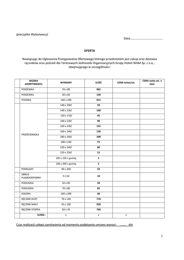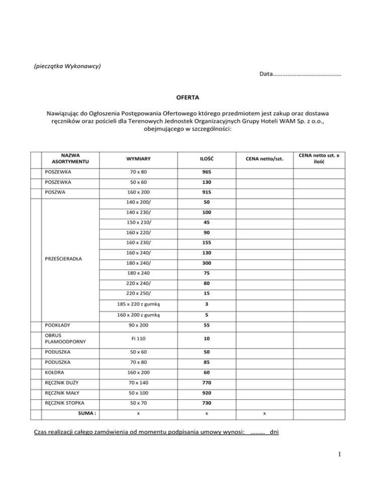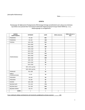 (pieczątka Wykonawcy) Data……………………………………. OFERTA Nawiązując do Ogłoszenia Postępowania Ofertowego którego przedmiotem jest zakup oraz dostawa ręczników oraz pościeli dla Terenowych Jednostek Organizacyjnych Grupy Hoteli WAM Sp. z o.o., obejmującego w szczególności: NAZWA ASORTYMENTU WYMIARY ILOŚĆ POSZEWKA 70 x 80 965 POSZEWKA 50 x 60 130 160 x 200 915 140 x 200/ 50 140 x 230/ 100 150 x 210/ 45 160 x 220/ 90 160 x 230/ 155 160 x 240/ 130 180 x 240/ 300 180 x 240 75 220 x 240/ 80 220 x 250/ 15 185 x 220 z gumką 3 160 x 200 z gumką 5 90 x 200 55 OBRUS PLAMOODPORNY Fi 110 10 PODUSZKA 50 x 60 50 PODUSZKA 70 x 80 85 KOŁDRA 160 x 200 60 RĘCZNIK DUŻY 70 x 140 770 RĘCZNIK MAŁY 50 x 100 920 RĘCZNIK STOPKA 50 x 70 730 x x POSZWA PRZEŚCIERADŁA PODKŁADY SUMA : CENA netto/szt. CENA netto szt. x ilość x Czas realizacji całego zamówienia od momentu podpisania umowy wynosi: ……… dni 1 my, niżej podpisani: ……………………………………………………………………………………………………………………………………………………………………… działający w imieniu i na rzecz (należy podać pełną nazwę i adres Wykonawcy): ……………………………………………………………………………………………………………………………………………………………………… ……………………………………………………………………………………………………………………………………………………………………… adres …………………………………………………………………………………………………………………………………………………… NR KRS/EDG: ……………………………………, REGON: ……………………………………….., NIP: ………………………………, tel.: ………………………………………, fax: ………………………………………, e-mail: ………………………………….., numer konta: …………………………………………………………………………………………………………………………., oferujemy realizację powyższego zamówienia, zgodnie z postanowieniami zawartymi w Wymaganiach Ofertowych oraz w Specyfikacji zamówienia według cen podanych wyżej. kwota podatku VAT ……… % Termin płatności faktur: 21 dni od daty złożenia w siedzibie Spółki poprawnie wystawionych faktur wraz z protokołem odbioru. Oświadczamy, że w ciągu ostatnich trzech lat zrealizowaliśmy trzy zamówienia związanych z przedmiotem zamówienia, o wartości jednorazowej co najmniej 200 000 zł netto. Wykaz w/w zamówień stanowi załącznik do niniejszej Oferty. Oświadczamy, że znajdujemy się w sytuacji finansowej zapewniającej wykonanie przedmiotu Umowy oraz że nie pozostajemy w stanie upadłości ani likwidacji. Oświadczamy, że posiadamy uprawnienia do wykonywania określonej działalności. Oświadczamy, że posiadamy niezbędną wiedzę i doświadczenie oraz dysponujemy potencjałem technicznym i osobami zdolnymi do wykonania zamówienia. Oświadczamy, że zapoznaliśmy się z Wymaganiami Ofertowymi oraz ze Specyfikacją i przyjmujemy je bez zastrzeżeń i uznajemy się za związanych określonymi w nich postanowieniami i zasadami postępowania. Oświadczamy, iż termin związania ofertą jest nie krótszy niż do dnia zawarcia umowy. Oświadczamy, że w przypadku wyboru naszej oferty zobowiązujemy się do zawarcia umowy w miejscu i terminie wyznaczonym przez Grupę Hoteli WAM Sp. z o.o. w Krakowie, o treści zgodnej z załączonym wzorem umowy, z którym się zapoznaliśmy i nie wnosimy do jego treści zastrzeżeń. Oświadczamy, że niezwłocznie po podpisaniu Umowy przedstawimy polisę OC z tytułu prowadzonej działalności gospodarczej na kwotę co najmniej odpowiadającą wartości Umowy. 2 Oświadczamy, że wyrażamy zgodę na przetwarzanie danych osobowych przez Grupę Hoteli WAM Sp. z o.o. w Krakowie, w związku z postępowaniem, którego dotyczy niniejsza Oferta (podst. prawna art. 23 ust. 1 pkt. 1 i 2 oraz art. 24 ustawy z dnia 29.08.1997 r. o ochronie danych osobowych (tekst jednolity Dz. U. z 2002 r. Nr 101 poz. 926 z pózn. zm.). Załącznikami do niniejszej oferty, stanowiącymi jej integralną część są (poświadczone za zgodność: Kosztorys Ofertowy certyfikaty, itp., wskazujące że Wykonawca gwarantuje wymagany poziom jakości przedmiotu oferty, dowód wpłaty wadium, referencje i rekomendacje, odpis z KRS lub EDG, zaświadczenia o numerach REGON i NIP, zaświadczenia z urzędu skarbowego i ZUS, wykaz zamówień zrealizowanych w ciągu ostatnich 3 lat, pełnomocnictwo do złożenia oferty): 1. ……………………………………….. 2. ……………………………………….. 3. ……………………………………….. 4. ……………………………………….. 5. ……………………………………….. 6. ……………………………………….. ……………………………….…………………………………………………………….. (podpisy osób uprawnionych do reprezentowania Wykonawcy) 3
