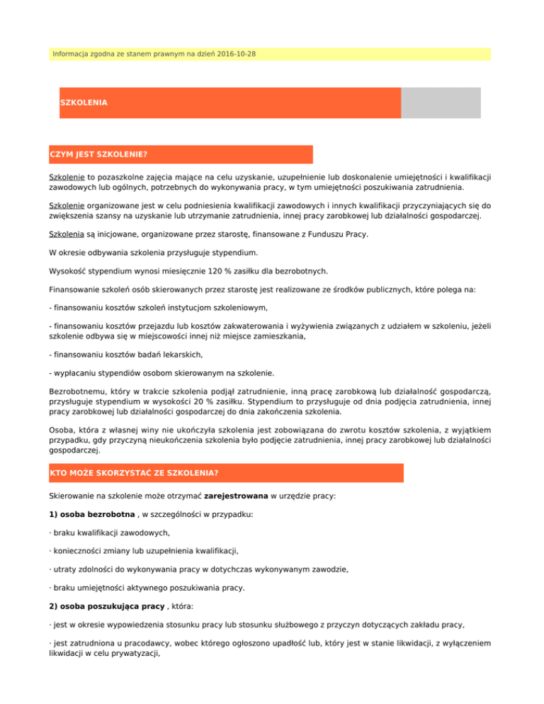 Informacja zgodna ze stanem prawnym na dzień 2016-10-28 SZKOLENIA CZYM JEST SZKOLENIE? Szkolenie to pozaszkolne zajęcia mające na celu uzyskanie, uzupełnienie lub doskonalenie umiejętności i kwalifikacji zawodowych lub ogólnych, potrzebnych do wykonywania pracy, w tym umiejętności poszukiwania zatrudnienia. Szkolenie organizowane jest w celu podniesienia kwalifikacji zawodowych i innych kwalifikacji przyczyniających się do zwiększenia szansy na uzyskanie lub utrzymanie zatrudnienia, innej pracy zarobkowej lub działalności gospodarczej. Szkolenia są inicjowane, organizowane przez starostę, finansowane z Funduszu Pracy. W okresie odbywania szkolenia przysługuje stypendium. Wysokość stypendium wynosi miesięcznie 120 % zasiłku dla bezrobotnych. Finansowanie szkoleń osób skierowanych przez starostę jest realizowane ze środków publicznych, które polega na: - finansowaniu kosztów szkoleń instytucjom szkoleniowym, - finansowaniu kosztów przejazdu lub kosztów zakwaterowania i wyżywienia związanych z udziałem w szkoleniu, jeżeli szkolenie odbywa się w miejscowości innej niż miejsce zamieszkania, - finansowaniu kosztów badań lekarskich, - wypłacaniu stypendiów osobom skierowanym na szkolenie. Bezrobotnemu, który w trakcie szkolenia podjął zatrudnienie, inną pracę zarobkową lub działalność gospodarczą, przysługuje stypendium w wysokości 20 % zasiłku. Stypendium to przysługuje od dnia podjęcia zatrudnienia, innej pracy zarobkowej lub działalności gospodarczej do dnia zakończenia szkolenia. Osoba, która z własnej winy nie ukończyła szkolenia jest zobowiązana do zwrotu kosztów szkolenia, z wyjątkiem przypadku, gdy przyczyną nieukończenia szkolenia było podjęcie zatrudnienia, innej pracy zarobkowej lub działalności gospodarczej. KTO MOŻE SKORZYSTAĆ ZE SZKOLENIA? Skierowanie na szkolenie może otrzymać zarejestrowana w urzędzie pracy: 1) osoba bezrobotna , w szczególności w przypadku: · braku kwalifikacji zawodowych, · konieczności zmiany lub uzupełnienia kwalifikacji, · utraty zdolności do wykonywania pracy w dotychczas wykonywanym zawodzie, · braku umiejętności aktywnego poszukiwania pracy. 2) osoba poszukująca pracy , która: · jest w okresie wypowiedzenia stosunku pracy lub stosunku służbowego z przyczyn dotyczących zakładu pracy, · jest zatrudniona u pracodawcy, wobec którego ogłoszono upadłość lub, który jest w stanie likwidacji, z wyłączeniem likwidacji w celu prywatyzacji, · otrzymuje świadczenie socjalne przysługujące na urlopie górniczym lub górniczy zasiłek socjalny, · uczestniczy w zajęciach w centrum integracji społecznej lub indywidualnym programie integracji, o którym mowa w przepisach o pomocy społecznej, · jest żołnierzem rezerwy, · pobiera rentę szkoleniową, · pobiera świadczenie szkoleniowe, · podlega ubezpieczeniu społecznemu rolników w pełnym zakresie na podstawie przepisów o ubezpieczeniu społecznym rolników jako domownik lub małżonek rolnika, jeżeli zamierza podjąć zatrudnienie, inną pracę zarobkową lub działalność gospodarczą poza rolnictwem, · jest cudzoziemcem posiadającym w RP zezwolenie na pobyt czasowy albo wizę wydaną w celu wykonywania pracy na terytorium RP. 3) pracownik oraz osoba wykonująca inną pracę zarobkową lub działalność gospodarczą w wieku 45 lat i powyżej, które są zainteresowane pomocą w rozwoju zawodowym. KONTAKT KOMÓRKA ORGANIZACYJNA BIURO ROZWOJU ZAWODOWEGO ul. Mazowiecka 21, pok. 37 Z, 30-019 Kraków, TEL. Tel.: (12) 299 74 73 PODSTAWA PRAWNA art. 2, art. 40-42a, art. 43 ustawy z dnia 20 kwietnia 2004 r. o promocji zatrudnienia i instytucjach rynku pracy (tekst jednolity: Dz. U. z 2016 roku, poz. 645 ze zm.) Artykuł utworzono: dn. 2016-10-28, autor: CMS. Artykuł zaktualizowano: dn. 2016-12-29, autor: Michał Słowik. Link do tej strony: http://www.uppk.pl/184 Drukuj, Zapisz jako PDF, wyświetleń strony: 5289 Wydruk strony: www.uppk.pl/4,klienci/13,finansowe-formy-wsparcia/319,podnoszenie-kwalifikacji-zawodowych/184,szkolenia/ Data wydruku: 2017-03-04 08:41:17