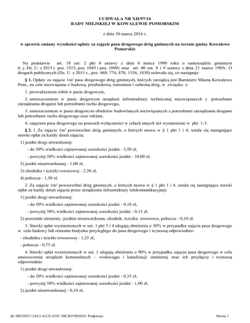 UCHWAŁA NR XII/97/16 RADY MIEJSKIEJ W KOWALEWIE POMORSKIM z dnia 30 marca 2016 r. w sprawie zmiany wysokości opłaty za zajęcie pasa drogowego dróg gminnych na terenie gminy Kowalewo Pomorskie Na podstawie art. 18 ust. 2 pkt 8 ustawy z dnia 8 marca 1990 roku o samorządzie gminnym (t .j. Dz. U. z 2015 r. poz. 1515, poz. 1045 i poz. 1890) oraz art. 40 ust. 8 i 9 ustawy z dnia 21 marca 1985r. O drogach publicznych (Dz. U. z 2015 r., poz. 460, 774, 870, 1336, 1830) uchwala się, co następuje: § 1. Opłaty za zajęcie 1m2 pasa drogowego dróg gminnych, których zarządcą jest Burmistrz Miasta Kowalewo Pom., na cele niezwiązane z budową, przebudową, remontem i ochroną dróg, w związku z: 1. prowadzeniem robót w pasie drogowym, 2. umieszczeniem w pasie drogowym urządzeń infrastruktury technicznej niezwiązanych z potrzebami zarządzania drogami lub potrzebami ruchu drogowego, 3. umieszczeniem w pasie drogowym obiektów budowlanych niezwiązanych z potrzebami zarządzania drogami lub potrzebami ruchu drogowego oraz reklam, 4. zajęciem pasa drogowego na prawach wyłączności w celach innych niż wymienione w pkt 1-3. § 2. 1. Za zajęcie 1m2 powierzchni dróg gminnych, o których mowa w § 1 pkt 1 i 4, ustala się następujące stawki opłat za każdy dzień zajęcia; 1) jezdni drogi utwardzonej: - do 50% wielkości zajmowanej szerokości jezdni - 3,50 zł, - powyżej 50% wielkości zajmowanej szerokości jezdni - 10,00 zł, 2) jezdni nieutwardzonej - 1,00 zł, 3) chodnika i ścieżki rowerowej - 2,50 zł, 4) pobocza - 1,50 zł. 2. Za zajęcie 1m2 powierzchni dróg gminnych, o których mowa w § 1 pkt 1 i 4, ustala się następujące stawki opłat za każdy dzień zajęcia przez urządzenia infrastruktury telekomunikacyjnej: 1) jezdni drogi utwardzonej: - do 50% wielkości zajmowanej szerokości jezdni - 0,10 zł, - powyżej 50% wielkości zajmowanej szerokości jezdni - 0,15 zł, 2) pozostałe elementy: jezdnia nieutwardzona, chodnik, ścieżka rowerowa, pobocze - 0,10 zł. 3. Stawki opłat wymienionych w ust. 1 pkt 3 i 4 ulegają obniżeniu o 50% w przypadku zajęcia pasa drogowego w celu budowy lub remontu budynku przyległego do pasa drogowego i wynoszą odpowiednio: - chodnika i ścieżki rowerowej - 1,25 zł, - pobocza - 0,75 zł. 4. Stawki opłat wymienionych w ust. 1 ulegają obniżeniu o 90% w przypadku zajęcia pasa drogowego w celu umieszczenia urządzeń komunalnych – wodociągu i kanalizacji sanitarnej oraz ich przyłączy i wynoszą odpowiednio: 1) jezdni drogi utwardzonej: - do 50% wielkości zajmowanej szerokości jezdni - 0,35 zł, - powyżej 50% wielkości zajmowanej szerokości jezdni - 1,00 zł, 2) jezdni nieutwardzonej - 0,10 zł, Id: 0B339637-54A3-41CE-855C-98CB359E6034. Podpisany Strona 1 3) chodnika i ścieżki rowerowej - 0,25 zł, 4) pobocza - 0,15 zł. § 3. Zajęcie pasa drogowego, o którym mowa w § 2 ust. 1, 2, 3, i 4 na okres krótszy niż 24 godziny jest traktowane jak zajęcie pasa drogowego przez 1 dzień. § 4. 1. Za zajęcie pasa drogowego, o którym mowa w § 1 pkt 2, ustala się roczne stawki opłat za 1m2 powierzchni pasa drogowego zajętego przez rzut poziomy umieszczonego urządzenia; 1) poza obszarem zabudowanym : - w jezdni - 150,00 zł, - poza jezdnią - 60,00 zł. 2) w obszarze zabudowanym : - w jezdni - 100,00 zł, - poza jezdnią - 40,00 zł. 3) na obiekcie mostowym - 100,00 zł. 2. Za zajęcie pasa drogowego, o którym mowa w § 1 pkt 2, ustala się roczne stawki opłat za 1m2 powierzchni pasa drogowego zajętego przez rzut poziomy umieszczonego urządzenia infrastruktury telekomunikacyjnej; 1) w poprzek drogi - 10,00 zł. 2) wzdłuż drogi: - w jezdni - 5,00 zł, - poza jezdnią - 2,50 zł. 3. Stawki opłat wymienionych w ust. 1 ulegają obniżeniu o 90 % w przypadku zajęcia pasa drogowego w celu umieszczenia urządzeń komunalnych – wodociągu i kanalizacji sanitarnej oraz ich przyłączy i wynoszą odpowiednio: 1) poza obszarem zabudowanym : - w jezdni - 15,00 zł, - poza jezdnią - 6,00 zł. 2) w obszarze zabudowanym : - w jezdni - 10,00 zł, - poza jezdnią - 4,00 zł. 3) na obiekcie mostowym - 10,00 zł. 4. Stawki opłat określone w ust.1, 2 i 3 obejmują pełny rok kalendarzowy umieszczenia urządzenia w pasie drogowym lub na obiekcie mostowym. Za niepełny rok kalendarzowy wysokość rocznych stawek obliczana jest proporcjonalnie do liczby dni umieszczenia urządzenia w pasie drogowym lub na drogowym obiekcie mostowym. § 5. 1. Za zajęcie pasa drogowego, o którym mowa w § 1 pkt 3, ustala się stawki dzienne za zajęcie 1 m2 powierzchni pasa drogowego przez rzut poziomy: 1) obiektu handlowego lub usługowego – 1,00 zł, 2) innych obiektów – 1,00 zł, 3) tymczasowego stoiska handlowego – 2,50 zł, 4) reklamy - 1,50 zł, 5) reklamy świetlne, podświetlane – 2,00 zł. 2. Za zajęcie pasa drogowego, o którym mowa w § 1 pkt 3, ustala się stawki opłat za każdy dzień zajęcia 1m2 powierzchni dla infrastruktury telekomunikacyjnej; 1) w jezdni utwardzonej: Id: 0B339637-54A3-41CE-855C-98CB359E6034. Podpisany Strona 2 - do 50% wielkości zajmowanej szerokości jezdni - 0,10 zł, - powyżej 50% wielkości zajmowanej szerokości jezdni - 0,15 zł, 2) poza jezdnią - 0,10 zł. § 6. Wykonanie uchwały powierza się Burmistrzowi Miasta Kowalewo Pom. § 7. Uchwała wchodzi w życie po upływie 14 dni od dnia jej ogłoszenia w Dzienniku Urzędowym Województwa Kujawsko- Pomorskiego. Przewodniczący Rady Jerzy Orłowski Id: 0B339637-54A3-41CE-855C-98CB359E6034. Podpisany Strona 3 UZASADNIENIE DO UCHWAŁY NR XII/97/16 Rady Miejskiej w Kowalewie Pomorskim z dnia 30 marca 2016 r. Dotychczasowe wysokości opłat za zajęcie pasa drogowego regulowała uchwała nr XVII/144/04 Rady Miejskiej w Kowalewie Pomorskim z dnia 01 grudnia 2004r. Zmiana stawek ma na celu dostosowanie opłat do obecnego stanu dróg w gminie, a także obowiązujących przepisów prawa. Ponadto zmiana stawek konieczna była ze względu na negatywny wp