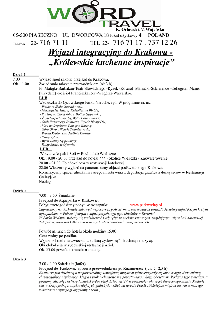 05-500 PIASECZNO TEL/FAX 22- 716 K. Orłowski, V. Wojeńska UL. DWORCOWA 18 lokal użytkowy 4 POLAND 71 11 TEL 22- 716 71 17 , 737 12 26 Wyjazd integracyjny do Krakowa „Królewskie kuchenne inspiracje” Dzień 1 7.00 Ok. 11.00 Wyjazd spod szkoły, przejazd do Krakowa. Zwiedzanie miasta z przewodnikiem (ok 3 h): Pl. Matejki-Barbakan-Teatr Słowackiego -Rynek -Kościół Mariacki-Sukiennice -Collegium Maius (wirydarz) -kościół Franciszkanów -Wzgórze Wawelskie. LUB Wycieczka do Ojcowskiego Parku Narodowego. W programie m. in.: - Pieskowa Skała (zew lub wew); - Maczuga Herkulesa, Kościółek na Wodzie; - Parking na Złotej Górze, Dolina Sąspowska; - Źródełko pod Wierzbą, Wylot Doliny Jamki; - Grób Nieznanego Żołnierza, Wąwóz Błotny Dół; - Most na Sąspówce, Dom pod Koroną; - Góra Okopy, Wąwóz Smardzowocki; - Brama Krakowska, Jaskinia Krowia; - Stawy Rybne; - Wylot Doliny Sąspowskiej; - Ruiny Zamku w Ojcowie; LUB Wizyta w kopalni Soli w Bochni lub Wieliczce. Ok. 19.00 - 20.00 przejazd do hotelu ***, (okolice Wieliczki). Zakwaterowanie. 20.00 - 21.00 Obiadokolacja w restauracji hotelowej. 22.00 Wieczorny wyjazd na panoramiczny objazd podświetlonego Krakowa. Romantyczny spacer uliczkami starego miasta wraz z degustacją grzańca z deską serów w Restauracji Galicyjska. Nocleg. Dzień 2 7.00 - 9.00 Śniadanie. Przejazd do Aquaparku w Krakowie. Pobyt czterogodzinny pobyt w Aquaparku www.parkwodny.pl Zapraszamy na doskonałą zabawę i wypoczynek pośród mnóstwa wodnych atrakcji. Jesteśmy największym krytym aquaparkiem w Polsce i jednym z największych tego typu obiektów w Europie! W Parku Wodnym możemy się zrelaksować i odprężyć w aneksie saunowym, znajdującym się w hali basenowej. Tutaj do wyboru jest kilka saun o różnych właściwościach i temperaturach. Powrót na lunch do hotelu około godziny 15.00 Czas wolny po posiłku. Wyjazd z hotelu na „wieczór z kulturą żydowską” - kuchnią i muzyką. Obiadokolacja w żydowskiej restauracji Ariel. Ok. 23.00 powrót do hotelu na nocleg. Dzień 3 7.00 - 9.00 Śniadanie (bufet). Przejazd do Krakowa, spacer z przewodnikiem po Kazimierzu: ( ok. 2- 2,5 h) Kazimierz jest dzielnicą o niepowtarzalnej atmosferze, miejscem gdzie spotykały się dwie religie, dwie kultury, chrześcijańska i żydowska. Magia i urok tych miejsc nie pozostawiają nikogo obojętnym. Podczas tego zwiedzania poznamy historię i kulturę ludności żydowskiej, która od XV w. zamieszkiwała część ówczesnego miasta Kazimierza, tworząc jedną z najsławniejszych gmin żydowskich na terenie Polski .Ważniejsze miejsca na trasie naszego zwiedzania: (synagogi oglądamy z zewn.): - ul. Szeroka - Stara Synagoga, która jest najstarszą polską synagogą - miejsce, gdzie znajdowała się łaźnia rytualna - synagoga Remuh i cmentarz Remuh - synagoga Wysoka - synagoga Izaaka - synagoga Kupa - pl. Nowy z „Okrąglakiem” - synagoga Tempel Ok. 13.00 Brunch w Restauracji Wierzynek w Krakowie Wierzynek to wyjątkowe miejsce, które zabierze Nas w kulinarną i obyczajową podróż w czasie. Dzieje Restauracji sięgają 1364 roku, kiedy to w Kamienicy przy Rynku Głównym odbyła się najsłynniejsza uczta w historii naszego kraju. Wierzynek, jako jedna z najstarszych restauracji w Europie, słynie z wykwintnej staropolskiej kuchni oraz dbałości o dworski obyczaj. Pomni historii tego magicznego miejsca, staramy się celebrować legendę, która uczyniła z naszej Restauracji symbol Krakowa. Ok. 14.00 Wyjazd z Krakowa. Ok 18.00 - 19.00 Powrót. Świadczenia: - transport lux autokarem z WC, barkiem, dvd, uchylnymi siedzeniami - zakwaterowanie w hotelu*** okolice Wieliczki, pokoje 2, 3-osobowe - wyżywienie: wg programu - opieka pilota - ubezpieczenie Kl 5000 PLN AXA POLSKA - VAT Cena: 390 zł/min 40 os. płacących + degustacja grzańca z deską serów w Restauracji Galicyjska +30 PLN + pobyt w Aquaparku z wejściem do strefy saun +65 PLN + obiad w restauracji żydowskiej Ariel z żydowską muzyką +100 - 120 PLN (uzależnione od menu) + obiad w restauracji Wierzynek +125,00 - 150 PLN (uzależnione od menu) + DODATKOWO BILETY WSTĘPU, ofiary w sanktuariach, przewodnicy miejscowi w zależności od zdeklarowanych punktów programu którymi grupa jest zainteresowana W celu podpisania umowy i rezerwacji konkretnego terminu prosimy o telefon do biura 022 716 71 11 lub 022 716 71 17 lub mail [email protected] Zaliczka konieczna do podpisania umowy: 200 zł/os. Termin, który Państwa interesuje, potwierdzamy po sprawdzeniu dostępności wolnych miejsc w hotelu. Dokonujemy rezerwacji wstępnej na czas zebrania zaliczek (najczęściej nie dłużej niż 4 tyg.). KWOTĘ NA BILETY WSTĘPU POTWIERDZAMY PRZED DOPŁATĄ ZGODNIE Z OBOWIĄZUJĄCYMI CENNIKAMI Wyciąg z warunków uczestnictwa imprez turystycznych organizowanych przez B.P. Word Travel (pełna wersja warunków uczestnictwa dostępna jest u przedstawiciela grupy organizującego wycieczkę): 13. W przypadku rezygnacji lub nie uczestniczenia Uczestnika w wykupionej imprezie Organizator uprawniony jest do potrącenia RZECZYWIŚCIE PONIESIONYCH KOSZTÓW. 14. Zmiana uczestnika nie pociąga za sobą kosztów finansowych. 18. Uczestnik odpowiada za wszelkie szkody materialne wyrządzone w trakcie trwania imprezy (zniszczenia w hotelu, autokarze). 15. Jeżeli w programie jest wyjazd poza granicę Polski - uczestnik winien posiadać na miejscu zbiórki aktualnie obowiązujące dokumenty uprawniające do przekroczenia granic krajów objętych programem imprezy (wyłącznie dowód osobisty lub paszport ważny min. 6 m-cy od daty powrotu). 9 B. W przypadku chorób uznawanych za przewlekłe uczestnik winien na własny koszt wykupić dodatkowe ubezpieczenie ! (dotyczy wycieczek zagranicznych). Klient przez dokonanie wpłaty (całkowitej lub częściowej) akceptuje program wycieczki i warunki uczestnictwa.