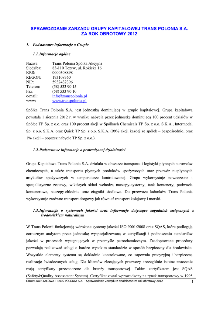 SPRAWOZDANIE ZARZĄDU GRUPY KAPITAŁOWEJ TRANS POLONIA S.A. ZA ROK OBROTOWY 2012 1. Podstawowe informacje o Grupie 1.1. Informacje ogólne Nazwa: Siedziba: KRS: REGON: NIP: Telefon: Fax: e-mail: www: Trans Polonia Spółka Akcyjna 83-110 Tczew, ul. Rokicka 16 0000308898 193108360 5932432396 (58) 533 90 15 (58) 533 90 10 [email protected] www.transpolonia.pl Spółka Trans Polonia S.A. jest jednostką dominującą w grupie kapitałowej. Grupa kapitałowa powstała 1 sierpnia 2012 r. w wyniku nabycia przez jednostkę dominującą 100 procent udziałów w Spółce TP Sp. z o.o. oraz 100 procent akcji w Spółkach Chemicals TP Sp. z o.o. S.K.A., Intermodal Sp. z o.o. S.K.A. oraz Quick TP Sp. z o.o. S.K.A. (99% akcji każdej ze spółek – bezpośrednio, oraz 1% akcji – poprzez nabycie TP Sp. z o.o.). 1.2. Podstawowe informacje o prowadzonej działalności Grupa Kapitałowa Trans Polonia S.A. działała w obszarze transportu i logistyki płynnych surowców chemicznych, a także transportu płynnych produktów spożywczych oraz przewóz niepłynnych artykułów spożywczych w temperaturze kontrolowanej. Grupa wykorzystuje nowoczesne i specjalistyczne zestawy, w których skład wchodzą naczepy-cysterny, tank kontenery, podwozia kontenerowe, naczepy-chłodnie oraz ciągniki siodłowe. Do przewozu ładunków Trans Polonia wykorzystuje zarówno transport drogowy jak również transport kolejowy i morski. 1.3. Informacje o systemach jakości oraz informacje dotyczące zagadnień związanych z środowiskiem naturalnym W Trans Polonii funkcjonują wdrożone systemy jakości ISO 9001:2008 oraz SQAS, które podlegają corocznym audytom przez jednostkę wyspecjalizowaną w certyfikacji i podnoszeniu standardów jakości w procesach występujących w przemyśle petrochemicznym. Zaadoptowane procedury pozwalają realizować usługi o bardzo wysokim standardzie w sposób bezpieczny dla środowiska. Wszystkie elementy systemu są dokładnie kontrolowane, co zapewnia precyzyjną i bezpieczną realizację świadczonych usług. Dla klientów zlecających przewozy szczególnie istotne znaczenie mają certyfikaty przeznaczone dla branży transportowej. Takim certyfikatem jest SQAS (Safety&Quality Assessment System). Certyfikat został wprowadzony na rynek transportowy w 1995 GRUPA KAPITAŁOWA TRANS POLONIA S.A. - Sprawozdanie Zarządu z działalności za rok obrotowy 2012 1 roku przez CEFIC (European Chemical Industry Council), organizację zrzeszającą europejski przemysł chemiczny. SQAS jest narzędziem służącym zbadaniu i określeniu poziomu bezpieczeństwa i jakości działań operacyjnych, podejmowanych w obrocie produktami chemicznymi w łańcuch logistycznym. 2. Omówienie podstawowych wielkości ekonomiczno-finansowych ujawnionych w rocznym sprawozdaniu finansowym, w szczególności opis czynników i zdarzeń, w tym o nietypowym charakterze, mających znaczący wpływ na działalność i osiągnięte zyski lub poniesione straty w roku obrotowym, a także omówienie perspektyw rozwoju działalności przynajmniej w najbliższym roku obrotowym 2.1. Przychody operacyjne Grapa Kapitałowa Trans Polonia S.A. w roku 2012 wygenerowała przychody netto ze sprzedaży w wysokości 49.509 tys. zł, co jest wynikiem o ponad 5% lepszym w stosunku do analogicznego okresu ubiegłego roku, w którym to przychody wyniosły 46.931 tys. zł. Rysunek nr 1 – Przychody netto ze sprzedaży [w tys.] w latach 2011-2012 Rok 2012 był kolejnym rokiem, w którym udało się utrzymać dodatnią dynamikę sprzedaży. Grupa umocniła swoją pozycję na rynku wysokospecjalistycznych usług przewozu chemikaliów płynnych poprzez oferowane klientom rozwiązań zwiększających efektywność zarządzania łańcuchem dostaw. GRUPA KAPITAŁOWA TRANS POLONIA S.A. - Sprawozdanie Zarządu z działalności za rok obrotowy 2012 2 W tym celu Trans Polonia rozbudowała i unowocześniła swój tabor nabywając nowe jednostki transportowe tj. (ciągniki siodłowe, naczepy-cysterny, naczepy-podwozia do przewozu tank kontenerów, naczepy-chłodnie). Ponadto podjęto działania mające na celu rozwój oferty w zakresie logistyki ładunków na długich dystansach łączących głównie Europę Zachodnią z Europą Wschodnią. Oprócz usług transportu drogowego, będących dotychczas podstawowym sposobem świadczenia usług przewozowych, w minionym roku realizowano w szerszym zakresie usługi transportu intermodalnego. Transport intermodalny, polegający na wykorzystaniu w łańcuchu dostaw poza transportem samochodowym również transport kolejowy i morski, pozwolił w roku 2012 transportować większe wolumeny ładunków niż w latach ubiegłych. Obecnie wykorzystując wymienione gałęzie transportu Trans Polonia przewozi szeroką gamę płynnych ładunków chemicznych, płynnych ładunków spożywczych oraz spożywczych przewożonych w temperaturze kontrolowanej. Tabela nr 1 – Sprzedaż według segmentów [w tys.] w latach 2011-2012 Wartość sprzedaży w 2012 roku Udział w sprzedaży 2012 roku Wartość sprzedaży w 2011 roku Udział w sprzedaży 2011 roku Dynamika sprzedaży rok do roku TRANSPORT DROGOWY 41 481 80,4% 42 507 89,5% -2,4% TRANSPORT INTERMODALNY 8 510 16,5% 3 960 8,3% 114,9% POZOSTAŁE 1 592 3,1% 1 013 2,1% 57,2% 51 583 100,0% 47 480 100,0% 8,6% Jak wynika z powyższej tabeli, dominującym segmentem działalności, są przychody (obejmujące przychody ze sprzedaży wraz z pozostałymi przychodami operacyjnymi) z usług transportu drogowego, które stanowią ponad 80% przychodów Spółki. W 2012 roku przychody tego segmentu wyniosły 41.481 tys. zł, w stosunku do 42.507 tys. zł w roku 2011 roku. Spadek przychodów transportu drogowego w wysokości 2,4% spowodowany był głównie mniejszą niż w roku poprzednim sprzedażą uzyskaną z transportu asfaltów oraz faktu, że część usług dla klientów, która wcześniej była realizowana jedynie transportem drogowym wykonywana była w 2012 roku także innymi rodzajami t