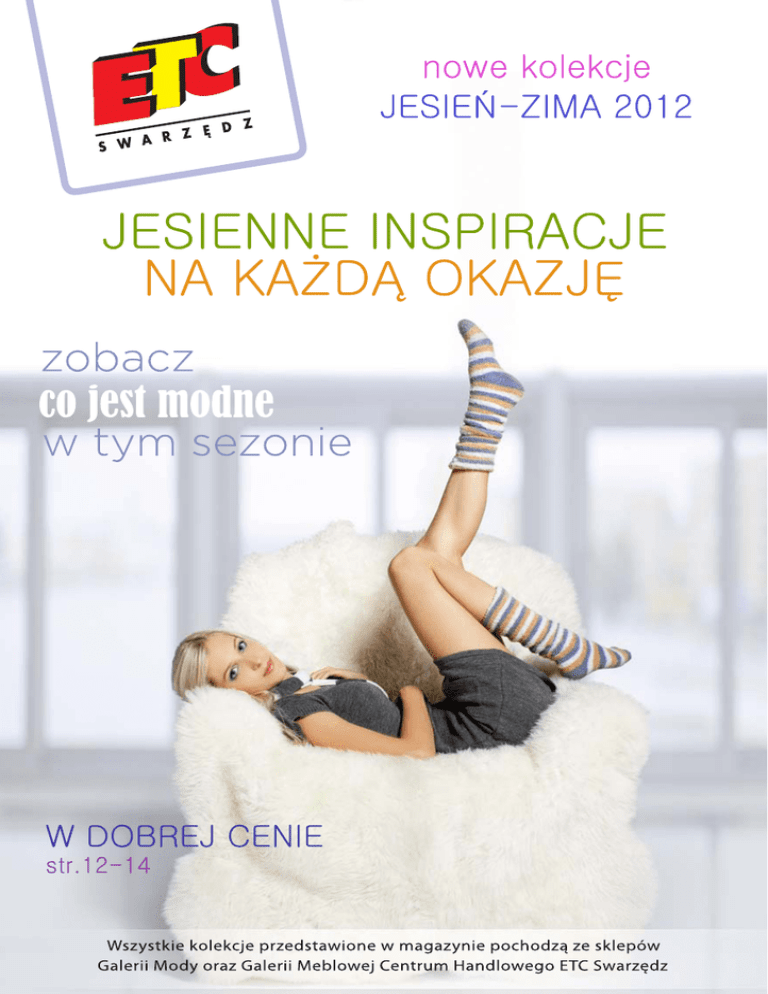 nadchodzącego sezonu, dlatego salony z tym asortymentem przygotowały dla Pań bogatą ofertę ulubionych gadżetów. Przysłowiową „kropką nad i” będą odpowiednio dobrane kosmetyki pielęgnacyjne oraz domowe zapachy w postaci świec i perfum, co doda ciepła i pozytywnej aury chłodnym wieczorom. Sylwia Wiszowata-Łazarz Senior Marketing Manager DTZ Management Polska Sp. z o.o. W zbliżającym się sezonie i trendach jesień-zima 2012/2013 postarajmy się znaleźć jak najwięcej pozytywów, aby szybciej minął czas do wiosny. Trendy tego sezonu ucieszą nas nie tylko kolorystyką, przypominającą „złotą polską jesień”, ale również zaskoczą – wśród typowo jesiennych barw pojawi się limonka, fuksja i soczysta pomarańcz. Kolekcja damska w sezonie jesień-zima to współczesna elegancja z odrobiną wyrafinowania oraz linia casualowa, inspirowana luzem i oryginalnością bohemy. Najważniejsze dla każdej kobiety elementy – torebka i buty – to obowiązkowy zestaw na liście MUST HAVE ETC Swarzędz ul. Poznańska 6 62-020 Swarzędz Zarówno w kolekcji dla kobiet, jak i mężczyzn ciepłe dzianiny sprawią, że w nadchodzącym sezonie na pewno nie zmarzniemy. Swetry z grubym splotem to aktualny hit sezonu. W casualowych propozycjach dla Panów nie zabraknie wygodnych jeansów, topów oraz koszul, natomiast perfekcyjna elegancja garniturów wizytowych stworzy nowy wizerunek współczesnego mężczyzny. Kolekcja jesień-zima 2012/2013 dla dzieci to ciekawe wzornictwo i fasony, dobra jakość oraz dbałość o detale. Dominują kolory ciemne: granaty, czernie, zielenie i brązy przełamane odrobiną różu, szarości, ecru i czerwieni. Życzę Państwu, by szafa tej jesieni była pełna kolorów i miękkich tkanin. Zapraszam do ETC Swarzędz Godziny otwarcia od poniedziałku do soboty 10:00 – 21:00 w niedzielę 11:00 – 20:00 JESIENNE STYLIZACJE KOBIETA Botki Again & Again / Prestige Venezia, lok. nr 62 590 zł Bluzka / Top Secret, lok. nr 36 99,99 zł Spodnie / Top Secret, lok. nr 36 139,99 zł Sweter / Top Secret, lok. nr 36 119,99 zł Okulary Tommy Hilfiger / Vision Express, lok. nr 40 599,00 zł MĘŻCZYZNA Buty Napapijri / Riccardo, lok. nr 29 830 zł Spodnie / Top Secret, lok. nr 36 99,99 zł Chusta / Top Secret, lok. nr 36 9,99 zł Sweter / Top Secret, lok. nr 36 169,99 zł Restauracje: Happy Pancake, lok. nr 61, Marhaba, lok. nr 13 oraz Don Lucci, lok. nr 14 czekają na Ciebie ze wspaniałym menu. Po doskonałym posiłku warto zjeść coś słodkiego i napić się kawy – zapraszamy do kawiarni Zielona Budka, lok. nr 5. Zdjęć do sesji zdjęciowej użyczył Salon Leatherworld (Natuzzi), lok. nr 79, Galeria Meblowa ETC AKCESORIA Torba podróżna / Lamero, lok. nr 59 139 zł Książka „Iggy Pop” / Empik, lok. nr 33 49,90 zł 11 KUCHNIA PARTY 229 zł 119 zł 249 zł MĘŻCZYZNA Buty Lavaggio / Prestige Venezia, lok. nr 62 229 zł Muszka / Top Secret, lok. nr 36 19,99 zł Koszula / Top Secret, lok. nr 36 119,99 zł Spodnie / Top Secret, lok. nr 36 179,99 zł Kamizelka / Top Secret, lok. nr 36 79,99 zł Wnętrz do sesji zdjęciowej użyczył Salon Mebel RUST, lok. nr 94, Galeria Meblowa ETC KOBIETA Sukienka Ashley / Kaskada, lok. nr 45 Narzutka / Unisono, lok. nr 28 Botki Zych&Staszewski / Prestige, lok. nr 37 Tradycyjne polskie wyroby, wędliny oraz przetwory mięsne oferuje sklep Tradycyjne Jadło, lok. nr 57. Tutaj zaopatrzysz się w zdrową żywność dla swojej rodziny. 22 KOBIETA Botki / Roma Le Scarpe, lok. nr 60 359 zł Okulary przeciwsłoneczne Ray Ban / Vision Express, lok. nr 40 399 zł Kurtka / Cross, lok. nr 49 199, 99 zł Bluzka / Cross, lok. nr 49 119,99 zł Torebka / Unisono, lok. nr 28 189 zł Spodnie / Cross, lok. nr 49 99,99 zł MĘŻCZYZNA Kurtka / Cross, lok. nr 49 149,99 zł Buty Rieker / Prestige, lok. nr 37 369 zł Pasek Wrangler / Manhattan Store, lok. nr 26 159 zł T-Shirt Mustang / Manhattan Store, lok. nr 26 79 zł Koszula Lee / Manhattan Store, lok. nr 26 199 zł Spodnie Wrangler / Manhattan Store, lok. nr 349 zł Jeśli zaplanowałeś urlop na wrzesień lub październik, koniecznie zajrzyj do Biura Podróży Jamajka, lok. nr 4 – w ofercie prawdziwe hity tego sezonu. Przed wyjazdem nie zapomnij o wymianie gotówki w kantorze Dark. Wnętrz do sesji zdjęciowej użyczył Salon BAKARI meble włoskie, lok. nr 105, I piętro, Galeria Meblowa ETC KLUBOWO 33 CZAS ZABAWY CHŁOPIEC Bluzka / Reporter Young, lok. nr 30 39 zł Spodnie dżinsowe / Reporter Young, lok. nr 30 119,90 zł Buty / No Boso, lok. nr 19 69,99 zł DZIEWCZYNKA Spódniczka / Kids Akcesoria, lok. nr 38 30 zł Bluzeczka / Kids Akcesoria, lok. nr 38 26 zł Kalosze / Intermarche 29,99 zł DZIEWCZYNKA Koszula dżinsowa / Reporter Young, lok. nr 30 Spodnie / Reporter Young, lok. nr 30 Trampki / No Boso, lok. nr 19 4 99,90 zł 99,90 zł 34,99 zł Wnętrz do sesji zdjęciowej użyczyła Kraina Zabaw AKUKU, lok. nr 120, I piętro, Galeria Meblowa ETC AKCESORIA Piłka / Intermarche 6,49 zł Plecaczek / Kids Zabawki, lok. nr 27 46 zł Bidon Lego / Intermarche 14,99 zł SZKOLNE KLIMATY 89,90 zł 99,90 zł 99,90 zł 29,99 zł CHŁOPIEC Spodnie / Reporter Young, lok. nr 30 119,90 zł Marynarka (sztruks) / Reporter Young, lok. nr 30 139,90 zł Okulary Angelo Futuro / Vision Express, lok. nr 40 259 zł Półbuty / No Boso, lok. nr 19 39,99 zł Koszula / Reporter Young, lok. nr 30 79,90 zł Bezrękawnik / Reporter Young, lok. nr 30 69,90 zł AKCESORIA Plecak Spider-Man / Kids Zabawki, lok. nr 27 Wnętrz do sesji zdjęciowej użyczył Salon Meble VOX, lok. nr 95, Galeria Meblowa ETC DZIEWCZYNKA Koszula / Reporter Young, lok. nr 30 Sweterek / Reporter Young, lok. nr 30 Spodnie / Reporter Young, lok. nr 30 Półbuty / No Boso, lok. nr 19 155 zł 5 SPORTOWO MĘŻCZYZNA Kurtka / HiMountain, lok. nr 67 Spodnie / HiMountain, lok. nr 67 Buty / HiMountain, lok. nr 67 Czapka / HiMountain, lok. nr 67 Plecak / HiMountain, lok. nr 67 6 279 zł 349 zł 299 zł 59 zł 349 zł KOBIETA Dres Bodo 