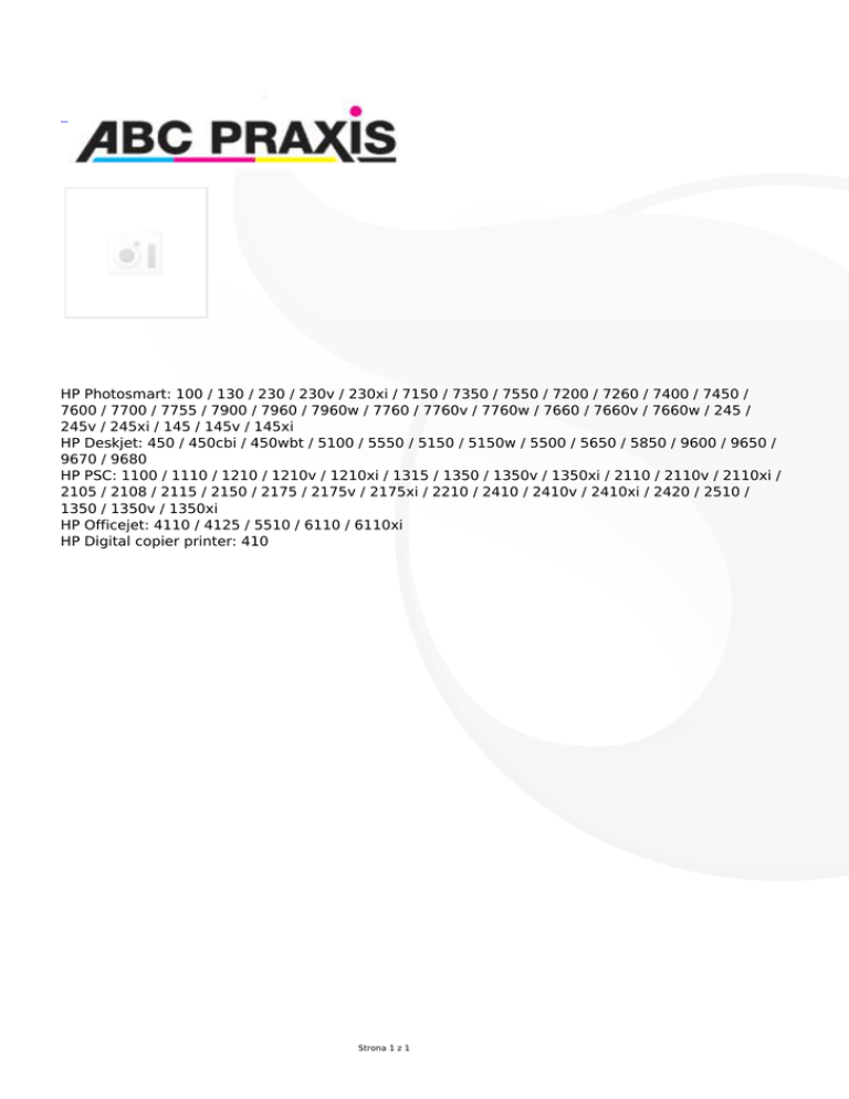 HP Photosmart: 100 / 130 / 230 / 230v / 230xi / 7150 / 7350 / 7550 / 7200 / 7260 / 7400 / 7450 / 7600 / 7700 / 7755 / 7900 / 7960 / 7960w / 7760 / 7760v / 7760w / 7660 / 7660v / 7660w / 245 / 245v / 245xi / 145 / 145v / 145xi HP Deskjet: 450 / 450cbi / 450wbt / 5100 / 5550 / 5150 / 5150w / 5500 / 5650 / 5850 / 9600 / 9650 / 9670 / 9680 HP PSC: 1100 / 1110 / 1210 / 1210v / 1210xi / 1315 / 1350 / 1350v / 1350xi / 2110 / 2110v / 2110xi / 2105 / 2108 / 2115 / 2150 / 2175 / 2175v / 2175xi / 2210 / 2410 / 2410v / 2410xi / 2420 / 2510 / 1350 / 1350v / 1350xi HP Officejet: 4110 / 4125 / 5510 / 6110 / 6110xi HP Digital copier printer: 410 Strona 1 z 1