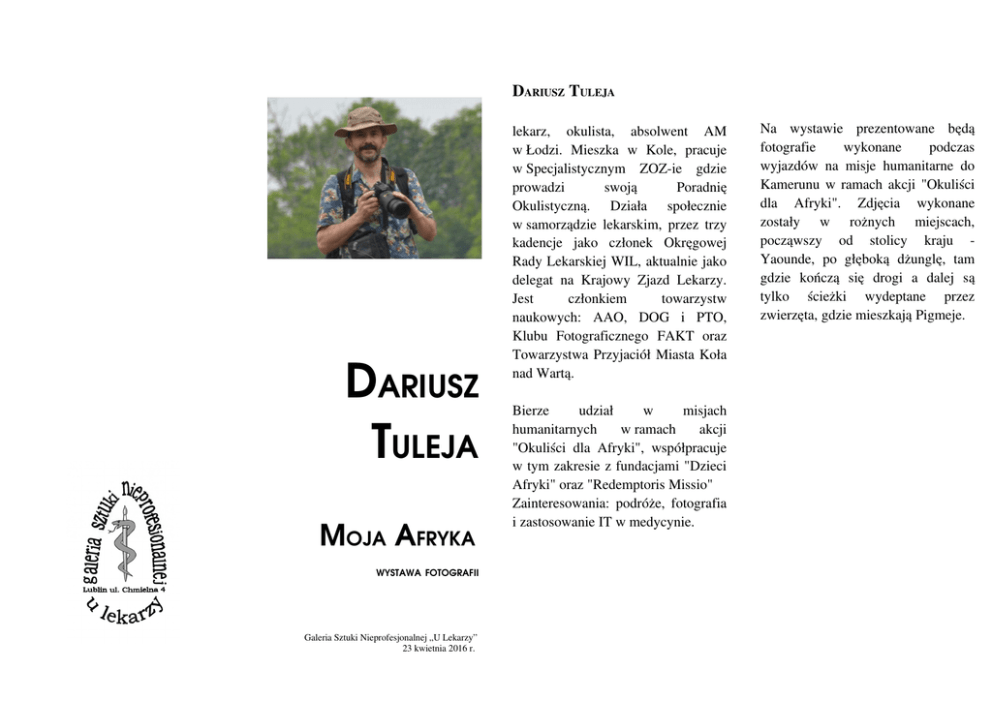 DARIUSZ TULEJA DARIUSZ TULEJA MOJA AFRYKA WYSTAWA FOTOGRAFII Galeria Sztuki Nieprofesjonalnej „U Lekarzy” 23 kwietnia 2016 r. lekarz, okulista, absolwent AM w Łodzi. Mieszka w Kole, pracuje w Specjalistycznym ZOZie gdzie prowadzi swoją Poradnię Okulistyczną. Działa społecznie w samorządzie lekarskim, przez trzy kadencje jako członek Okręgowej Rady Lekarskiej WIL, aktualnie jako delegat na Krajowy Zjazd Lekarzy. Jest członkiem towarzystw naukowych: AAO, DOG i PTO, Klubu Fotograficznego FAKT oraz Towarzystwa Przyjaciół Miasta Koła nad Wartą. Bierze udział w misjach humanitarnych w ramach akcji "Okuliści dla Afryki", współpracuje w tym zakresie z fundacjami "Dzieci Afryki" oraz "Redemptoris Missio" Zainteresowania: podróże, fotografia i zastosowanie IT w medycynie. Na wystawie prezentowane będą fotografie wykonane podczas wyjazdów na misje humanitarne do Kamerunu w ramach akcji "Okuliści dla Afryki". Zdjęcia wykonane zostały w rożnych miejscach, począwszy od stolicy kraju Yaounde, po głęboką dżunglę, tam gdzie kończą się drogi a dalej są tylko ścieżki wydeptane przez zwierzęta, gdzie mieszkają Pigmeje.