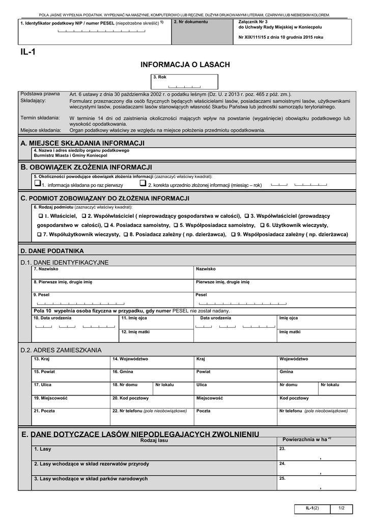 POLA JASNE WYPEŁNIA PODATNIK. WYPEŁNIAĆ NA MASZYNIE, KOMPUTEROWO LUB RĘCZNIE, DUŻYMI DRUKOWANYMI LITERAMI, CZARNYM LUB NIEBIESKIM KOLOREM. 1. Identyfikator podatkowy NIP / numer PESEL (niepotrzebne skreślić) 1) 2. Nr dokumentu Załącznik Nr 3 do Uchwały Rady Miejskiej w Koniecpolu Nr XIX/111/15 z dnia 10 grudnia 2015 roku IL-1 INFORMACJA O LASACH 3. Rok Podstawa prawna Składający: Art. 6 ustawy z dnia 30 października 2002 r. o podatku leśnym (Dz. U. z 2013 r. poz. 465 z póź. zm.). Formularz przeznaczony dla osób fizycznych będących właścicielami lasów, posiadaczami samoistnymi lasów, użytkownikami wieczystymi lasów, posiadaczami lasów stanowiących własność Skarbu Państwa lub jednostki samorządu terytorialnego. Termin składania: W terminie 14 dni od zaistnienia okoliczności mających wpływ na powstanie (wygaśnięcie) obowiązku podatkowego lub wysokość opodatkowania. Organ podatkowy właściwy ze względu na miejsce położenia przedmiotu opodatkowania. Miejsce składania: A. MIEJSCE SKŁADANIA INFORMACJI 4. Nazwa i adres siedziby organu podatkowego Burmistrz Miasta i Gminy Koniecpol B. OBOWIĄZEK ZŁOŻENIA INFORMACJI 5. Okoliczności powodujące obowiązek złożenia informacji (zaznaczyć właściwy kwadrat): 1. informacja składana po raz pierwszy 2. korekta uprzednio złożonej informacji (miesiąc – rok) C. PODMIOT ZOBOWIĄZANY DO ZŁOŻENIA INFORMACJI 6. Rodzaj podmiotu (zaznaczyć właściwy kwadrat): 1. Właściciel, 2. Współwłaściciel ( nieprowadzący gospodarstwa w całości), 3. Współwłaściciel (prowadzący gospodarstwo w całości), 4. Posiadacz samoistny, 5. Współposiadacz samoistny, 6. Użytkownik wieczysty, 7. Współużytkownik wieczysty, 8. Posiadacz zależny ( np. dzierżawca), 9. Współposiadacz zależny ( np. dzierżawca) 8. Posiadacz zależny ( np. dzierżawca), 9. Współposiadacz zależny ( np. dzierżawca) D. DANE PODATNIKA D.1. DANE IDENTYFIKACYJNE 7. Nazwisko Nazwisko 8. Pierwsze imię, drugie imię Pierwsze imię, drugie imię 9. Pesel Pesel Pola 10 wypełnia osoba fizyczna w przypadku, gdy numer PESEL nie został nadany. 10. Data urodzenia 11. Imię ojca Data urodzenia 12. Imię matki Imię ojca Imię matki D.2. ADRES ZAMIESZKANIA 13. Kraj 14. Województwo Kraj Województwo 15. Powiat 16. Gmina Powiat Gmina 17. Ulica 18. Nr domu Ulica Nr domu 19. Miejscowość 20. Kod pocztowy Miejscowość Kod pocztowy 21. Poczta 22. Nr telefonu (pole nieobowiązkowe) Poczta Nr telefonu (pole nieobowiązkowe) Nr lokalu E. DANE DOTYCZĄCE LASÓW NIEPODLEGAJĄCYCH ZWOLNIENIU Rodzaj lasu Nr lokalu Powierzchnia w ha 2) 1. Lasy 23. 2. Lasy wchodzące w skład rezerwatów przyrody 24. 3. Lasy wchodzące w skład parków narodowych 25. , , , IL-1(2) 1/2 POLA JASNE WYPEŁNIA PODATNIK. WYPEŁNIAĆ NA MASZYNIE, KOMPUTEROWO LUB RĘCZNIE, DUŻYMI DRUKOWANYMI LITERAMI, CZARNYM LUB NIEBIESKIM KOLOREM. F. DANE DOTYCZĄCE ZWOLNIEŃ PODATKOWYCH WYNIKAJĄCYCH Z USTAWY LUB UCHWAŁY RADY GMINY Powierzchnia w ha 2) Tytuł prawny zwolnienia 26. Art.7 ust.1 pkt 1 - lasy z drzewostanem w wieku do 40 lat , 27. Art.7 ust.1 pkt 2 - lasy wpisane indywidualnie do rejestru zabytków Art.7 ust.1 pkt 2 - lasy wpisane indywidualnie do rejestru zabytków , 28. Art.7 ust.1pkt pkt 3- -użytki użytkiekologiczne ekologiczne Art.7 Art.7 ust.1 ust.1 pkt 3 2 - lasy wpisane indywidualnie do rejestru zabytków , 29. Art.7 ust.2 pkt 1 - uczelnie Art.7 ekologiczne Art.7ust.1 ust.2pkt pkt31- -użytki uczelnie , Art.7 ust.2 ust.2 pkt 12 - uczelnie publiczne i niepubliczne jednostki organizacyjne objęte systemem oświaty Art.7 ekologiczne Art.7ust.1 ust.2pkt pkt32- -użytki publiczne i niepubliczne jednostki organizacyjne objęte systemem oświaty Art.7 ust.1 pkt 2 - lasy wpisane indywidualnie rejestru oraz prowadząc je organy, w zakresie lasów do zajętych na zabytków działalność oświatową organy, w zakresie lasów zajętych na działalność oświatową oraz p rowadzą 30. , publiczne i niepubliczne jednostki organizacyjne objęte systemem oświaty Art.7 ust.2 pkt 12 -- uczelnie 31. Art.7 ust.1 pkt 3 - użytki ekologiczne Art.7 ust.2 pkt 3 - instytuty naukowe i pomocnicze jednostki naukowe Polskiej Akademii Nauk organy, w zakresie lasów zajętych na działalność oświatową Art.7 ust.2 pkt 2 - publiczne i niepubliczne jednostki organizacyjne objęte systemem oświaty Art.7 ust.2 pkt 1 - uczelnie 32. organy, w zakresie lasów zajętych na działalność oświatową Art.7 ekologiczne Art.7ust.1 ust. 2pkt pkt3 4- użytki - prowadzący zakłady pracy chronionej spełniające warunek, o którym mowa Art.7 ust.2ust.1 pkt 2pkt - publiczne i niepubliczne organizacyjne objętezawodowej systemem oświaty w art.28 1 lit. b ustawy z dnia 27 jednostki sierpnia 1997 r. o rehabilitacji i społecznej oraz zatrudnianiu niepełnosprawnych, lub zakłady aktywności zawodowej w zakresie lasów Art.7 ust.2 pkt 1osób - uczelnie organy, w zakresie na działalność oświatową wymienionych w lasów decyzjizajętych w sprawie przyznania statusu zakładu pracy chronionej lub zakładu aktywności zawodowej lub zgłoszonych wojewodzie - zajętych na prowadzenie tego zakładu, Art.7 ust.2 pkt 2 - publiczne i niepubliczne organizacyjne objęte systemem oświaty z wyłączeniem lasów, które znajdują jednostki się w posiadaniu zależnym podmiotów niebędących prowadzącymi zakłady pracy chronionej spełniające warunek, o którym mowa w art.28 ust.1 pkt 1 lit. organy, w zakresie lasów zajętych oświatową b ustawy z dnia 27 sierpnia 1997nar. działalność o rehabilitacji zawodowej i społecznej oraz zatrudnianiu osób niepełnosprawnych lub zakłady aktywności zawodowej oraz prowadzące je ,oraz prowadzące je oraz prowadzące je ,oraz prowadzące je 33. Art.7 ust.2 pkt 5 - instytuty badawcze , 34. Art.7. ust.2 pkt 6 - przedsiębiorcy o statusie centrum badawczo-rozwojowego uzyskanym na zasadach określonych w przepisach o niektórych formach wspierania działalności innowacyj