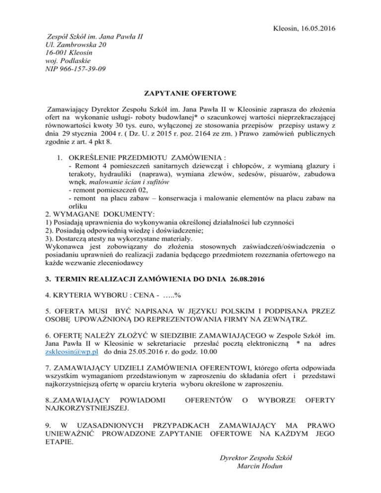 Kleosin, 16.05.2016 Zespół Szkół im. Jana Pawła II Ul. Zambrowska 20 16-001 Kleosin woj. Podlaskie NIP 966-157-39-09 ZAPYTANIE OFERTOWE Zamawiający Dyrektor Zespołu Szkół im. Jana Pawła II w Kleosinie zaprasza do złożenia ofert na wykonanie usługi- roboty budowlanej* o szacunkowej wartości nieprzekraczającej równowartości kwoty 30 tys. euro, wyłączonej ze stosowania przepisów przepisy ustawy z dnia 29 stycznia 2004 r. ( Dz. U. z 2015 r. poz. 2164 ze zm. ) Prawo zamówień publicznych zgodnie z art. 4 pkt 8. 1. OKREŚLENIE PRZEDMIOTU ZAMÓWIENIA : - Remont 4 pomieszczeń sanitarnych dziewcząt i chłopców, z wymianą glazury i terakoty, hydrauliki (naprawa), wymiana zlewów, sedesów, pisuarów, zabudowa wnęk, malowanie ścian i sufitów - remont pomieszczeń 02, - remont na placu zabaw – konserwacja i malowanie elementów na placu zabaw na orliku 2. WYMAGANE DOKUMENTY: 1) Posiadają uprawnienia do wykonywania określonej działalności lub czynności 2). Posiadają odpowiednią wiedzę i doświadczenie; 3). Dostarczą atesty na wykorzystane materiały. Wykonawca jest zobowiązany do złożenia stosownych zaświadczeń/oświadczenia o posiadaniu uprawnień do realizacji zadania będącego przedmiotem rozeznania ofertowego na każde wezwanie zleceniodawcy 3. TERMIN REALIZACJI ZAMÓWIENIA DO DNIA 26.08.2016 4. KRYTERIA WYBORU : CENA - …..% 5. OFERTA MUSI BYĆ NAPISANA W JĘZYKU POLSKIM I PODPISANA PRZEZ OSOBĘ UPOWAŻNIONĄ DO REPREZENTOWANIA FIRMY NA ZEWNĄTRZ. 6. OFERTĘ NALEŻY ZŁOŻYĆ W SIEDZIBIE ZAMAWIAJĄCEGO w Zespole Szkół im. Jana Pawła II w Kleosinie w sekretariacie przesłać pocztą elektroniczną * na adres [email protected] do dnia 25.05.2016 r. do godz. 10.00 7. ZAMAWIAJĄCY UDZIELI ZAMÓWIENIA OFERENTOWI, którego oferta odpowiada wszystkim wymaganiom przedstawionym w zaproszeniu do składania ofert i przedstawi najkorzystniejszą ofertę w oparciu kryteria wyboru określone w zaproszeniu. 8..ZAMAWIAJĄCY POWIADOMI NAJKORZYSTNIEJSZEJ. OFERENTÓW O WYBORZE OFERTY 9. W UZASADNIONYCH PRZYPADKACH ZAMAWIAJĄCY MA PRAWO UNIEWAŻNIĆ PROWADZONE ZAPYTANIE OFERTOWE NA KAŻDYM JEGO ETAPIE. Dyrektor Zespołu Szkół Marcin Hodun