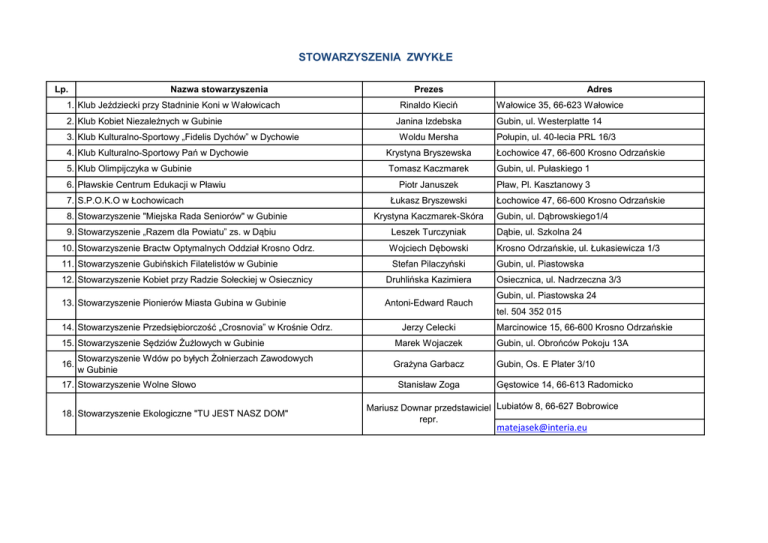 STOWARZYSZENIA ZWYKŁE Lp. Nazwa stowarzyszenia 1. Klub Jeździecki przy Stadninie Koni w Wałowicach 2. Klub Kobiet Niezależnych w Gubinie 3. Klub Kulturalno-Sportowy „Fidelis Dychów” w Dychowie Prezes Rinaldo Kieciń Janina Izdebska Woldu Mersha Adres Wałowice 35, 66-623 Wałowice Gubin, ul. Westerplatte 14 Połupin, ul. 40-lecia PRL 16/3 4. Klub Kulturalno-Sportowy Pań w Dychowie Krystyna Bryszewska Łochowice 47, 66-600 Krosno Odrzańskie 5. Klub Olimpijczyka w Gubinie Tomasz Kaczmarek Gubin, ul. Pułaskiego 1 Piotr Januszek Pław, Pl. Kasztanowy 3 6. Pławskie Centrum Edukacji w Pławiu 7. S.P.O.K.O w Łochowicach 8. Stowarzyszenie "Miejska Rada Seniorów" w Gubinie 9. Stowarzyszenie „Razem dla Powiatu” zs. w Dąbiu 10. Stowarzyszenie Bractw Optymalnych Oddział Krosno Odrz. 11. Stowarzyszenie Gubińskich Filatelistów w Gubinie Łukasz Bryszewski Krystyna Kaczmarek-Skóra Dąbie, ul. Szkolna 24 Wojciech Dębowski Krosno Odrzańskie, ul. Łukasiewicza 1/3 Stefan Pilaczyński Druhlińska Kazimiera 13. Stowarzyszenie Pionierów Miasta Gubina w Gubinie Antoni-Edward Rauch 15. Stowarzyszenie Sędziów Żużlowych w Gubinie 16. Stowarzyszenie Wdów po byłych Żołnierzach Zawodowych w Gubinie 17. Stowarzyszenie Wolne Słowo 18. Stowarzyszenie Ekologiczne "TU JEST NASZ DOM" Gubin, ul. Dąbrowskiego1/4 Leszek Turczyniak 12. Stowarzyszenie Kobiet przy Radzie Sołeckiej w Osiecznicy 14. Stowarzyszenie Przedsiębiorczość „Crosnovia” w Krośnie Odrz. Łochowice 47, 66-600 Krosno Odrzańskie Gubin, ul. Piastowska Osiecznica, ul. Nadrzeczna 3/3 Gubin, ul. Piastowska 24 tel. 504 352 015 Jerzy Celecki Marcinowice 15, 66-600 Krosno Odrzańskie Marek Wojaczek Gubin, ul. Obrońców Pokoju 13A Grażyna Garbacz Gubin, Os. E Plater 3/10 Stanisław Zoga Gęstowice 14, 66-613 Radomicko Mariusz Downar przedstawiciel Lubiatów 8, 66-627 Bobrowice repr. [email protected]
