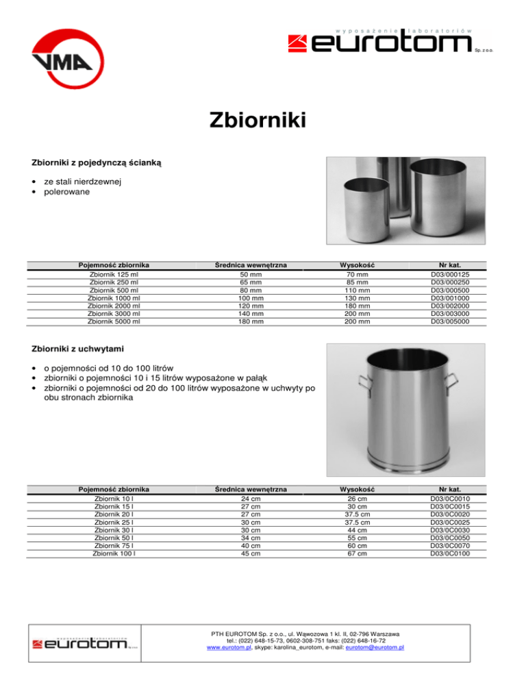 Zbiorniki Zbiorniki z pojedynczą ścianką • ze stali nierdzewnej • polerowane Pojemność zbiornika Zbiornik 125 ml Zbiornik 250 ml Zbiornik 500 ml Zbiornik 1000 ml Zbiornik 2000 ml Zbiornik 3000 ml Zbiornik 5000 ml Średnica wewnętrzna 50 mm 65 mm 80 mm 100 mm 120 mm 140 mm 180 mm Wysokość 70 mm 85 mm 110 mm 130 mm 180 mm 200 mm 200 mm Nr kat. D03/000125 D03/000250 D03/000500 D03/001000 D03/002000 D03/003000 D03/005000 Wysokość 26 cm 30 cm 37.5 cm 37.5 cm 44 cm 55 cm 60 cm 67 cm Nr kat. D03/0C0010 D03/0C0015 D03/0C0020 D03/0C0025 D03/0C0030 D03/0C0050 D03/0C0070 D03/0C0100 Zbiorniki z uchwytami • o pojemności od 10 do 100 litrów • zbiorniki o pojemności 10 i 15 litrów wyposażone w pałąk • zbiorniki o pojemności od 20 do 100 litrów wyposażone w uchwyty po obu stronach zbiornika Pojemność zbiornika Zbiornik 10 l Zbiornik 15 l Zbiornik 20 l Zbiornik 25 l Zbiornik 30 l Zbiornik 50 l Zbiornik 75 l Zbiornik 100 l Średnica wewnętrzna 24 cm 27 cm 27 cm 30 cm 30 cm 34 cm 40 cm 45 cm PTH EUROTOM Sp. z o.o., ul. Wąwozowa 1 kl. II, 02-796 Warszawa tel.: (022) 648-15-73, 0602-308-751 faks: (022) 648-16-72 www.eurotom.pl, skype: karolina_eurotom, e-mail: [email protected] Zbiornik z płaszczem grzejnym/chłodzącym W laboratorium lub instalacjach półtechnicznych często konieczne jest prowadzenie procesu w określonej temperaturze. Np. podczas dyspergowania, intensywnego mieszania lub reakcji egzotermicznych wymagane jest ciągłe odprowadzanie ciepła. Natomiast inne aplikacji, jak np. reakcje endotermiczne wymagają doprowadzania ciepła. Zbiorniki wyposażone w płaszcz do kontrolowania temperatury są idealnie przystosowane do zastosowań tego typu. Wypolerowana powierzchnia zbiornika uławia czyszczenie. Zbiorniki do pojemności 5000 ml są wyposażone w szybkozłączki, co w znaczącym stopniu ułatwia pracę . Zawory samouszczelniające zapobiegają wyciekom. Zbiorniki o pojemności od 10 do 65 l wyposażone są w standardowe zawory do podłączania medium chłodzącego/grzejnego. Dla wszystkich zbiorników są dostępne pokrywy dzielone o odpowiednich rozmiarach. Pojemność zbiornika Zbiornik 30 ml Zbiornik 50 ml Zbiornik 125 ml Zbiornik 250 ml Zbiornik 500 ml Zbiornik 1 l Zbiornik 2 l Zbiornik 3 l Zbiornik 5 l Zbiornik 10 l Zbiornik 15 l Zbiornik 25 l Zbiornik 35 l Zbiornik 50 l Zbiornik 60 l Zbiornik z spustowym • • • • płaszczem Średnica wewnętrzna 30 mm 40 mm 50 mm 65 mm 80 mm 10 cm 12 cm 14 cm 18 cm 24 cm 28 cm 32 cm 36 cm 40 cm 44 cm grzejnym/chłodzącym oraz Wysokość 40 mm 50 mm 70 mm 85 mm 110 mm 13 cm 18 cm 20 cm 20 cm 24 cm 28 cm 32 cm 36 cm 40 cm 44cm Nr kat. D20/000030 D20/000050 D20/000125 D20/000250 D20/000500 D20/001000 D20/002000 D20/003000 D20/005000 D25/000010 D25/000015 D25/000025 D25/000035 D25/000050 D25/000060 Wysokość 20 cm 24 cm 28 cm 32 cm 36 cm 40 cm 44 cm Nr kat. D20/AB5000 D25/AB0010 D25/AB0015 D25/AB0025 D25/AB0035 D25/AB0050 D25/AB0065 zaworem zawory do podłączania wody chłodzącej zawór spustowy ułatwia opróżnianie zbiornika rozmiary od 5 do 65 litrów zbiorniki większe niż 10 litrów nie mogą być poddawane ciśnieniu większemu niż 30 psi. Uwaga: szybkozłączki oraz pokrywy należy zamawiać oddzielnie. Pojemność zbiornika Zbiornik 5 l Zbiornik 10 l Zbiornik 15 l Zbiornik 25 l Zbiornik 35 l Zbiornik 50 l Zbiornik 65 l Średnica wewnętrzna 18 cm 24 cm 28 cm 32 cm 36 cm 40 cm 44 cm PTH EUROTOM Sp. z o.o., ul. Wąwozowa 1 kl. II, 02-796 Warszawa tel.: (022) 648-15-73, 0602-308-751 faks: (022) 648-16-72 www.eurotom.pl, skype: karolina_eurotom, e-mail: [email protected] Zbiorniki przechylane • wyposażone w płaszcz do kontroli temperatury • lejek i mechanizm przechyłowy ułatwiają opróżnianie zbiornika • możliwość zamontowania na kółkach, pozwala na szybkie usunięcie zbiornika do czyszczenia • rozmiary od 10 do 65 l Pojemność zbiornika Zbiornik 10 l Zbiornik 25 l Zbiornik 50 l Nr kat. D25/KSA010 D25/KSA025 D25/KSA050 Pokrywy dzielone do zbiorników Pokrywy składają się dwóch części oraz posiadają w środku otwór na wał. Zapobiegają chlapaniu, ułatwiają czyszczenie zbiornika oraz oszczędzają produkt. Pokrywy dla zbiorników Pokrywa dla zbiornika 125 ml Pokrywa dla zbiornika 250 ml Pokrywa dla zbiornika 500 ml Pokrywa dla zbiornika 1 l Pokrywa dla zbiornika 2 l Pokrywa dla zbiornika 3 l Pokrywa dla zbiornika 5 l Pokrywa dla zbiornika 10 l Pokrywa dla zbiornika 15 l Pokrywa dla zbiornika 25 l Pokrywa dla zbiornika 35 l Pokrywa dla zbiornika 50 l Pokrywa dla zbiornika 60 l Nr kat. D21/000125 D21/000250 D21/000500 D21/001000 D21/002000 D21/003000 D21/005000 D25/D00010 D25/D00015 D25/D00025 D25/D00035 D25/D00050 D25/D00065 PTH EUROTOM Sp. z o.o., ul. Wąwozowa 1 kl. II, 02-796 Warszawa tel.: (022) 648-15-73, 0602-308-751 faks: (022) 648-16-72 www.eurotom.pl, skype: karolina_eurotom, e-mail: [email protected]