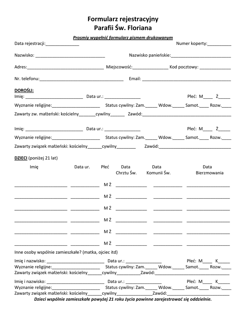 Formularz rejestracyjny Parafii Św. Floriana Prosmiy wypełnić formularz pismem drukowanym Data rejestracji:______________ Numer koperty:__________ Nazwisko: _____________________________ Nazwisko panieoskie:_________________________ Adres:________________________________ Miejscowość:_______________ Kod pocztowy: _____________ Nr. telefonu:___________________________________ Email: _____________________________________ DOROŚLI: Imię: ________________________ Data ur.: _______________ Wyznanie religijne:____________________ Płeć: M____ Ż_____ Status cywilny: Zam._____ Wdow._____ Samot.____ Rozw.____ Zawarty zw. małżeoski: kościelny_______cywilny______ Zawód:_____________________________________ Imię: ________________________ Data ur.: _______________ Wyznanie religijne:____________________ Płeć: M____ Ż_____ Status cywilny: Zam._____ Wdow._____ Samot.____ Rozw.____ Zawarty związek małżeoski: kościelny______cywilny________ Zawód:______________________________ DZIECI (poniżej 21 lat) Imię Data ur. Płeć Data Chrztu Św. Data Komunii Św. Data Bierzmowania ______________________ ____________ M Ż _____________ ____________ __________________ ______________________ ____________ M Ż _____________ ____________ __________________ ______________________ ____________ M Ż _____________ ____________ __________________ ______________________ ____________ M Ż _____________ ____________ __________________ ______________________ ____________ M Ż _____________ ____________ __________________ ______________________ ____________ M Ż _____________ ____________ __________________ Inne osoby wspólnie zamieszkałe? (matka, ojciec itd) Imię i nazwisko: ________________________ Data ur.: _______________ Płeć: M____ K_____ Wyznanie religijne:____________________ Status cywilny: Zam._____ Wdow._____ Samot.____ Rozw.____ Zawarty związek małżeoski: kościelny______cywilny__________Zawód:_______________________________ Imię i nazwisko: ________________________ Data ur.: _______________ Płeć: M____ K_____ Wyznanie religijne:____________________ Status cywilny: Zam._____ Wdow._____ Samot.____ Rozw.____ Zawarty związek małżeoski: kościelny______cywilny_______________Zawód:__________________________ Dzieci wspólnie zamieszkałe powyżej 21 roku życia powinne zarejestrować się oddzielnie.