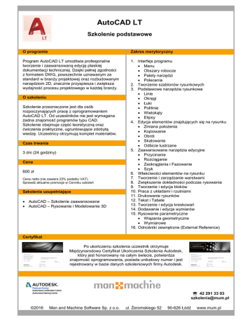 AutoCAD LT Szkolenie podstawowe O programie Zakres merytoryczny Program AutoCAD LT umożliwia profesjonalne tworzenie i zaawansowaną edycję płaskiej dokumentacji technicznej. Dzięki pełnej zgodności z formatem DWG, powszechnie uznawanym za standard w branży projektowej oraz rozbudowanym narzędziom 2D, znacznie przyspiesza i zwiększa wydajność procesu projektowego w każdej branży. 1. Interfejs programu Menu Obszary robocze Palety narzędzi Polecenia 2. Tworzenie szablonów rysunkowych 3. Podstawowe narzędzia rysunkowe Linie Okręgi Łuki Polilinie Wielokąty Elipsy 4. Edycja elementów znajdujących się na rysunku Zmiana położenia Kopiowanie Obrót Skalowanie Odbicie lustrzane 5. Zaawansowane narzędzia edycyjne Przycinanie Rozciąganie Zaokrąglania i Fazowanie Szyk 6. Właściwości elementów na rysunku 7. Tworzenie i zarządzanie warstwami 8. Zwiększenie dokładności podczas rysowania 9. Tworzenie i edycja bloków 10. Praca z układami i rzutniami 11. Drukowanie rysunków 12. Tekst i Tabele 13. Tworzenie i edycja kreskowań 14. Dodawanie i edycja wymiarów 15. Rysowanie parametryczne Wiązania geometryczne Wymiarowe 16. Odnośniki zewnętrzne (External Reference) O szkoleniu Szkolenie przeznaczone jest dla osób rozpoczynających pracę z oprogramowaniem AutoCAD LT. Od uczestników nie jest wymagana żadna znajomość programów typu CAD. Szkolenie obejmuje część teoretyczną oraz ćwiczenia praktyczne, ugruntowujące zdobytą wiedzę. Uczestnicy otrzymują komplet materiałów. Czas trwania 3 dni (24 godziny) Cena 600 zł Cena netto (nie zawiera 23% podatku VAT) Sprawdź aktualne promocje w Cenniku szkoleń Szkolenia uzupełniające AutoCAD – Szkolenie zaawansowane AutoCAD – Rysowanie i Modelowanie 3D Certyfikat Po ukończeniu szkolenia uczestnik otrzymuje Międzynarodowy Certyfikat Ukończenia Szkolenia Autodesk, który jest honorowany na całym świecie, potwierdza znajomość oprogramowania, posiada unikatowy numer i jest rejestrowany w bazie danych szkoleniowych firmy Autodesk. 42 291 33 03 [email protected] ©2016 Man and Machine Software Sp. z o.o. ul. Żeromskiego 52 90-626 Łódź www.mum.pl