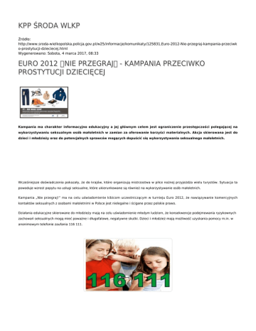 KPP ŚRODA WLKP Źródło: http://www.sroda-wielkopolska.policja.gov.pl/w25/informacje/komunikaty/125831,Euro-2012-Nie-przegraj-kampania-przeciwk o-prostytucji-dzieciecej.html Wygenerowano: Sobota, 4 marca 2017, 08:33 EURO 2012 NIE PRZEGRAJ - KAMPANIA PRZECIWKO PROSTYTUCJI DZIECIĘCEJ Kampania ma charakter informacyjno edukacyjny a jej głównym celem jest ograniczenie przestępczości polegającej na wykorzystywaniu seksualnym osób małoletnich w zamian za oferowanie korzyści materialnych. Akcja skierowana jest do dzieci i młodzieży oraz do potencjalnych sprawców mogących dopuścić się wykorzystywania seksualnego małoletnich. Wcześniejsze doświadczenia pokazały, że do krajów, które organizują mistrzostwa w piłce nożnej przyjeżdża wielu turystów. Sytuacja ta powoduje wzrost popytu na usługi seksualne, które ukierunkowane są również na wykorzystywanie osób małoletnich. Kampania „Nie przegraj!” ma na celu uświadomienie kibicom uczestniczącym w turnieju Euro 2012, że nawiązywanie komercyjnych kontaktów seksualnych z osobami małoletnimi w Polsce jest nielegalne i ścigane przez polskie prawo. Działania edukacyjne skierowane do młodzieży mają na celu uświadomienie młodym ludziom, że konsekwencje podejmowania ryzykownych zachowań seksualnych mogą mieć poważne i długofalowe, negatywne skutki. Dzieci i młodzież mają możliwość uzyskania pomocy m.in. w anonimowym telefonie zaufania 116 111. Kampania realizowana jest przez Fundację Dzieci Niczyje w 4 miastach goszczących Mistrzostwa w Polsce, w graniczącym z Ukrainą województwie podkarpackim oraz w 4 miastach goszczących Mistrzostwa na Ukrainie, pod patronatem instytucji rządowych oraz z organizacjami pozarządowymi które współpracują z Fundacją Dzieci Niczyje w ramach Koalicji przeciwko komercyjnemu wykorzystywaniu seksualnemu dzieci. Kampania została objęta honorowym patronatem Ministerstwa Spraw Wewnętrznych i Administracji, Ministerstwa Edukacji Narodowej, Komendy Głównej Policji oraz Komedy Głównej Straży Granicznej. Ocena: 0/5 (0) Tweetnij