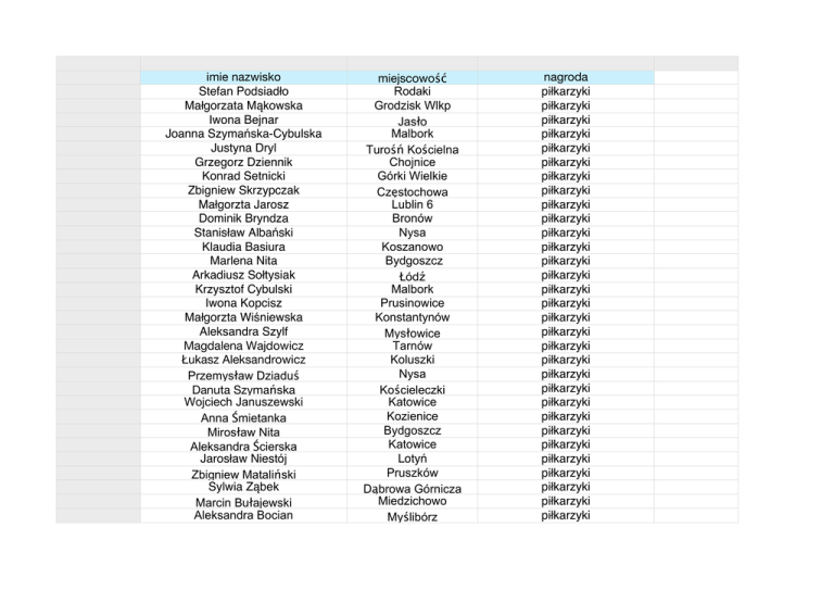 imie nazwisko Stefan Podsiadło Małgorzata Mąkowska Iwona Bejnar Joanna Szymańska-Cybulska Justyna Dryl Grzegorz Dziennik Konrad Setnicki Zbigniew Skrzypczak Małgorzta Jarosz Dominik Bryndza Stanisław Albański Klaudia Basiura Marlena Nita Arkadiusz Sołtysiak Krzysztof Cybulski Iwona Kopcisz Małgorzta Wiśniewska Aleksandra Szylf Magdalena Wajdowicz Łukasz Aleksandrowicz Przemysław Dziaduś Danuta Szymańska Wojciech Januszewski Anna Śmietanka Mirosław Nita Aleksandra Ścierska Jarosław Niestój Zbigniew Mataliński Sylwia Ząbek Marcin Bułajewski Aleksandra Bocian miejscowość Rodaki Grodzisk Wlkp Jasło Malbork Turośń Kościelna Chojnice Górki Wielkie Częstochowa Lublin 6 Bronów Nysa Koszanowo Bydgoszcz Łódź Malbork Prusinowice Konstantynów Mysłowice Tarnów Koluszki Nysa Kościeleczki Katowice Kozienice Bydgoszcz Katowice Lotyń Pruszków Dąbrowa Górnicza Miedzichowo Myślibórz nagroda piłkarzyki piłkarzyki piłkarzyki piłkarzyki piłkarzyki piłkarzyki piłkarzyki piłkarzyki piłkarzyki piłkarzyki piłkarzyki piłkarzyki piłkarzyki piłkarzyki piłkarzyki piłkarzyki piłkarzyki piłkarzyki piłkarzyki piłkarzyki piłkarzyki piłkarzyki piłkarzyki piłkarzyki piłkarzyki piłkarzyki piłkarzyki piłkarzyki piłkarzyki piłkarzyki piłkarzyki Marcin Mańkowski Katarzyna Szafran Teresa Zakrzewska Renata Fima Poznań Katowice Łowicz Gdów piłkarzyki piłkarzyki piłkarzyki piłkarzyki Anna Nocoń Józef Pleszczak Marcin Przybysz Artur Soliński Adam Niedzień Katarzyna Chmielewska Jadwiga Łakota Magdalena Salwerowicz Adam Kozłowski Mirosława Kut Konrad Setnicki Alina Januszewska Jolanta Selingier Wiesław Szeląg Sylwia Kosińska Izabela Pawlik Łukasz Lisiewicz Barbara Stwora Beata Bisewska Ewelina Pustółka Kinga Lelit Andrzej Wojciechowski Erwina Grochowalska Tomasz Grochowalski Edward Wojtowicz Andrea Chorubczyk Paweł Cieślak Frombork Prusinowice Nowy Dwór Mazowiecki Nysa Klucze Szczecin Bełchatów Kielce Chojnice Tomaszów Mazowiecki Górki Wielkie Katowice Koluszki Bielsko Biała Biała Wodzisław Śląski Wrocław Bielsko Biała Kościeleczki Rybnik Częstochowa Kościan Czarny Bór Czarny Bór Jaworzno Zabrze Przasnysz urządzenie do popcornu urządzenie do popcornu urządzenie do popcornu urządzenie do popcornu urządzenie do popcornu urządzenie do popcornu urządzenie do popcornu urządzenie do popcornu urządzenie do popcornu urządzenie do popcornu urządzenie do popcornu urządzenie do popcornu urządzenie do popcornu urządzenie do popcornu urządzenie do popcornu urządzenie do popcornu urządzenie do popcornu urządzenie do popcornu urządzenie do popcornu urządzenie do popcornu urządzenie do popcornu urządzenie do popcornu urządzenie do popcornu urządzenie do popcornu urządzenie do popcornu urządzenie do popcornu urządzenie do popcornu Eleonora Koziołek Radosław Śledzikowski Natalia Śledziowska Tadeusz Bartosik Aneta Walczuk Anna Kucia Rybnik Skarżysko-Kamienna Starachowice Jaworzno Biała Podlaska Leoncin urządzenie do popcornu urządzenie do popcornu urządzenie do popcornu urządzenie do popcornu urządzenie do popcornu urządzenie do popcornu
