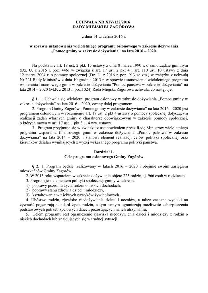 UCHWAŁA NR XIV/122/2016 RADY MIEJSKIEJ ZAGÓROWA z dnia 14 września 2016 r. w sprawie ustanowienia wieloletniego programu osłonowego w zakresie dożywiania „Pomoc gminy w zakresie dożywiania” na lata 2016 – 2020. Na podstawie art. 18 ust. 2 pkt. 15 ustawy z dnia 8 marca 1990 r. o samorządzie gminnym (Dz. U. z 2016 r. poz. 446) w związku z art. 17 ust. 2 pkt 4 i art. 110 ust. 10 ustawy z dnia 12 marca 2004 r. o pomocy społecznej (Dz. U. z 2016 r. poz. 913 ze zm.) w związku z uchwałą Nr 221 Rady Ministrów z dnia 10 grudnia 2013 r. w sprawie ustanowienia wieloletniego programu wspierania finansowego gmin w zakresie dożywiania "Pomoc państwa w zakresie dożywiania" na lata 2014 – 2020 (M.P. z 2013 r. poz.1024) Rada Miejska Zagórowa uchwala, co następuje: § 1. 1. Uchwala się wieloletni program osłonowy w zakresie dożywiania „Pomoc gminy w zakresie dożywiania” na lata 2016 – 2020, zwany dalej programem. 2. Program Gminy Zagórów „Pomoc gminy w zakresie dożywiania” na lata 2016 – 2020 jest programem osłonowym w rozumieniu art. 17 ust. 2 pkt 4 ustawy o pomocy społecznej dotyczącym realizacji zadań własnych gminy o charakterze obowiązkowym w zakresie pomocy społecznej, o których mowa w art. 17 ust. 1 pkt 3 i 14 ww. ustawy. 3. Program przyjmuje się w związku z ustanowieniem przez Radę Ministrów wieloletniego programu wspierania finansowego gmin w zakresie dożywiania „Pomoc państwa w zakresie dożywiania” na lata 2014 – 2020 i stanowi element realizacji celów polityki społecznej oraz kierunków działań wynikających z wyżej wskazanego programu polityki państwa. Rozdział 1. Cele programu osłonowego Gminy Zagórów § 2. 1. Program będzie realizowany w latach 2016 – 2020 i obejmie swoim zasięgiem mieszkańców Gminy Zagórów. 2. W 2015 roku wsparciem w zakresie dożywiania objęto 225 rodzin, tj. 966 osób w rodzinach. 3. Program jest elementem polityki społecznej gminy w zakresie: 1) poprawy poziomu życia rodzin o niskich dochodach, 2) poprawy stanu zdrowia dzieci i młodzieży, 3) kształtowania właściwych nawyków żywieniowych. 4. Ubóstwo rodzin, zjawisko niedożywienia dzieci i uczniów, a także znaczne wydatki na żywność pogarszają standard życia rodzin, a tym samym ograniczają możliwość zabezpieczenia podstawowych potrzeb życiowych dzieci, pozostających na ich utrzymaniu. 5. Celem programu jest ograniczenie zjawiska niedożywienia dzieci i młodzieży z rodzin o niskich dochodach lub znajdujących się w trudnej sytuacji. Rozdział 2. Zadania programu § 3. 1. W ramach programu udziela się wsparcia: 1) dzieciom do czasu podjęcia nauki w szkole podstawowej, 2) uczniom do czasu ukończenia nauki w szkole ponadgimnazjalnej. 2. W szczególnie uzasadnionych przypadkach, gdy uczeń albo dziecko wyraża zamiar spożycia posiłku, dyrektor szkoły lub przedszkola informuje ośrodek pomocy społecznej o potrzebie udzielenia pomocy w formie posiłku. Przyznanie takiej formy pomocy odbywa się bez wydawania decyzji administracyjnej przyznającej posiłek oraz bez przeprowadzania rodzinnego wywiadu środowiskowego. 3. Liczba dzieci i uczniów, którym będzie udzielona pomoc w formie przyznania posiłku bez decyzji administracyjnej i bez przeprowadzania rodzinnego wywiadu środowiskowego nie może przekroczyć 20% liczby dzieci i uczniów dożywianych w szkołach i przedszkolach na terenie gminy Zagórów w poprzednim miesiącu kalendarzowym. Rozdział 3. Podmioty realizujące program i jego finansowanie § 4. 1. Program realizuje Miejsko-Gminny Ośrodek Pomocy Społecznej w Zagórowie we współpracy z gminnymi i powiatowymi placówkami oświatowymi, z którymi zawarto stosowne porozumienia i umowy. 2. Program jest finansowany ze środków własnych gminy oraz z dotacji budżetu państwa otrzymanej w ramach dofinansowania realizacji wieloletniego programu wspierania finansowego gmin w zakresie dożywiania „Pomoc państwa w zakresie dożywiania” na lata 2014 – 2020 (M.P. z 2013 r., poz.1024). 3. Z realizacji programu sporządzana jest kwartalna i roczna informacja, będąca elementem składowym rozliczania wieloletniego programu wspierania finansowego gmin w zakresie dożywiania „Pomoc państwa w zakresie dożywiania” na lata 2014 – 2020 (M.P. z 2013 r., poz.1024). § 5. Wykonanie uchwały powierza się Burmistrzowi Gminy Zagórów. § 6. Uchwała wchodzi w życie po upływie 14 dni od dnia ogłoszenia w Dzienniku Urzędowym Województwa Wielkopolskiego. Przewodniczący Rady Miejskiej Marian Parus UZASADNIENIE do uchwały nr XIV/122/2016 Rady Miejskiej Zagórowa z dnia 14 września 2016 r. w sprawie ustanowienia wieloletniego programu osłonowego w zakresie dożywiania „Pomoc gminy w zakresie dożywiania” na lata 2016 – 2020. Przyjęty przez Radę Ministrów wieloletni program wspierania finansowego gmin w zakresie dożywiania pn. ,,Pomoc państwa w zakresie dożywiania" na lata 2014 – 2020 ma na celu ograniczenie m. in. zjawiska niedożywienia dzieci i młodzieży. Program ten przewiduje wsparcie gmin, które w szczególnie uzasadnionych przypadkach, będą udzielały pomocy, gdy uczeń albo dziecko wyraża chęć zjedzenia posiłku, a odpowiednio dyrektor szkoły lub przedszkola informuje ośrodek pomocy społecznej o potrzebie udzielenia pomocy w formie posiłku. Przy czym liczba dzieci i uczniów, którym ma być udzielona pomoc w ww. sposób, nie może przekroczyć 20 % liczby dzieci i uczniów dożywianych w szkołach i przedszkolach na terenie gminy w poprzednim miesiącu kalendarzowym. Warunkiem przyznania takiej pomocy, bez wydania decyzji administracyjnej przyznającej posiłek oraz bez przeprowadzania rodzinnego wywiadu środowiskowego, jest przyjęcie przez gminy odpowiedniego programu osłonowego, o którym mowa w ustawie o pomocy społecznej, który takie rozwiązania na terenie gminy będzie przewidywał. Ustawa o pomocy społecznej daje możliwość tworzenia i realizacji progr