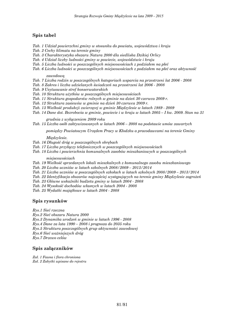 Strategia Rozwoju Gminy Międzylesie na lata 2009 - 2015 Spis tabel Tab. 1 Udział powierzchni gminy w stosunku do powiatu, województwa i kraju Tab. 2 Cechy klimatu na terenie gminy Tab. 3 Charakterystyka obszaru Natura 2000 dla siedliska Dzikiej Orlicy Tab. 4 Udział liczby ludności gminy w powiecie, województwie i kraju Tab. 5 Liczba ludności w poszczególnych miejscowościach z podziałem na płeć Tab. 6 Liczba ludności w poszczególnych miejscowościach z podziałem na płeć oraz aktywność zawodową Tab. 7 Liczba rodzin w poszczególnych kategoriach wsparcia na przestrzeni lat 2006 - 2008 Tab. 8 Zakres i liczba udzielanych świadczeń na przestrzeni lat 2006 - 2008 Tab. 9 Usytuowanie stref konserwatorskich Tab. 10 Struktura użytków w poszczególnych miejscowościach Tab. 11 Struktura gospodarstw rolnych w gminie na dzień 30 czerwca 2009 r. Tab. 12 Struktura zasiewów w gminie na dzień 30 czerwca 2009 r. Tab. 13 Wielkość produkcji zwierzęcej w gminie Międzylesie w latach 1989 - 2009 Tab. 14 Dane dot. Bezrobocia w gminie, powiecie i w kraju w latach 2005 – I kw. 2009. Stan na 31 grudnia z wyłączeniem 2009 roku Tab. 15 Liczba osób zaktywizowanych w latach 2006 – 2008 na podstawie umów zawartych pomiędzy Powiatowym Urzędem Pracy w Kłodzku a pracodawcami na terenie Gminy Międzylesie. Tab. 16 Długość dróg w poszczególnych obrębach Tab. 17 Liczba przyłączy telefonicznych w poszczególnych miejscowościach Tab. 18 Liczba i powierzchnia komunalnych zasobów mieszkaniowych w poszczególnych miejscowościach Tab. 19 Wielkość sprzedanych lokali mieszkalnych z komunalnego zasobu mieszkaniowego Tab. 20 Liczba uczniów w latach szkolnych 2008/2009 – 2013/2014 Tab. 21 Liczba uczniów w poszczególnych szkołach w latach szkolnych 2008/2009 – 2013/2014 Tab. 22 Identyfikacja obszarów najczęściej występujących na terenie gminy Międzylesie zagrożeń Tab. 23 Główne wskaźniki budżetu gminy w latach 2004 - 2008 Tab. 24 Wysokość dochodów własnych w latach 2004 - 2008 Tab. 25 Wydatki majątkowe w latach 2004 - 2008 Spis rysunków Rys.1 Sieć rzeczna Rys.2 Sieć obszaru Natura 2000 Rys.3 Dynamika urodzeń w gminie w latach 1996 - 2008 Rys.4 Dane za lata 1990 – 2008 i prognoza do 2035 roku Rys.5 Struktura poszczególnych grup aktywności zawodowej Rys.6 Sieć ważniejszych dróg Rys.7 Drzewo celów Spis załączników Zał. 1 Fauna i flora chroniona Zał. 2 Zabytki wpisane do rejestru 81 /81 Strategia Rozwoju Gminy Międzylesie na lata 2009 - 2015 Załącznik nr 1 FAUNA I FLORA CHRONIONA Zestawienie gatunków roślin objętych ochroną ścisłą gatunek Ciemiężyca zielona Dziewięćsił bezłodygowy Gnieźnik leśny Gółka długoostrogowa Kukułka Fuchsa Kukułka szerokolistna Liczydło górskie Lilia złotogłów Listera jajowata Omieg górski Orlik pospolity Paprotka zwyczajna Parzydło leśne Podkolan zielonawy Śnieżyca wiosenna Śnieżyczka przebiśnieg Wawrzynek wilcze-łyko Widłak wroniec Zimowit jesienny Łącznie: Liczba stanowisk 12 20 2 2 2 28 4 3 8 1 3 2 1 1 8 1 2 1 11 117 Zestawienie gatunków ssaków objętych ochroną ścisłą Rodzina jeżowate ryjówkowate kretowate wiewiórkowate popielicowate łasicowate gatunek Jeż wschodni Jeż zachodni Ryjówka górska Ryjówka aksamitna Ryjówka malutka Rzęsorek mniejszy Rzęsorek rzeczny Zębiałek karliczek Kret Wiewiórka Popielica Orzesznica Koszatka Gronostaj Łasica łac. Erinaceus concolor Erinaceus europaeus Sorex alpinus Sorex araneus Sorex minutus Neomys anomalus Neomys fodiens Crocidura suaveolens Talpa europea Sciurus vulgaris Glis glis Muscardinum avellanarius Dryomys nitedula Mustela erminea Mustela nivalis Zestawienie gatunków nietoperzy objętych ochroną ścisłą Nazwa gatunkowa Podkowie cały Nocek duży Nocek Natterera Nocek orzęsiony Nocek wąsatek Nocek rudy Mroczek posrebrzany Mroczek pozłocisty Mroczek późny Karlik malutki Karlik drobny Gacek brunatny Mopek łac. Rhinolophus hipposideros Myotis myotis Myotis nattereri Myotis emarginatus Myotis mystacinus Myotis daubentonii Vespertilio murinus Eptasicus nilssonii Eptesicus serotinus Pipistrellus pipistrellus Pipistrellus pygmaeus Plecotus auritus Barbastella barbastellus 82 /81 Strategia Rozwoju Gminy Międzylesie na lata 2009 - 2015 Załącznik nr 2 Zabytki wpisane do rejestru miejscowość obiekt Bud. Numer rejestrowy Boboszów Kościół p.w. Św. Anny 1811 r. Nr rej. 1966 z dnia 22.12.1971 Długopole Grn. Kościół p.w. Św. Piotra i Pawła 1587 r. Nr rej. 1324 z dnia 03.08.1965 Poł. XVIII w Nr rej. 2024 z dnia 25.05.1972 Dwór (obecnie bud. mieszkalny nr 70) 1807 r. Nr rej. 1325 z dnia 03.08.1965 Dwór (obecnie bud. mieszkalny nr 165) 1 poł XVIII w Nr rej. 1984 z dnia 22.12.1971 Kościół p.w. Św. Mikolaja 1563 r. Nr rej. 1326 z dnia 03.08.1965 Plebania 1781 r. Nr rej. 1380/Wł z dnia 27.11.1992 Kaplica przy kościele 1751 r. Nr rej. 2025 z dnia 25.05.1972 Kaplica cmentarna Domaszków Zespół mieszkalno-gospodarczy (b.Caritas) Gniewoszów Goworów 2 poł. XIX w Nr rej. 1591/Wł Kościół p.w. Św. Michała Archanioła 1568 r. Nr rej. 871 z dnia 05.05.1961 Ruiny zamku Szczerba XIV w Nr rej. 1341 z dnia 03.08.1965 Pałac, nr 22 Młyn (obecnie bud. mieszkalny nr 65) 1650-1750 r. Nr rej. 669/Wł z dnia 04.10.1977 1811 r. Nr rej. 1443/Wł z dnia 19.09.1995 1801-1850 r. Nr rej. 1359/Wł z dnia 10.12.1991 Jaworek Kościół p.w. Św. Barbary Jodłów Kościół p.w. Św. Jana Chrzciciela 1756 r. Nr rej. 976/Wł z dnia 08.12.1983 Kamieńczyk Kościół p.w. Św. Michała Archanioła 1710 r. Nr rej. 471 z dnia 26.07.1958 Lesica Kościół p.w. Św. Marcina 1706 r. Nr rej. 975/Wł z dnia 09.12.1983 Międzylesie Kościół p.w. Bożego Ciała 1560 r. Nr rej. 1071 z dnia 24.01.1964 Kościół p.w. Św. Barbary XVI w Nr rej. 1337 z dnia 03.08.1965 Zamek (dwór) XIV w Nr rej. 468 z dnia 10.10.1957 1686-1695 r. Nr rej. 486 z dnia 10.10.1957 Most przy pałacu XVII w Nr rej. 486 z dnia 10.10.1957 Ogród przy pałacu