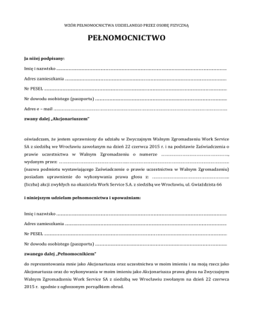 WZÓR PEŁNOMOCNICTWA UDZIELANEGO PRZEZ OSOBĘ FIZYCZNĄ PEŁNOMOCNICTWO Ja niżej podpisany: Imię i nazwisko ................................................................................................................................................................................. Adres zamieszkania ........................................................................................................................................................................ Nr PESEL .............................................................................................................................................................................................. Nr dowodu osobistego (paszportu) ......................................................................................................................................... Adres e – mail …………………………………………………………………………………………………………………………………. zwany dalej „Akcjonariuszem” oświadczam, że jestem uprawniony do udziału w Zwyczajnym Walnym Zgromadzeniu Work Service SA z siedzibą we Wrocławiu zawołanym na dzień 22 czerwca 2015 r. i na podstawie Zaświadczenia o prawie uczestnictwa w Walnym Zgromadzeniu o numerze …………………………………………………, wydanym przez: ………………………………………………………………………………………………………………………………. (nazwa podmiotu wystawiającego Zaświadczenie o prawie uczestnictwa w Walnym Zgromadzeniu) posiadam uprawnienie do wykonywania prawa głosu z: …………………………………………………….….. (liczba) akcji zwykłych na okaziciela Work Service S.A. z siedzibą we Wrocławiu, ul. Gwiaździsta 66 i niniejszym udzielam pełnomocnictwa i upoważniam: Imię i nazwisko ................................................................................................................................................................................. Adres zamieszkania ........................................................................................................................................................................ Nr PESEL .............................................................................................................................................................................................. Nr dowodu osobistego (paszportu) ......................................................................................................................................... zwanego dalej „Pełnomocnikiem” do reprezentowania mnie jako Akcjonariusza oraz uczestnictwa w moim imieniu i na moją rzecz jako Akcjonariusza oraz do wykonywania w moim imieniu jako Akcjonariusza prawa głosu na Zwyczajnym Walnym Zgromadzeniu Work Service SA z siedzibą we Wrocławiu zwołanym na dzień 22 czerwca 2015 r. zgodnie z ogłoszonym porządkiem obrad. WZÓR PEŁNOMOCNICTWA UDZIELANEGO PRZEZ OSOBĘ FIZYCZNĄ Na mocy niniejszego pełnomocnictwa Pełnomocnik upoważniony jest do wykonywania w moim imieniu jako Akcjonariusza wszystkich uprawnień przysługujących akcjonariuszowi na Walnym Zgromadzeniu z akcji Work Service A w liczbie ………………..……………………………….... (słownie: ……………………………………………………………………………………………………………………….…). Dodatkowe informacje, klauzule, wyłączenia, szczególne uprawnienia Pełnomocnika, w szczególności informacja czy pełnomocnikowi przysługuje prawo do udzielania dalszych pełnomocnictw: ……………………………………………………………………………………………………………………………………………………... ……………………………………………………………………………………………………………………………………………………... ……………………………………………………………………………………………………………………………………………………... (w przypadku niewypełnienia – przekreślić). …………………………………………………………………………… (data i czytelny podpis Akcjonariusza) WAŻNE INFORMACJE: Identyfikacja Akcjonariusza. W celu identyfikacji Akcjonariusza udzielającego pełnomocnictwa, do niniejszego pełnomocnictwa powinna zostać załączona kopia dowodu osobistego, paszportu lub innego urzędowego dokumentu tożsamości akcjonariusza. Dodatkowo akcjonariusz będący osobą fizyczną winien załączyć oświadczenie o wyrażeniu zgody na przetwarzanie przez Spółkę danych osobowych w celu identyfikacji akcjonariusza na potrzeby weryfikacji ważności pełnomocnictwa udzielonego w postaci elektronicznej, W przypadku wątpliwości co do prawdziwości kopii wyżej wymienionych dokumentów, Zarząd Spółki zastrzega sobie prawo do żądania od pełnomocnika okazania przy sporządzaniu listy obecności kopii potwierdzonej za zgodność z oryginałem przez notariusza lub inny podmiot uprawniony do potwierdzania za zgodność z oryginałem kopii dowodu osobistego, paszportu lub innego urzędowego dokumentu tożsamości akcjonariusza. Identyfikacja pełnomocnika W celu identyfikacji pełnomocnika, Zarząd Spółki zastrzega sobie prawo do żądania od pełnomocnika okazania przy sporządzaniu listy obecności: a) W przypadku pełnomocnika będącego osobą fizyczną - kopii dowodu osobistego, paszportu lub innego urzędowego dokumentu tożsamości pełnomocnika; b) W przypadku pełnomocnika innego niż osoba fizyczna - oryginału lub kopii potwierdzonej za zgodność z oryginałem przez notariusza lub inny podmiot uprawniony do potwierdzania za zgodność z oryginałem odpisu z właściwego rejestru lub innego dokumentu potwierdzającego upoważnienie osob