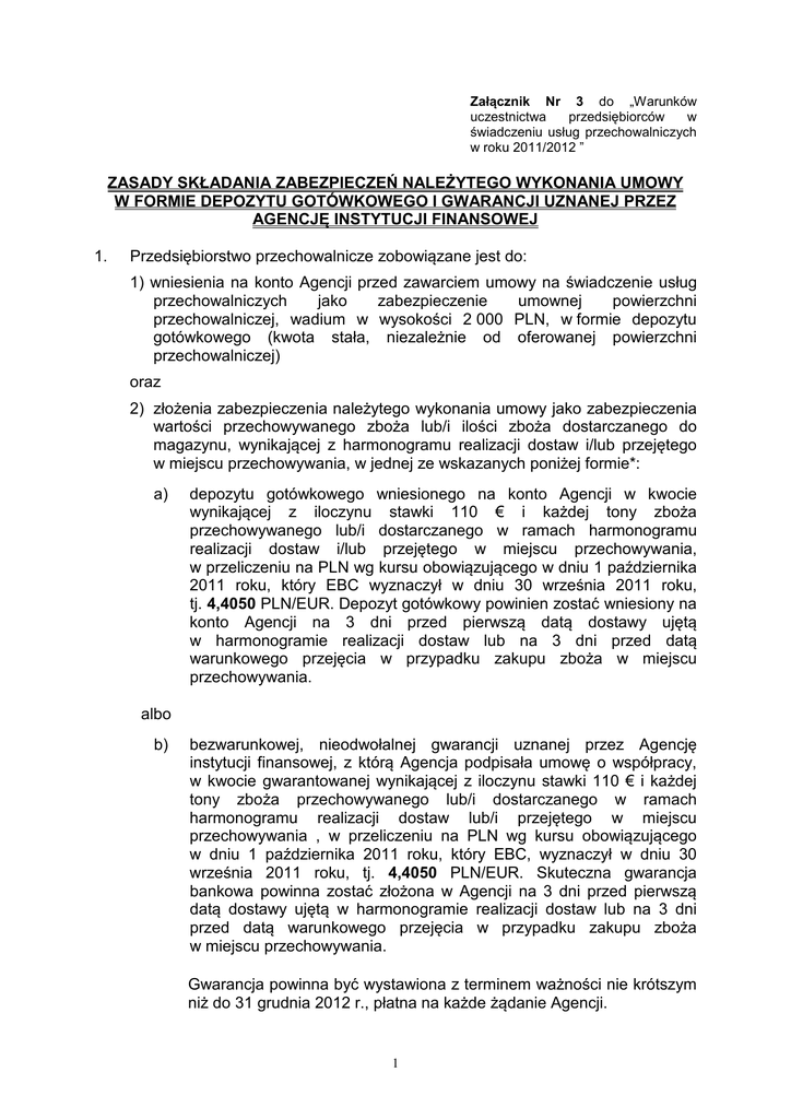 Załącznik Nr 3 do „Warunków uczestnictwa przedsiębiorców w świadczeniu usług przechowalniczych w roku 2011/2012 ” ZASADY SKŁADANIA ZABEZPIECZEŃ NALEŻYTEGO WYKONANIA UMOWY W FORMIE DEPOZYTU GOTÓWKOWEGO I GWARANCJI UZNANEJ PRZEZ AGENCJĘ INSTYTUCJI FINANSOWEJ 1. Przedsiębiorstwo przechowalnicze zobowiązane jest do: 1) wniesienia na konto Agencji przed zawarciem umowy na świadczenie usług przechowalniczych jako zabezpieczenie umownej powierzchni przechowalniczej, wadium w wysokości 2 000 PLN, w formie depozytu gotówkowego (kwota stała, niezależnie od oferowanej powierzchni przechowalniczej) oraz 2) złożenia zabezpieczenia należytego wykonania umowy jako zabezpieczenia wartości przechowywanego zboża lub/i ilości zboża dostarczanego do magazynu, wynikającej z harmonogramu realizacji dostaw i/lub przejętego w miejscu przechowywania, w jednej ze wskazanych poniżej formie*: a) depozytu gotówkowego wniesionego na konto Agencji w kwocie wynikającej z iloczynu stawki 110 € i każdej tony zboża przechowywanego lub/i dostarczanego w ramach harmonogramu realizacji dostaw i/lub przejętego w miejscu przechowywania, w przeliczeniu na PLN wg kursu obowiązującego w dniu 1 października 2011 roku, który EBC wyznaczył w dniu 30 września 2011 roku, tj. 4,4050 PLN/EUR. Depozyt gotówkowy powinien zostać wniesiony na konto Agencji na 3 dni przed pierwszą datą dostawy ujętą w harmonogramie realizacji dostaw lub na 3 dni przed datą warunkowego przejęcia w przypadku zakupu zboża w miejscu przechowywania. albo b) bezwarunkowej, nieodwołalnej gwarancji uznanej przez Agencję instytucji finansowej, z którą Agencja podpisała umowę o współpracy, w kwocie gwarantowanej wynikającej z iloczynu stawki 110 € i każdej tony zboża przechowywanego lub/i dostarczanego w ramach harmonogramu realizacji dostaw lub/i przejętego w miejscu przechowywania , w przeliczeniu na PLN wg kursu obowiązującego w dniu 1 października 2011 roku, który EBC, wyznaczył w dniu 30 września 2011 roku, tj. 4,4050 PLN/EUR. Skuteczna gwarancja bankowa powinna zostać złożona w Agencji na 3 dni przed pierwszą datą dostawy ujętą w harmonogramie realizacji dostaw lub na 3 dni przed datą warunkowego przejęcia w przypadku zakupu zboża w miejscu przechowywania. Gwarancja powinna być wystawiona z terminem ważności nie krótszym niż do 31 grudnia 2012 r., płatna na każde żądanie Agencji. 1 Przedsiębiorstwo przechowalnicze może również złożyć gwarancję na pełną kwotę odpowiadającą umownej pojemności przechowalniczej. Wzory gwarancji transakcji pojedynczej i zbiorczej, nr rachunku bankowego Agencji oraz aktualny wykaz instytucji finansowych, które podpisały z Agencją umowę o współpracy jak również szczegółowe zasady wnoszenia powyższych form zabezpieczenia oraz ich zwrotu, znajdują się na stronie internetowej ARR (www.arr.gov.pl). 2. Przedsiębiorstwo przechowalnicze zobowiązane jest do przedłużania ważności gwarancji na 90 dni przed upływem terminu jej obowiązywania. 3. Przed zawarciem umowy, Przedsiębiorstwo przechowalnicze zobowiązane jest udokumentować dokonanie wpłaty wadium na konto Agencji, o którym mowa w pkt. 1 ppkt.1). 4. Wadium, o którym mowa w pkt. 1 ppkt. 1), zostanie zwolnione bez odsetek po należytym wykonaniu umowy i po dostarczeniu do Agencji poprawnie wypełnionego „Wniosku o zwrot zabezpieczenia - przedsiębiorca” wraz z wymaganymi załącznikami. Formularz „Wniosku o zwrot zabezpieczenia - przedsiębiorca” można pobrać w Centrali Agencji lub ze strony internetowej Agencji (www.arr.gov.pl). *Formy zabezpieczenia zgodne z Art.8 ust 1 RK(EWG) nr 2220/85 z 22 lipca 1985 roku. 2