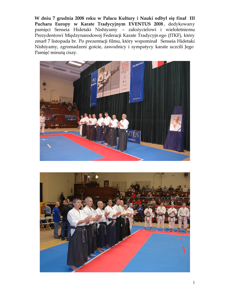 W dniu 7 grudnia 2008 roku w Pałacu Kultury i Nauki odbył się finał III Pucharu Europy w Karate Tradycyjnym EVENTUS 2008 , dedykowany pamięci Senseia Hidetaki Nishiyamy – założycielowi i wieloletniemu Prezydentowi Międzynarodowej Federacji Karate Tradycyjn ego (ITKF), który zmarł 7 listopada br. Po prezentacji filmu, który wspominał Senseia Hidetaki Nishiyamy, zgromadzeni goście, zawodnicy i sympatycy karate uczcili Jego Pamięć minutą ciszy. 1 Honorowy patronat nad zawodami objęła Hanna Gronkiewicz Waltz Prezydent Miasta Stołecznego Warszawy. Zmagania najlepszych ośmiu zawodników i ośmiu zawodniczek obserwowali Rick Jorgensen – Prezydent Międzynarodowej Federacji Karate Tradycyjnego (ITKF), Vladimir Yorga – Prezydent Europejskiej Federacji Karate Tr adycyjnego (ETKF), Luciano Puricelli – Wiceprezydent ITKF oraz zgromadzeni kibice. Jak zawsze nie zawiedli Mieszkańcy Sulejówka, którzy licznie przybyli do Pałacu Kultury i Nauki razem z Burmistrzem Miasta Waldemarem Chachulskim oraz współpracującym z Miastem trenerem Karate Romanem Urbanem, by oglądać niezwykły pokaz walki. W naszym mieście jest cora z więcej sympatyków tego sportu, dzięki trzykrotnemu zdobywcy Pucharu Świata w Karate Tradycyjnym Krzysztofowi Neugebauerowi i orędownikowi Karate d r Włodzimierzowi Kwiecińskiemu Prezesowi Polskiego Związku Karate Tradycyjnego i kandydatowi na Prezesa Światowej Federacji Karate Tradycyjnego . 2 W zawodach spotkali się najlepsi zawodnicy karate tradycyjnego w Europie, niewątpliwie III Puchar należał do Polaków. Zarówno w Finale kobiet, jak i w finale mężczyzn spotkali się reprezentanci Polski. 3 W finale rywalizacji kobiet wicemistrzyni świata w ko -go kumite Justyna Marciniak pokonała mistrzynię świata i dwukrotną zdobywczynię Pu charu Europy Martę Niewczas. Finał mężczyzn był równie pasjonujący. Zmierzyli się w nim Daniel Iwanek – mistrz świata w fuku -go, z Łukaszem Wójcikiem – wicemistrzem świata w kumie drużynowym. Puchar Europy zdobył Łukasz Wójcik. Podczas zawodów odbył się również pokaz młodych zawodników z Warszawy i Lubelszczyzny, którzy zaprezentowali swoje doskonałe umiejętności i sprawność. 4 Końcowa klasyfikacja III Pucharu Europy Eventus 2008 w karate tradycyjnym: kobiety 1. Justyna Marciniak (Lubelski K KT) 2. Marta Niewczas (KU AZS Uniwersytetu Rzeszowskiego) 3. Maria Baryshnykova (Ukraina) 4. Corina Andreea Tanasescu (Rumunia) 5. Ilona Sakowicz (Zamojski KKT) 6. Chiara Polello (Włochy) 7. Jaqueline Schwar (Niemcy) 8. Emilija Jancevska (Macedonia) mężczyźni 1. Łukasz Wójcik (Kluczborski KK) 2. Daniel Iwanek (Lubelski KKT) 3. Wolodymyr Pucha (Ukraina) 4. Dejan Nedev (Macedonia) 5. Mirko Saffioti (Włochy) 6. Thomas El Marhomy (Francja) 7. Rudolph Bjorn (Niemcy) 8. Cornel Musat (Rumunia) 5 6