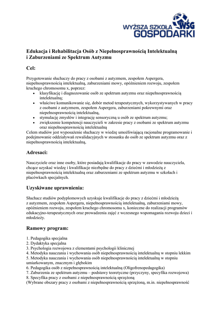 Edukacja i Rehabilitacja Osób z Niepełnosprawnością Intelektualną i Zaburzeniami ze Spektrum Autyzmu Cel: Przygotowanie słuchaczy do pracy z osobami z autyzmem, zespołem Aspergera, niepełnosprawnością intelektualną, zaburzeniami mowy, opóźnieniem rozwoju, zespołem kruchego chromosomu x, poprzez: klasyfikację i diagnozowanie osób ze spektrum autyzmu oraz niepełnosprawnością intelektualną; właściwe komunikowanie się, dobór metod terapeutycznych, wykorzystywanych w pracy z osobami z autyzmem, zespołem Aspergera, zaburzeniami pokrewnymi oraz niepełnosprawnością intelektualną, stymulację zmysłów i integrację sensoryczną u osób ze spektrum autyzmu; zwiększenie kompetencji nauczycieli w zakresie pracy z osobami ze spektrum autyzmu oraz niepełnosprawnością intelektualną Celem studiów jest wyposażenie słuchaczy w wiedzę umożliwiającą racjonalne programowanie i podejmowanie oddziaływań rewalidacyjnych w stosunku do osób ze spektrum autyzmu oraz z niepełnosprawnością intelektualną, Adresaci: Nauczyciele oraz inne osoby, które posiadają kwalifikacje do pracy w zawodzie nauczyciela, chcące uzyskać wiedzę i kwalifikacje niezbędne do pracy z dziećmi i młodzieżą z niepełnosprawnością intelektualną oraz zaburzeniami ze spektrum autyzmu w szkołach i placówkach specjalnych. Uzyskiwane uprawnienia: Słuchacz studiów podyplomowych uzyskuje kwalifikacje do pracy z dziećmi i młodzieżą z autyzmem, zespołem Aspergera, niepełnosprawnością intelektualną, zaburzeniami mowy, opóźnieniem rozwoju, zespołem kruchego chromosomu x, konieczne do realizacji programów edukacyjno-terapeutycznych oraz prowadzenia zajęć z wczesnego wspomagania rozwoju dzieci i młodzieży. Ramowy program: 1. Pedagogika specjalna 2. Dydaktyka specjalna 3. Psychologia rozwojowa z elementami psychologii klinicznej 4. Metodyka nauczania i wychowania osób niepełnosprawnością intelektualną w stopniu lekkim 5. Metodyka nauczania i wychowania osób niepełnosprawnością intelektualną w stopniu umiarkowanym, znacznym i głębokim 6. Pedagogika osób z niepełnosprawnością intelektualną (Oligofrenopedagogika) 7. Zaburzenia ze spektrum autyzmu – podstawy teoretyczne (przyczyny, specyfika rozwojowa) 8. Specyfika pracy z osobami z niepełnosprawnością sprzężoną (Wybrane obszary pracy z osobami z niepełnosprawnością sprzężoną, m.in. niepełnosprawność intelektualna/choroby psychiczne, niepełnosprawność intelektualna/n.ruchowa, niepełnosprawność intelektualna/choroba psychiczna/uzależnienie – praca z osobami z tzw. podwójną diagnozą) 9. Diagnoza pedagogiczna i psychologiczna 10. Wczesne wspomaganie rozwoju 11. Wybrane metody pracy z uczniem ze SPE 12. Współpraca z rodzicami i środowiskiem lokalnym (w treściach programu koniecznie należy poruszyć również obszar współpracy: rodzice/szkoła/poradnia pp) 13. Wybrane zagadnienia z prawa oświatowego (ścieżki kształcenia uczniów ze SPE, wymogi stawiane szkołom dla uczniów ze SPE) 14. Komunikacja wspomagająca i alternatywna 15. Elementy metody Integracji sensorycznej 16. Konstruowanie Indywidualnych programów edukacyjno-terapeutycznych (IPET) 17. Praca z dorosłymi osobami z niepełnosprawnością intelektualną 18. Diagnoza i ocena funkcjonowania osób z zaburzeniami ze spektrum autyzmu 19. Metody terapii osób z autystycznego spektrum zaburzeń 20. Elementy metody Integracji sensorycznej w pracy z osobami z autystycznego spektrum zaburzeń 21. Edukacja i terapia dzieci i młodzieży (trudności szkolne, kompetencje nauczyciela) 22. Praca z dorosłą osobą z zaburzeniami ze spektrum autyzmu 23. Metody komunikacji wspomagającej i alternatywnej z osobami z autystycznego spektrum zaburzeń 24. Analiza i terapia zachowań trudnych 25. Praktyka zawodowa; 26. Seminarium dyplomowe. Forma zaliczenia: • Test z wybranych zagadnień programowych • Praca dyplomowa Czas trwania: 3 semestry; Ilość godzin: 590 (w tym 240 godzin praktyk) Cena: Kierunek studiów podyplomowych Edukacja i Rehabilitacja Osób z Niepełnosprawnością Intelektualną i Zaburzeniami ze Spektrum Autyzmu Opłata jednorazowa ( 1 rata ) 3 6000 zł Opłata semestralna ( 2 raty ) 1 800 zł Opłata miesięczna ( 10 rat ) 380 zł
