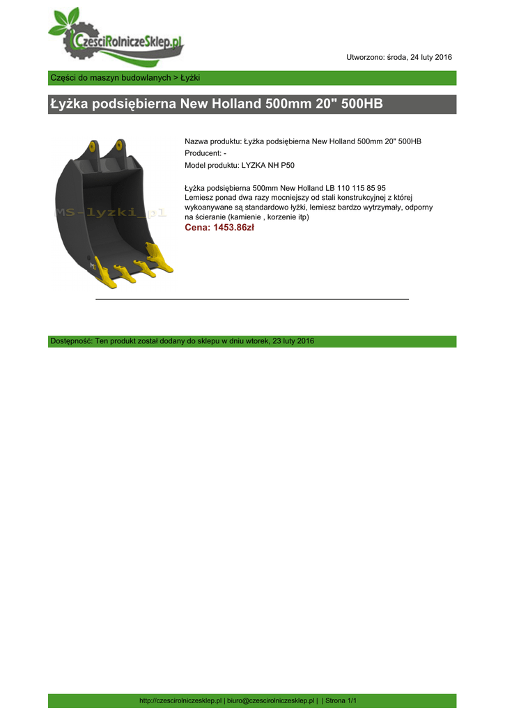 Utworzono: środa, 24 luty 2016 Części do maszyn budowlanych > Łyżki Łyżka podsiębierna New Holland 500mm 20" 500HB Nazwa produktu: Łyżka podsiębierna New Holland 500mm 20" 500HB Producent: Model produktu: LYZKA NH P50 Łyżka podsiębierna 500mm New Holland LB 110 115 85 95 Lemiesz ponad dwa razy mocniejszy od stali konstrukcyjnej z której wykoanywane są standardowo łyżki, lemiesz bardzo wytrzymały, odporny na ścieranie (kamienie , korzenie itp) Cena: 1453.86zł Dostępność: Ten produkt został dodany do sklepu w dniu wtorek, 23 luty 2016 http://czescirolniczesklep.pl | [email protected] | | Strona 1/1