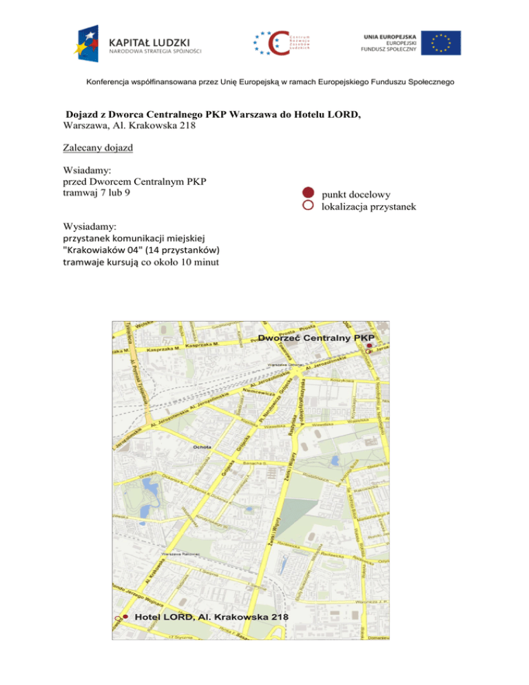 Konferencja współfinansowana przez Unię Europejską w ramach Europejskiego Funduszu Społecznego Dojazd z Dworca Centralnego PKP Warszawa do Hotelu LORD, Warszawa, Al. Krakowska 218 Zalecany dojazd Wsiadamy: przed Dworcem Centralnym PKP tramwaj 7 lub 9 Wysiadamy: przystanek komunikacji miejskiej "Krakowiaków 04" (14 przystanków) tramwaje kursują co około 10 minut punkt docelowy lokalizacja przystanek