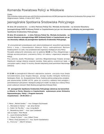 Komenda Powiatowa Policji w Mikołowie Źródło: http://mikolow.slaska.policja.gov.pl/k15/informacje/wiadomosci/42382,Jasnogorskie-Spotkania-Srodowiska-Policyjnego.html Wygenerowano: Sobota, 4 marca 2017, 08:33 Jasnogórskie Spotkania Środowiska Policyjnego W dniu 29 września br. - w dniu Patrona Policji Św. Michała Archanioła - na terenie Klasztoru Jasnogórskiego NMP Królowej Polski w Częstochowie już po raz dwunasty odbędą się Jasnogórskie Spotkania Środowiska Policyjnego. W dniu 29 września br. - w dniu Patrona Policji Św. Michała Archanioła - na terenie Klasztoru Jasnogórskiego NMP Królowej Polski w Częstochowie już po raz dwunasty odbędą się Jasnogórskie Spotkania Środowiska Policyjnego. W uroczystościach przewidywany jest udział przedstawicieli wszystkich garnizonów Policji z kraju, z Komendantem Głównym Policji nadinspektorem Markiem Działoszyńskim na czele, oraz przedstawiciele organizacji działających przy Policji. Początek pielgrzymki planowany jest na godzinę 10.40 na Placu Biegańskiego z którego wyruszą policjanci, pracownicy Policji, ich rodziny i organizacje związane z Policją . Przy pomniku Józefa Piłsudskiego i pomniku Błogosławionego Księdza Jerzego Popiełuszki nastąpi złożenie wiązanki kwiatów. Dalej pątnicy uczestniczyć będą w uroczystym apelu z okazji 73 rocznicy Zbrodni Katyńskiej przed pomnikiem Nieznanego Żołnierza. O 12.00 na Jasnogórskich Błoniach odprawiona zostanie uroczysta msza święta koncelebrowana przez Ksiądza Biskupa Jerzego Guzdka Delegata Konferencji Episkopatu Polski ds. Duszpasterstwa Policji. Godzinę później pielgrzymka przejdzie pod płaskorzeźbę GLORIA VICTIS, gdzie jej uczestnicy oddadzą hołd poległym i pomordowanym policjantom. Następnie pielgrzymi modlić się będą się w intencji Policji przed cudownym obrazem Matki Boskiej Jasnogórskiej Królowej Polski. XII Jasnogórskie Spotkania Środowiska Policyjnego zakończą się koncertem w Altanie w Parku Staszica w Częstochowie wykonanym przez Orkiestrę Reprezentacyjną Policji ( Program koncertu (Częstochowa – 29.09.2013 r.) 1. Marsz „ Market Garden ” – muz. Grzegorz Duchnowski 2. „ Warszawa w marszu ” – opr. Jerzy Kamyk 3. „ Puttin’ On The Ritz ” – muz. Irving Berlin 4. „ Bezwietrzny dzień ” – muz. Leon Landowski solo na trąbce – Piotr Misiak 5. „ Louis Armstrong Medley ” 6. „ Tribute To Dixie ” – muz. Gilbert Tinner 7. Marsz z Suity Jazzowej nr 2 – muz. Dymitr Szostakowicz 8. „ Fire & Ice ” – Otto M. Schwarz Równolegle w Sali Ojca Kordeckiego odbędzie się koncert chóru Komendy Wojewódzkiej Policji w Białymstoku (Program koncertu Gaude Mater Polonia, J.Arcadelt- Ave Maria, . A.Szaliński- Kyrie, Arr. A.Dresness- Nobody knows, Piotr SelimW mroku jest tyle światła, słowa Karol Wojtyła. Utwory patriotyczn - . J. Świder, słowa C.K. Norwid- Moja piosenka, W.L. Anczyc – Piechota, Pieśń powstańców stycznia 1863- Hej, strzelcy wraz SERDECZNIE WSZYSTKICH ZAPRASZAMY Źródło KWP Katowice/ KMP Częstochowa Ocena: 0/5 (0) Tweetnij