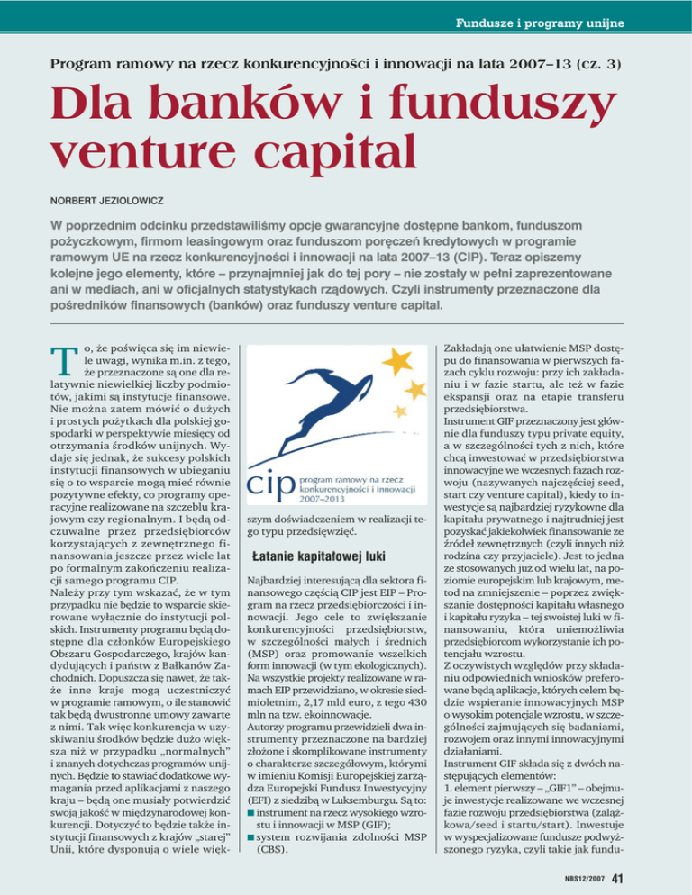 Fundusze i programy unijne Program ramowy na rzecz konkurencyjnoÊci i innowacji na lata 2007–13 (cz. 3) Dla banków i funduszy venture capital NORBERT JEZIOLOWICZ W poprzednim odcinku przedstawiliÊmy opcje gwarancyjne dost´pne bankom, funduszom po˝yczkowym, firmom leasingowym oraz funduszom por´czeƒ kredytowych w programie ramowym UE na rzecz konkurencyjnoÊci i innowacji na lata 2007–13 (CIP). Teraz opiszemy kolejne jego elementy, które – przynajmniej jak do tej pory – nie zosta∏y w pe∏ni zaprezentowane ani w mediach, ani w oficjalnych statystykach rzàdowych. Czyli instrumenty przeznaczone dla poÊredników finansowych (banków) oraz funduszy venture capital. o, że poświęca się im niewiele uwagi, wynika m.in. z tego, że przeznaczone są one dla relatywnie niewielkiej liczby podmiotów, jakimi są instytucje finansowe. Nie można zatem mówić o dużych i prostych pożytkach dla polskiej gospodarki w perspektywie miesięcy od otrzymania środków unijnych. Wydaje się jednak, że sukcesy polskich instytucji finansowych w ubieganiu się o to wsparcie mogą mieć równie pozytywne efekty, co programy operacyjne realizowane na szczeblu krajowym czy regionalnym. I będą odczuwalne przez przedsiębiorców korzystających z zewnętrznego finansowania jeszcze przez wiele lat po formalnym zakończeniu realizacji samego programu CIP. Należy przy tym wskazać, że w tym przypadku nie będzie to wsparcie skierowane wyłącznie do instytucji polskich. Instrumenty programu będą dostępne dla członków Europejskiego Obszaru Gospodarczego, krajów kandydujących i państw z Bałkanów Zachodnich. Dopuszcza się nawet, że także inne kraje mogą uczestniczyć w programie ramowym, o ile stanowić tak będą dwustronne umowy zawarte z nimi. Tak więc konkurencja w uzyskiwaniu środków będzie dużo większa niż w przypadku „normalnych” i znanych dotychczas programów unijnych. Będzie to stawiać dodatkowe wymagania przed aplikacjami z naszego kraju – będą one musiały potwierdzić swoją jakość w międzynarodowej konkurencji. Dotyczyć to będzie także instytucji finansowych z krajów „starej” Unii, które dysponują o wiele więk- T szym doświadczeniem w realizacji tego typu przedsięwzięć. ¸atanie kapita∏owej luki Najbardziej interesującą dla sektora finansowego częścią CIP jest EIP – Program na rzecz przedsiębiorczości i innowacji. Jego cele to zwiększanie konkurencyjności przedsiębiorstw, w szczególności małych i średnich (MSP) oraz promowanie wszelkich form innowacji (w tym ekologicznych). Na wszystkie projekty realizowane w ramach EIP przewidziano, w okresie siedmioletnim, 2,17 mld euro, z tego 430 mln na tzw. ekoinnowacje. Autorzy programu przewidzieli dwa instrumenty przeznaczone na bardziej złożone i skomplikowane instrumenty o charakterze szczegółowym, którymi w imieniu Komisji Europejskiej zarządza Europejski Fundusz Inwestycyjny (EFI) z siedzibą w Luksemburgu. Są to: ■ instrument na rzecz wysokiego wzrostu i innowacji w MSP (GIF); ■ system rozwijania zdolności MSP (CBS). Zakładają one ułatwienie MSP dostępu do finansowania w pierwszych fazach cyklu rozwoju: przy ich zakładaniu i w fazie startu, ale też w fazie ekspansji oraz na etapie transferu przedsiębiorstwa. Instrument GIF przeznaczony jest głównie dla funduszy typu private equity, a w szczególności tych z nich, które chcą inwestować w przedsiębiorstwa innowacyjne we wczesnych fazach rozwoju (nazywanych najczęściej seed, start czy venture capital), kiedy to inwestycje są najbardziej ryzykowne dla kapitału prywatnego i najtrudniej jest pozyskać jakiekolwiek finansowanie ze źródeł zewnętrznych (czyli innych niż rodzina czy przyjaciele). Jest to jedna ze stosowanych już od wielu lat, na poziomie europejskim lub krajowym, metod na zmniejszenie – poprzez zwiększanie dostępności kapitału własnego i kapitału ryzyka – tej swoistej luki w finansowaniu, która uniemożliwia przedsiębiorcom wykorzystanie ich potencjału wzrostu. Z oczywistych względów przy składaniu odpowiednich wniosków preferowane będą aplikacje, których celem będzie wspieranie innowacyjnych MSP o wysokim potencjale wzrostu, w szczególności zajmujących się badaniami, rozwojem oraz innymi innowacyjnymi działaniami. Instrument GIF składa się z dwóch następujących elementów: 1. element pierwszy – „GIF1” – obejmuje inwestycje realizowane we wczesnej fazie rozwoju przedsiębiorstwa (zalążkowa/seed i startu/start). Inwestuje w wyspecjalizowane fundusze podwyższonego ryzyka, czyli takie jak funduNBS12/2007 41 sze finansujące wczesne stadium rozwoju przedsiębiorstwa, działające w skali regionalnej, skupiające się na określonych sektorach, technologiach lub działaniach w dziedzinie badań i rozwoju technologii oraz związane z inkubatorami, które z kolei udostępniają kapitał MSP. Może również być współinwestorem w funduszach i instrumentach finansowych wspieranych przez „anioły biznesu”, 2. element drugi – „GIF2” – obejmuje inwestycje na etapie ekspansji i inwestuje w wyspecjalizowane fundusze podwyższonego ryzyka, które z kolei udostępniają kapitał typu „quasi-equity” lub kapitał własny innowacyjnym MSP o wysokim potencjale wzrostu w fazie ich ekspansji. Inwestycje z GIF2 unikają kapitału typu „buy-out” lub refinansowania służącego wyprzedaży aktywów nabywanego przedsiębiorstwa, ponieważ jest co prawda częścią działania neutralnych mechanizmów wolnego rynku, ale nie przyczynia się w sposób bezpośredni do tworzenia innowacyjnych technologii czy też rozwoju. Instrument GIF może inwestować w pośredników, współdziałając – o ile to możliwe – z krajowymi lub regionalnymi programami mającymi na celu tworzenie małych firm inwestycyjnych. Oprócz finansowania z GIF większość kapitału zainwestowanego w jakikolwiek fundusz musi pochodzić od inwestorów działających w 