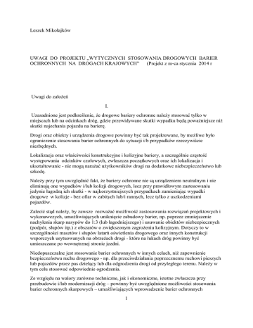 Leszek Mikołajków UWAGI DO PROJEKTU „WYTYCZNYCH STOSOWANIA DROGOWYCH BARIER OCHRONNYCH NA DROGACH KRAJOWYCH” (Projekt z m-ca stycznia 2014 r Uwagi do założeń I. Uzasadnione jest podkreślenie, że drogowe bariery ochronne należy stosować tylko w miejscach lub na odcinkach dróg, gdzie przewidywane skutki wypadku będą poważniejsze niż skutki najechania pojazdu na barierę. Drogi oraz obiekty i urządzenia drogowe powinny być tak projektowane, by możliwe było ograniczenie stosowania barier ochronnych do sytuacji i/b przypadków rzeczywiście niezbędnych. Lokalizacja oraz właściwości konstrukcyjne i kolizyjne bariery, a szczególnie częstość występowania odcinków czołowych, zwłaszcza początkowych oraz ich lokalizacja i ukształtowanie - nie mogą narażać użytkowników drogi na dodatkowe niebezpieczeństwo lub szkodę. Należy przy tym uwzględnić fakt, że bariery ochronne nie są urządzeniem neutralnym i nie eliminują one wypadków i/lub kolizji drogowych, lecz przy prawidłowym zastosowaniu jedynie łagodzą ich skutki - w najkorzystniejszych przypadkach zamieniając wypadki drogowe w kolizje - bez ofiar w zabitych lub/i rannych, lecz tylko z uszkodzeniami pojazdów. Zalecić stąd należy, by zawsze rozważać możliwość zastosowania rozwiązań projektowych i wykonawczych, umożliwiających uniknięcie zabudowy barier, np. poprzez zmniejszenie nachylenia skarp nasypów do 1:3 (lub łagodniejszego) i usuwanie obiektów niebezpiecznych (podpór, słupów itp.) z obszarów o zwiększonym zagrożeniu kolizyjnym. Dotyczy to w szczególności masztów i słupów latarń oświetlenia drogowego oraz innych konstrukcji wsporczych usytuowanych na obrzeżach drogi - które na łukach dróg powinny być umieszczane po wewnętrznej stronie jezdni. Niedopuszczalne jest stosowanie barier ochronnych w innych celach, niż zapewnienie bezpieczeństwa ruchu drogowego - np. dla przeciwdziałania poprzecznemu ruchowi pieszych lub pojazdów przez pas dzielący lub dla odgrodzenia drogi od przyległego terenu. Należy w tym celu stosować odpowiednie ogrodzenia. Ze względu na walory zarówno techniczne, jak i ekonomiczne, istotne zwłaszcza przy przebudowie i/lub modernizacji dróg – powinny być uwzględnione możliwości stosowania barier ochronnych skarpowych – umożliwiających wprowadzenie barier ochronnych 1 skrajnych na tych odcinkach dróg, na których niedostateczna szerokość pobocza nie czyni możliwym standardowego ich ustawienia. Dotyczy to zwłaszcza dróg o przekroju jezdni 2+1. II. Przypomnienia wymaga, że - stosownie do treści Rozp. Ministra Infrastruktury z dn. 12 kwietnia 2010 r zmieniającego rozporządzenie w spr. waruków technicznych dla znaków i sygnałów drogowych oraz urządzeń bezpieczeństwa ruchu drogowego i warunków ich umieszczania na drogach (Dz.U. Nr 65 z 2010 r, poz. 411) - do dyspozycji projektantów i zarządców dróg stawiane są – przy pewnych różnicach z treścią dokumentów uprzednio obowiązujących – następujące rodzaje drogowych barier ochronnych: - bariery metalowe – w tym m.in. bariery z prowadnicą z profilowanej taśmy stalowej oraz stalowe bariery linowe, - bariery betonowe, - bariery z innych materiałów. Wszystkie w zasadzie typy i odmiany drogowych barier ochronnych – jeżeli zostały w prawidłowy sposób przebadane w poligonowych badaniach zderzeniowych – są pod względem skuteczności kolizyjnej w zasadzie równoważne. Mogą być one natomiast różne pod względem swoich właściwości użytkowych - technicznych i eksploatacyjnych, a także niektórych właściwości kolizyjnych. Dotyczy to zwłaszcza barier metalowych. Bariery z prowadnicą z profilowanej taśmy salowej odznaczają się dużą uniwersalnością zastosowań. Przy tym – oczywiście, gdy nie są nadmiernie przesztywnione – zapewniają dostatecznie duże szanse przeżycia kierowcom i pasażerom najeżdżających na nie samochodów osobowych. Bariery metalowe linowe odznaczają się niskimi kosztami wykonania i utrzymania, a przy zastosowaniu jako bariery dzielące odznaczają się - w sytuacjach awaryjnych - łatwością zapewnienia możliwości przejazdu przez pas dzielący. Cenną ich cechą jest fakt, że nie mają one żadnego praktycznie wpływu na osadzanie się śniegu. Bariery betonowe pełne – co oczywiste, przy prawidłowo dobranym i sprawdzonym kolizyjnie zarysie ściany bocznej – są praktycznie nieprzejeżdżane nawet dla pojazdów samochodowych o dużej masie – mogą natomiast m.in. niekorzystne wpływać na osadzanie się śniegu na drodze. III. Każde najechanie pojazdu samochodowego na drogową barierę ochronną, a zwłaszcza najechanie na jej odcinek czołowy - początkowy, a na drogach jednojezdniowych także końcowy - zwłaszcza przy większej prędkości pojazdu - może być wypadkiem drogowym o poważnym charakterze. Kolejny raz należy stąd podkreślić, że drogi, na których odbywa się ruch samochodowy – szczególnie o dużym natężeniu i dużych prędkościach pojazdów – powinny być więc tak zaprojektowane i tak wykonane, by stosowanie na nich barier ochronnych miało charakter wyjątkowy. Uwagi wymaga, że obserwuje się naciski na stosowanie drogowych barier ochronnych o najwyższych poziomach powstrzymywania – nawet, gdy warunki ruchu drogowego i 2 niezbędny poziom zabezpieczenia nie wymagają ich zastosowania. Powszechne jest podnoszenie argumentu: „a co będzie, jeżeli samochód ciężarowy lub autobus przełamie barierę”. Argument ten jest pozornie zasadny – lecz pomija on fakt, że np. bariery ochronne z prowadnicą z profilowanej taśmy stalowej, o wysokim poziomie powstrzymywania, a więc o wysokiej wytrzymałości kolizyjnej, zdolne do utrzymania pojazdów drogowych o dużej masie – mogą być zbyt sztywne, a w konsekwencji niebezpieczne dla użytkowników samochodów osobowych, znacznie częściej występujących w ruchu drogowym i częściej uczestnicz