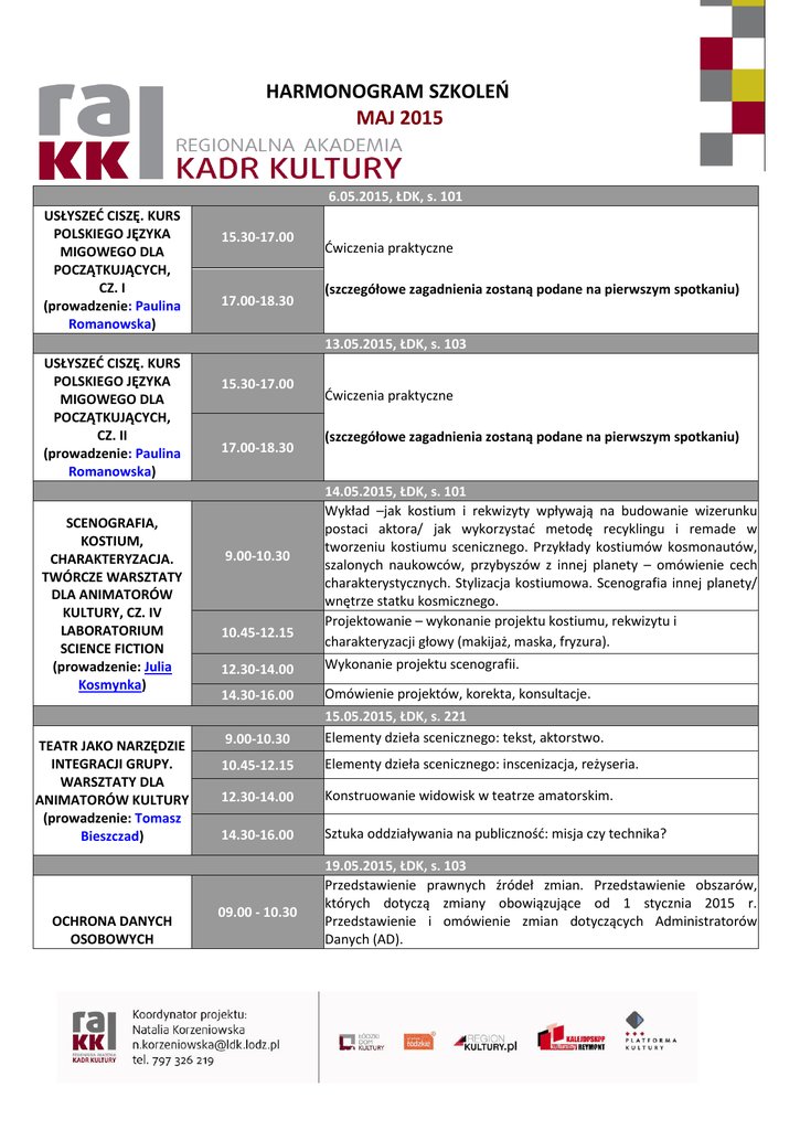 HARMONOGRAM SZKOLEŃ MAJ 2015 6.05.2015, ŁDK, s. 101 USŁYSZEĆ CISZĘ. KURS POLSKIEGO JĘZYKA MIGOWEGO DLA POCZĄTKUJĄCYCH, CZ. I (prowadzenie: Paulina Romanowska) 15.30-17.00 17.00-18.30 Ćwiczenia praktyczne (szczegółowe zagadnienia zostaną podane na pierwszym spotkaniu) 13.05.2015, ŁDK, s. 103 USŁYSZEĆ CISZĘ. KURS POLSKIEGO JĘZYKA MIGOWEGO DLA POCZĄTKUJĄCYCH, CZ. II (prowadzenie: Paulina Romanowska) SCENOGRAFIA, KOSTIUM, CHARAKTERYZACJA. TWÓRCZE WARSZTATY DLA ANIMATORÓW KULTURY, CZ. IV LABORATORIUM SCIENCE FICTION (prowadzenie: Julia Kosmynka) TEATR JAKO NARZĘDZIE INTEGRACJI GRUPY. WARSZTATY DLA ANIMATORÓW KULTURY (prowadzenie: Tomasz Bieszczad) OCHRONA DANYCH OSOBOWYCH 15.30-17.00 17.00-18.30 9.00-10.30 10.45-12.15 Ćwiczenia praktyczne (szczegółowe zagadnienia zostaną podane na pierwszym spotkaniu) 14.05.2015, ŁDK, s. 101 Wykład –jak kostium i rekwizyty wpływają na budowanie wizerunku postaci aktora/ jak wykorzystać metodę recyklingu i remade w tworzeniu kostiumu scenicznego. Przykłady kostiumów kosmonautów, szalonych naukowców, przybyszów z innej planety – omówienie cech charakterystycznych. Stylizacja kostiumowa. Scenografia innej planety/ wnętrze statku kosmicznego. Projektowanie – wykonanie projektu kostiumu, rekwizytu i charakteryzacji głowy (makijaż, maska, fryzura). 12.30-14.00 Wykonanie projektu scenografii. 14.30-16.00 Omówienie projektów, korekta, konsultacje. 9.00-10.30 15.05.2015, ŁDK, s. 221 Elementy dzieła scenicznego: tekst, aktorstwo. 10.45-12.15 Elementy dzieła scenicznego: inscenizacja, reżyseria. 12.30-14.00 Konstruowanie widowisk w teatrze amatorskim. 14.30-16.00 Sztuka oddziaływania na publiczność: misja czy technika? 09.00 - 10.30 19.05.2015, ŁDK, s. 103 Przedstawienie prawnych źródeł zmian. Przedstawienie obszarów, których dotyczą zmiany obowiązujące od 1 stycznia 2015 r. Przedstawienie i omówienie zmian dotyczących Administratorów Danych (AD). W INSTYTUCJI KUTLURY – ZMIANY W USTAWIE (prowadzenia: Agnieszka Majdzińska) 10.45 - 12.15 12.30 - 14.00 14.30 - 16.00 Przedstawienie i omówienie zamian dotyczących Administratora Bezpieczeństwa Informacji (ABI); - wymogi formalne niezbędne do pełnienia roli ABI, - miejsce w strukturze instytucji, - nowe obowiązki. Przedstawienie i omówienie zmian dotyczących Administratora Bezpieczeństwa Informacji (ABI) – ciąg dalszy: - zgłoszenie powołania ABI i termin jego dokonania, - zgłoszenie odwołania ABI i termin jego dokonania, - zgłaszanie zmian i termin ich dokonywania. Przedstawienie i omówienie zmian dotyczących Administratora Bezpieczeństwa Informacji (ABI) – ciąg dalszy: - przygotowywanie przykładowych zgłoszeń powołania i odwołania ABI oraz zgłoszeń zmian. Przedstawienie rozszerzonego katalogu zbiorów danych zwolnionych z obowiązku rejestracji. Przedstawienie przepisów przejściowych. Pytania i odpowiedzi. 20.05.2015, ŁDK, s. 101 USŁYSZEĆ CISZĘ. KURS POLSKIEGO JĘZYKA MIGOWEGO DLA POCZĄTKUJĄCYCH, CZ. III (prowadzenie: Paulina Romanowska) 15.30-17.00 17.00-18.30 9.00-10.30 STOSOWANIE USTAWY PRAWO ZAMÓWIEŃ PUBLICZNYCH W SEKTORZE KULTURY, CZ. I (prowadzenie: Monika Maziarka-Grochola) 10.45-12.15 12.30-14.00 14.30-16.00 STOSOWANIE USTAWY 9.00-10.30 Ćwiczenia praktyczne (szczegółowe zagadnienia zostaną podane na pierwszym spotkaniu) 21.05.2015, ŁDK, s. 103 Zakres podmiotowy czyli kto ma obowiązek stosowania ustawy. Zakres przedmiotowy – jakie zamówienia wymagają stosowania ustawy. Zamówienia do 30.000 euro – obowiązki instytucji. Regulamin udzielania zamówień publicznych w instytucji kultury. Zasady udzielania zamówień publicznych (uczciwej konkurencji i równego traktowania, bezstronności i obiektywizmu, jawności, pisemności). Definicja dostaw, usług i robót budowlanych. Progi unijne. Wartość zamówienia. Dzielenie zamówień na części. Zamówienia udzielane w częściach. Ogłoszenia. Komisja przetargowa. Przedmiot zamówienia. Wspólny Słownik Zamówienia. Warunki udziału oraz dokumenty potwierdzające. Warunki udziału a kryteria. Kryteria oceny ofert – jak definiować kryteria dla zamówień w sektorze kultury. SIWZ. Dokumentowanie postępowań. Tryby przetargowe – porównanie trybów, cechy charakterystyczne. Zamówienie z wolnej ręki jako tryb przetargowy i jedna z najczęstszych form postępowania dl zamówień na usługi artystyczne. Usługi niepriorytetowe. Wybór najkorzystniejszej oferty. Termin związania ofertą. Odrzucenie oferty. Unieważnienie postępowania. Zawarcie umowy. Umowy. Zmiany umów. 22.05.2015, ŁDK, s. 103 Opracowanie kryteriów wyboru oferty. PRAWO ZAMÓWIEŃ PUBLICZNYCH W SEKTORZE KULTURY, CZ. II (prowadzenie: Monika Maziarka-Grochola) 10.45-12.15 Opracowanie specyfikacji istotnych warunków zamówienia. 12.30-14.00 14.30-16.00 Poszukiwanie błędów w SIWZ. 27.05.2015, ŁDK, s. 101 USŁYSZEĆ CISZĘ. KURS POLSKIEGO JĘZYKA MIGOWEGO DLA POCZĄTKUJĄCYCH, CZ. IV (prowadzenie: Paulina Romanowska) 15.30-17.00 17.00-18.30 9.00-10.30 WARSZTATY DECOUPAGE KROK PO KROKU (prowadzenie: Magdalena Mrówczyńska) 28.05.2015, ŁDK, s. 103 ABC klasycznego decoupage klasycznego. Skąd się wziął dedoupage? Wprowadzenie do techniki ozdabiania przedmiotów płaskich na przykładzie magnesu na lodówkę. Naklejanie motywów z serwetek – krok po kroku. Zapoznanie z technika cieniowania. Ozdabianie kolczyków. 12.30-14.00 Zapoznanie z techniką uzyskiwania spękań. Ozdabianie butelki. 14.30-16.00 Ozdabianie pudełka z zastosowaniem poznanych technik. 10.45-12.15 12.30-14.00 14.30-16.00 9.00-10.30 BADANIE PREFERENCJI I SATYSFAKCJI ODBIORCÓW KULTURY, CZ. II (prowadzenie: dr Agnieszka Łuczak) (szczegółowe zagadnienia zostaną podane na pierwszym spotkaniu) 10.45-12.15 9.00-10.30 BADANIE PREFERENCJI I SATYSFAKCJI ODBIORCÓW KULTURY, CZ. I (prowadzenie: dr Agnieszka Łuczak) Ćwiczenia praktyczne 10.45-12.15 12.30-14.00 28.05.2015, ŁDK, s. 101 Klienta jako punkt wyjścia 