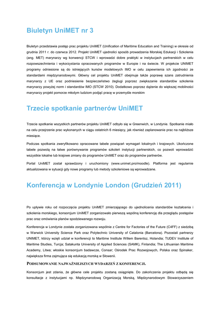 Biuletyn UniMET nr 3 Biuletyn przedstawia postęp prac projektu UniMET (Unification of Maritime Education and Training) w okresie od grudnia 2011 r. do czerwca 2012. Projekt UniMET ujednolici sposób prowadzenia Morskiej Edukacji i Szkolenia (ang. MET) marynarzy wg konwencji STCW i wprowadzi dobre praktyki w instytucjach partnerskich w celu rozpowszechnienia i wykorzystania opracowanych programów w Europie i na świecie. W projekcie UNIMET programy odniesione są do istniejących kursów modelowych IMO w celu zapewnienia ich zgodności ze standardami międzynarodowymi. Główny cel projektu UniMET obejmuje także poprawę szans zatrudnienia marynarzy z UE oraz podniesienie bezpieczeństwo żeglugi poprzez zwiększanie standardów szkolenia marynarzy powyżej norm i standardów IMO (STCW 2010). Dodatkowo poprzez dążenie do większej mobilności marynarzy projekt pomorze młodym ludziom podjąć pracę w przemyśle morskim Trzecie spotkanie partnerów UniMET Trzecie spotkanie wszystkich partnerów projektu UniMET odbyło się w Greenwich, w Londynie. Spotkanie miało na celu przejrzenie prac wykonanych w ciągu ostatnich 6 miesięcy, jak również zaplanowanie prac na najbliższe miesiące. Podczas spotkania zweryfikowano opracowane tabele powiązań wymagań lokalnych i krajowych. Ukończone tabele pozwolą na łatwe porównywanie programów szkoleń instytucji partnerskich, co pozwoli wprowadzić wszystkie lokalne lub krajowe zmiany do programów UniMET oraz do programów partnerów. Portal UniMET został sprawdzony i uruchomiony (www.unimet.pro/moodle). Platforma jest regularnie aktualizowana w sytuacji gdy nowe programy lub metody szkoleniowe są wprowadzane. Konferencja w Londynie London (Grudzień 2011) Po upływie roku od rozpoczęcia projektu UniMET zmierzającego do ujednolicenia standardów kształcenia i szkolenia morskiego, konsorcjum UniMET zorganizowało pierwszą wspólną konferencję dla przeglądu postępów prac oraz omówienia planów spodziewanego rozwoju. Konferencja w Londynie została zorganizowana wspólnie z Centre for Factories of the Future (C4FF) z siedzibą w Warwick University Science Park oraz Polytechnic University of Catalonia (Barcelona). Pozostali partnerzy UNIMET, którzy wzięli udział w konferencji to Maritime Institute Willem Barentsz, Holandia; TUDEV Institute of Maritime Studies, Turcja; Satakunta University of Applied Sciences (SAMK), Finlandia; The Lithuanian Maritime Academy, Litwa; włoskie konsorcjum badawcze, Consar; Ośrodek Prac Rozwojowych, Polska oraz Spinaker, największa firma zajmująca się edukacją morską w Słowenii. PODSUMOWANIE NAJWAŻNIEJSZYCH WYDARZEŃ Z KONFERENCJI. Konsorcjum jest zdania, że główne cele projektu zostaną osiągnięte. Do zakończenia projektu odbędą się konsultacje z instytucjami np. Międzynarodową Organizacją Morską, Międzynarodowym Stowarzyszeniem Uczelni Morskich, Europejską Agencją ds. Bezpieczeństwa na Morzu, kilkoma stowarzyszeniami i izbami morskimi oraz z wieloma uczelniami morskimi. Profesor Reza Ziarati uzasadnił konieczność międzynarodowej współpracy w szkoleniu, która jest niezbędna do poprawy bezpieczeństwa morskiego. Odnosząc się do raportu z 2004 roku wykazującego na fakt, iż 25% floty światowej uczestniczyło w aż 50% wypadkach morskich, natomiast 25% najbezpieczniejszych statków spowodowało tylko 7% wszystkich wypadków. Inne badania wykazały, że poprawa jakości floty światowej do poziomu 25% najbezpieczniejszych statków może spowodować 72% zmniejszenie wypadków. Jeżeli jedne bandery uznawane są za bezpieczne to musi być jakiś powód takiego uznania, jeżeli inne bandery odnotowują więcej wypadków to też musi być jakiś powód tej sytuacji powiedział profesor dr Ziarati. Zaczęliśmy więc patrzeć na problemy z różnych krajów, przeanalizowaliśmy raporty i okazało się, że niektóre zmiany muszą zostać wprowadzone w zakresie konwencji STCW i to pomimo znacznych zmian STCW ustalonych przez IMO w 2010 r. Profesor Ziarati stwierdził, że wiele nieprawidłowości nadal istnieje. Podkreślił szereg promowanych przez UniMET projektów, które zwracają uwagę na niedociągnięcia w standardach kształcenia. Oto niektóre z kluczowych projektów: MARTEL-to projekt przygotowany przez partnerów UniMET wspólnie z takimi instytucjami, jak: Glasgow College of Nautical Studies oraz University of Strathclyde. Projekt ma na celu rozwiązania problemu posiadania niepełnych kompetencji języka angielskiego wśród marynarzy. Martel zawiera zestaw testów dostępnych online, które oceniają znajomość morskiego języka angielskiego. Testy przeznaczone są dla kilku poziomów, obejmujących wszystkie stopnie oficerskie: stopień 1 – przeznaczony jest dla kadetów, stopień 2 – przeznaczony jest dla oficerów i stopień 3 przeznaczony jest dla starszych oficerów. Stopnie 2 i 3 zawierają oddzielne testy dla oficerów pokładowych oraz mechaników. Opracowano nowy, ulepszony ustny test, który jest formą egzaminowania twarzą w twarz. Planowane jest także przygotowanie testów dla marynarzy pokładowych i maszynowych. Zbieżnym do projektu Martel jest projekt o nazwie CAPTAINS, który jest internetowym zestawem kursów opartych na rzeczywistych sytuacjach, które koncentrują się na aspektach funkcjonalnych komunikacji w morskim języku angielskim. UniMET obejmuje obecnie także projekt o nazwie SURPASS, który oferuje szkolenia w zakresie automatyzacji statku. Został on opracowany przez konsorcjum partnerów oraz ekspertów z Plymouth University i Akademii Morskiej w Szczecinie, w celu przezwyciężenia dwóch problemów dotyczących załóg: pierwszy dotyczy zrozumienia właściwości zautomatyzowanych systemów i ich ograniczeń, drugi przygotowania na sytuacje awarii automatyki statkowej, aby załogi mogły w takiej sytuacji korzystać z alternatywnych systemów. SURPASS zmierza do rozwiązania tych problemów. Narzędzie jest dost