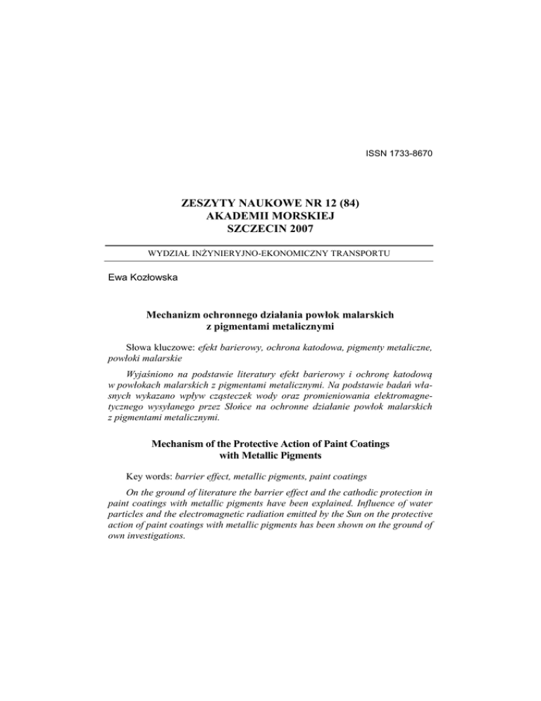 ISSN 1733-8670 ZESZYTY NAUKOWE NR 12 (84) AKADEMII MORSKIEJ SZCZECIN 2007 WYDZIAŁ INŻYNIERYJNO-EKONOMICZNY TRANSPORTU Ewa Kozłowska Mechanizm ochronnego działania powłok malarskich z pigmentami metalicznymi Słowa kluczowe: efekt barierowy, ochrona katodowa, pigmenty metaliczne, powłoki malarskie Wyjaśniono na podstawie literatury efekt barierowy i ochronę katodową w powłokach malarskich z pigmentami metalicznymi. Na podstawie badań własnych wykazano wpływ cząsteczek wody oraz promieniowania elektromagnetycznego wysyłanego przez Słońce na ochronne działanie powłok malarskich z pigmentami metalicznymi. Mechanism of the Protective Action of Paint Coatings with Metallic Pigments Key words: barrier effect, metallic pigments, paint coatings On the ground of literature the barrier effect and the cathodic protection in paint coatings with metallic pigments have been explained. Influence of water particles and the electromagnetic radiation emitted by the Sun on the protective action of paint coatings with metallic pigments has been shown on the ground of own investigations. Ewa Kozłowska Wprowadzenie Powłoki malarskie z pigmentami metalicznymi dają bardzo dobre odizolowanie chronionego metalu od czynników agresywnych, powodujących korozję. Wykazują też dobrą i stabilną w czasie przyczepność do metalowego podłoża. Farby do wytwarzania takich powłok oparte są na spoiwach charakteryzujących się dużą szczelnością. Są to spoiwa poliwinylowe, chlorokauczukowe, epoksydowo-smołowe oraz epoksydowe typu mastic [1]. Do pigmentowania tego rodzaju farb używane są pigmenty płatkowe takich metali i stopów, jak: cynk, aluminium, nikiel, miedź, błyszcz żelaza, stal nierdzewna, brąz. Wizualne właściwości pigmentów metalicznych są determinowane sposobem ich otrzymywania i decydują o ich przeznaczeniu. Przykładowo płatki niklowe stosowane są w dekoracyjnych farbach z połyskiem metalicznym o jaskrawej żółtawej barwie [2]. Do bardzo jasnych farb dodawane są płatki aluminiowe [2]. Natomiast z dodatkiem czarnych płatków cynkowych produkowane są czarne farby na części samochodowe lub śruby [3]. Mechanizm ochronnego działania powłok malarskich z pigmentami metalicznymi polega głównie na działaniu barierowym oraz ochronie katodowej. Powłoki malarskie z pigmentami metalicznymi zaliczane są więc do powłok typu barierowego. W niniejszym artykule autorka na podstawie własnych badań wykazuje, że cząsteczki wody oraz promieniowanie elektromagnetyczne w zakresie podczerwieni (IR), widzialnym oraz nadfioletu (UV) mają wpływ na ochronne działanie powłok malarskich z pigmentami metalicznymi. Celem artykułu jest wyjaśnienie mechanizmu ochronnego działania powłok malarskich z pigmentami metalicznymi. 1. Działanie barierowe oraz ochrona katodowa Znana od dawna elektrochemiczna teoria korozji metali dobrze wyjaśnia ochronne działanie powłok malarskich [4]. Zgodnie z tą teorią na granicy faz metal/elektrolit zachodzi reakcja anodowa: Fe Fe 2e (1) oraz katodowa: 2 H 2O O2 4e 4 OH (2) W przypadku przestrzennego rozdzielenia reakcji anodowej i katodowej na powierzchni metalu pomiędzy katodą i anodą będzie przepływał prąd elektryczny, którego wartość określa szybkość korozji. W praktyce oprócz reakcji kato96 Mechanizm ochronnego działania powłok malarskich z pigmentami metalicznymi dowej (2), zachodzą bardziej groźne oddziaływania różnych jonów (chlorkowych, siarczynowych, siarczanowych) występujących w elektrolicie. Działanie barierowe powłok malarskich polega na minimalizowaniu dyfuzji wody i tlenu, a przede wszystkim jonów z elektrolitu do powierzchni chronionego metalu. Utrzymanie dyfuzji tych substratów na odpowiednio niskim poziomie pozwala kontrolować przebieg reakcji katodowej (2). Powłoka malarska nie jest w stanie całkowicie hamować dyfuzji wody i tlenu. Przykładowo szybkość dyfuzji wody przez spoiwo epoksydowe wynosi 510 mg/cm2/rok, a przez spoiwo chlorokauczukowe – 365 mg/cm2/rok [1]. Natomiast szybkość dyfuzji tlenu przez spoiwo epoksydowe wynosi 2,7 mg/cm2/rok, a przez spoiwo chlorokauczukowe – 0,8 mg/cm2/rok [1]. Zastosowanie pigmentów metalicznych w postaci płatkowej takich, jak: aluminium, cynk, nikiel, błyszcz żelaza zwiększa działanie barierowe powłoki malarskiej. Płatki cynku, niklu, aluminium w znacznym stopniu ograniczają dyfuzję tlenu, wody i jonów z elektrolitu [1, 2, 3]. Natomiast błyszcz żelaza daje znaczne ograniczenie dyfuzji tlenu i jonów, lecz wykazuje większą chłonność wody, która gromadzi się przy cząsteczkach błyszczu żelaza [5]. Nie pogarsza to jednak właściwości ochronnych powłok malarskich z tym pigmentem. Wszystkie powłoki malarskie z pigmentami metalicznymi w postaci płatkowej dają dodatkowy efekt barierowy. Odpowiednie ułożenie płatków pigmentów metalicznych w tych powłokach stanowi zaporę dla cząsteczek tlenu, wody oraz jonów. Powłoki te należą do najlepszych powłok malarskich typu barierowego. Ochrona katodowa polega na utrzymaniu wystarczająco ujemnego potencjału elektrochemicznego metalu chronionego (np. żelaza), żeby nie dopuścić do reakcji anodowej [1], czyli do wychodzenia dodatnio naładowanych jonów metalu z sieci krystalicznej na granicy faz metal / elektrolit. W celu zmiany potencjału metalu chronionego w kierunku wartości ujemnych należy dostarczyć pewną ilość elektronów. Można to zrobić przez zastosowanie pigmentów metalicznych, zewnętrznego źródła prądu lub połączenie z metalem bardziej elektroujemnym. Pigmenty metaliczne zawierają wolne elektrony i mogą chronić metalowe podłoże katodowe, gdy spełnione są następujące warunki: a) pigment jest metalem bardziej elektroujemnym niż metalowe podłoże, by zapobiec przepływowi elektronów w przeciwnym kierunku; b) cząsteczki pigmentu są w metalicznym i elektrycznym kontakcie ze sobą oraz chronionym podłożem, bo w innym przyp