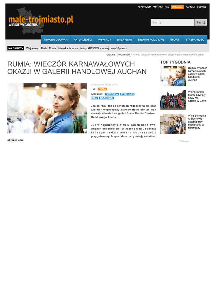 O PORTALU KONTAKT FAQ REKLAMA KARIERA COOKIES Szukaj STRONA GŁÓWNA NA SKRÓTY AKTUALNOŚCI WYWIADY ROZRYWKA KRONIKI POLICYJNE Szukaj SPORT STREFA VIDEO Wejherowo Reda Rumia Mieszkania w Kamienicy ART ECO w nowej cenie! Sprawdź! Główna / Aktualności / Rumia: Wieczór karnawałowych okazji w galerii handlowej Auchan RUMIA: WIECZÓR KARNAWAŁOWYCH OKAZJI W GALERII HANDLOWEJ AUCHAN TOP TYGODNIA Rumia: Wieczór karnawałowych okazji w galerii handlowej Auchan Utworzono: 05 stycznia 2015 Typ: RUMIA Kategorie: ROZRYWKA DZIEŃ ŻYCIE NA CO NAJNOWSZE Jak co roku, tuż po świętach rozpoczyna się czas wielkich wyprzedaży. Karnawałowe obniżki cen czekają również na gości Portu Rumia Centrum Handlowego Auchan. Już w najbliższy piątek w galerii handlowej Auchan odbędzie się "Wieczór okazji", podczas którego będzie można skorzystać z przygotowanych specjalnie na tę okazję rabatów i obniżek cen. Wejherowskie Morsy powitały nowy rok kąpielą w Gdyni Willa Stokrotka w Zibertowie ostatnie trzy mieszkania w sprzedaży REKLAMA "Wieczór okazji" przygotowano z myślą o wszystkich, którzy chcieliby uzupełnić swoją zimową garderobę lub zakupić kreację na karnawałową zabawę. W najbliższy piątkowy wieczór butiki Portu Rumia Centrum Handlowego Auchan przygotowały dla gości galerii liczne rabaty i atrakcyjne promocje. W wybranych sklepach galerii po niespotykanie niskich cenach, będzie można zakupić kreacje z jesienno-zimowej kolekcji. Promocyjne ceny, to nie jedyna atrakcja, jaka czeka tego wieczoru na klientów galerii handlowej Auchan. Ci, którzy najszybciej "złowią" okazję, będą mieli dodatkowo szansę na zdobycie prezentów, przygotowanych specjalnie na ten wieczór. Wystarczy, że w godzinach 18.00 - 21.00 zrobią zakupy w butikach galerii handlowej. Za zebranie paragonów potwierdzających zakupy za minimum 100 złotych, będzie można otrzymać kubek termiczny, a za zakupy za minimum 200 złotych ręcznik kąpielowy. Ci, którzy zrobią zakupy za minimum 300 złotych, otrzymają zestaw akcesoriów kuchennych do spaghetti. Ducha karnawałowej rywalizacji obudzi fakt, że podczas zabawy obowiązuje zasada "kto pierwszy, ten lepszy". O zdobyciu prezentów decyduje zatem kolejność zgłoszeń, a ich liczba jest ograniczona. Pierwszy w nowym roku "Wieczór okazji" odbędzie się w piątek 9 stycznia w Porcie Rumia Centrum Handlowym Auchan przy ulicy Grunwaldzkiej 108 w Rumi, w godzinach 18.00 - 21.00. Drukuj Podziel się KOMENTARZE REKLAMA POGODA W MTK Dziś: 2° -2° przeważnie słonecznie Wtorek: 0° -5° przeważnie pochmurno Środa: -2° -4° przeważnie pochmurno REKLAMA NOTOWANIA WALUT Data: 26 września 2014 USD 3,28 0,07% AUD 2,88 0,42% EUR 4,18 0,05% CHF 3,46 -0,02% GBP 5,35 -0,03% JPY 3,01 -0,23% CZK 0,15 -1,25% AKTUALNOŚCI Strona główna Aktualności Wywiady Rozrywka Kroniki Policyjne Sport Strefa Video NA SKRÓTY Wejherowo Reda Rumia Mieszkania w Kamienicy ART ECO w nowej cenie! Sprawdź! INFORMACJE O portalu Kontakt FAQ Reklama Kariera Cookies Korzystamy z plików cookies i umożliwiamy zamieszczanie ich osobom trzecim. Pliki cookie pozwalają na poznanie twoich preferencji na podstawie zachowań w serwisie. Uznajemy, że jeżeli kontynuujesz korzystanie z Copyrights 2013 male-trojmiasto.pl serwisu, wyrażasz na to zgodę. (x) Zamknij