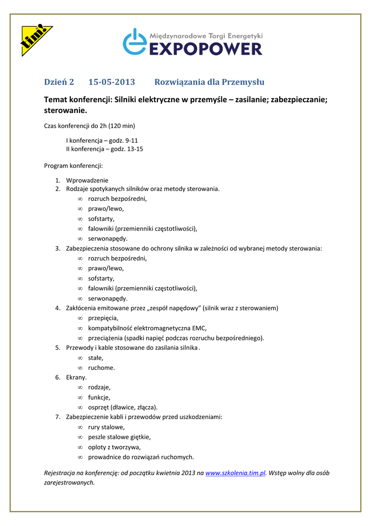 Dzień 2 15-05-2013 Rozwiązania dla Przemysłu Temat konferencji: Silniki elektryczne w przemyśle – zasilanie; zabezpieczanie; sterowanie. Czas konferencji do 2h (120 min) I konferencja – godz. 9-11 II konferencja – godz. 13-15 Program konferencji: 1. Wprowadzenie 2. Rodzaje spotykanych silników oraz metody sterowania. • rozruch bezpośredni, • prawo/lewo, • sofstarty, • falowniki (przemienniki częstotliwości), • serwonapędy. 3. Zabezpieczenia stosowane do ochrony silnika w zależności od wybranej metody sterowania: • rozruch bezpośredni, • prawo/lewo, • sofstarty, • falowniki (przemienniki częstotliwości), • serwonapędy. 4. Zakłócenia emitowane przez „zespół napędowy” (silnik wraz z sterowaniem) • przepięcia, • kompatybilność elektromagnetyczna EMC, • przeciążenia (spadki napięć podczas rozruchu bezpośredniego). 5. Przewody i kable stosowane do zasilania silnika . • stałe, • ruchome. 6. Ekrany. • rodzaje, • funkcje, • osprzęt (dławice, złącza). 7. Zabezpieczenie kabli i przewodów przed uszkodzeniami: • rury stalowe, • peszle stalowe giętkie, • oploty z tworzywa, • prowadnice do rozwiązań ruchomych. Rejestracja na konferencję: od początku kwietnia 2013 na www.szkolenia.tim.pl. Wstęp wolny dla osób zarejestrowanych.